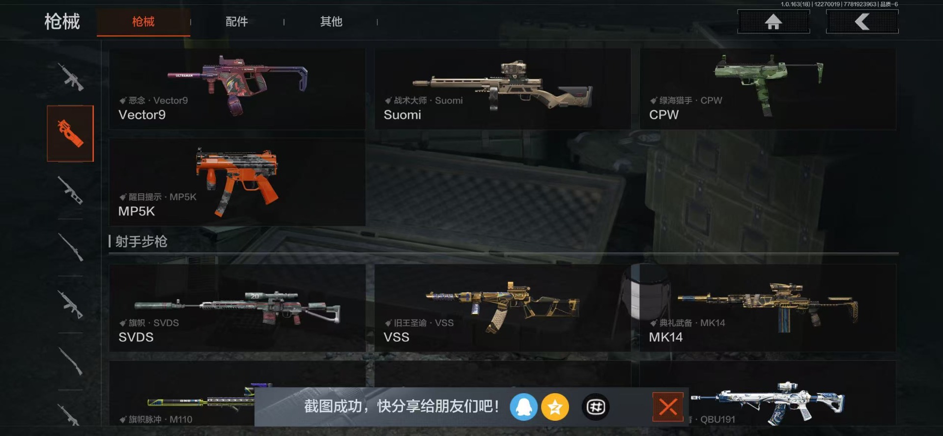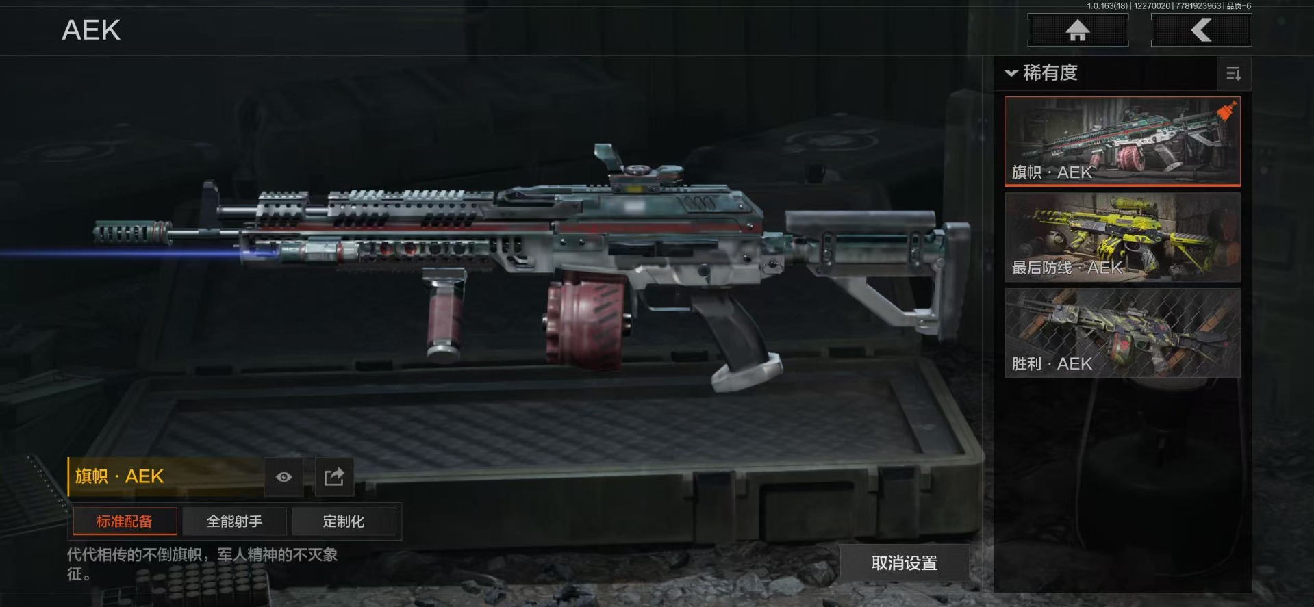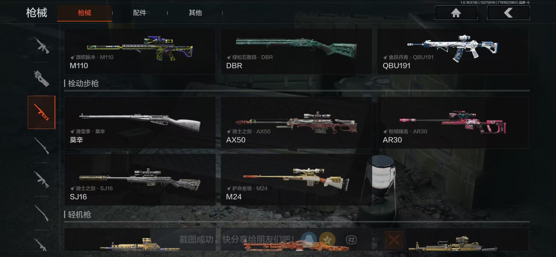 AQ393安Q-可二次-仓库价值:2.2M 科恩币: 525170 3刀皮: S-07折刀 工兵铲 来战·开山刀 金枪: 伦琴幻影· FAL 骑士之剑·VSS 武器: 来战·AKM 自喷网络·H416 北国内卫·MDR 鱼跃丹青·AK102 战术大师·AK74N 骑士之剑·AKS74U 火力倾泻·AUG 战术大师·AEK 幻象·FAMAS 典礼武器·MCX 利齿风暴·MPX 典礼武器·14
