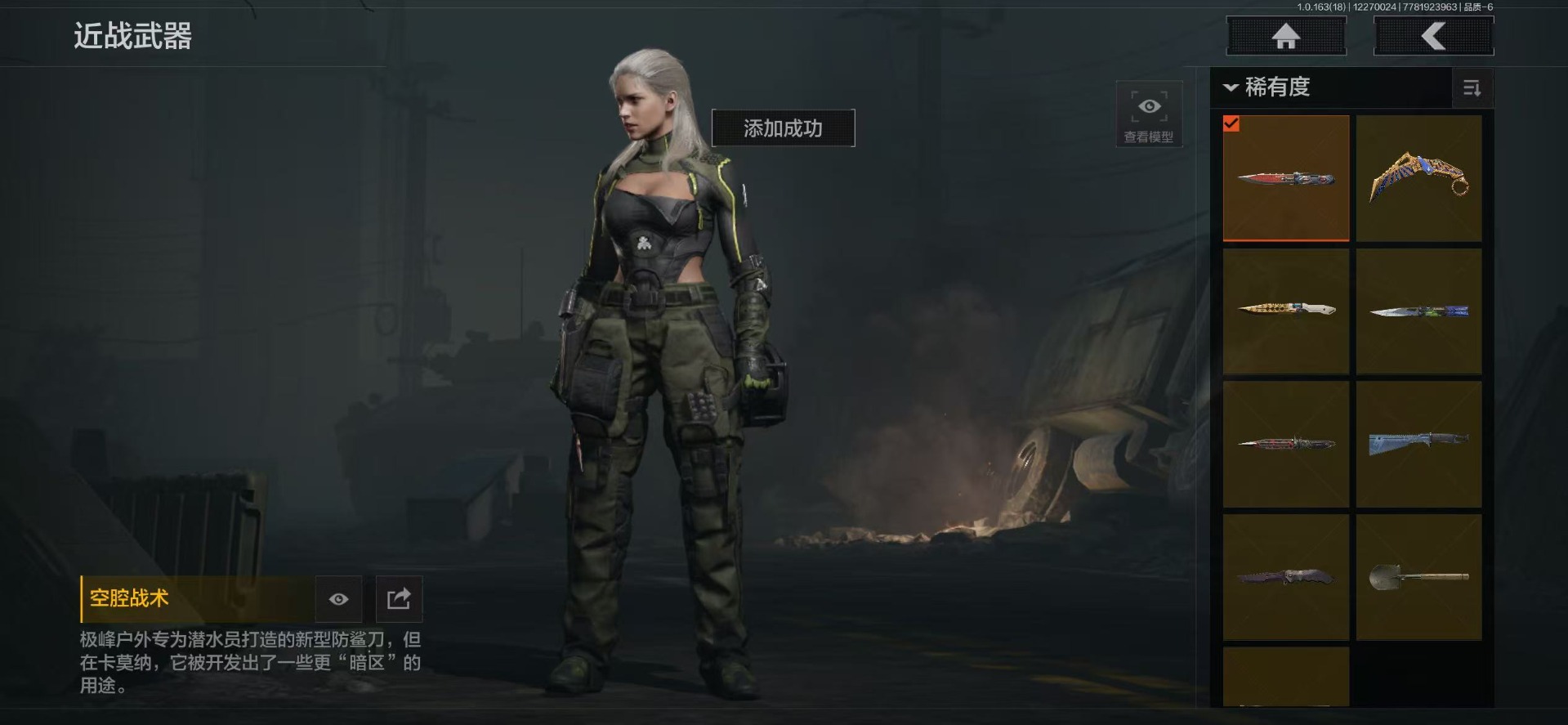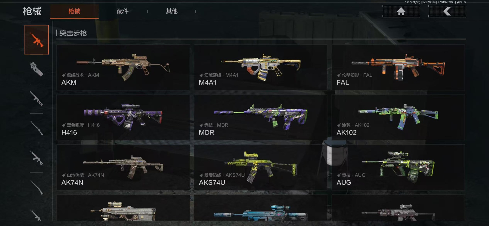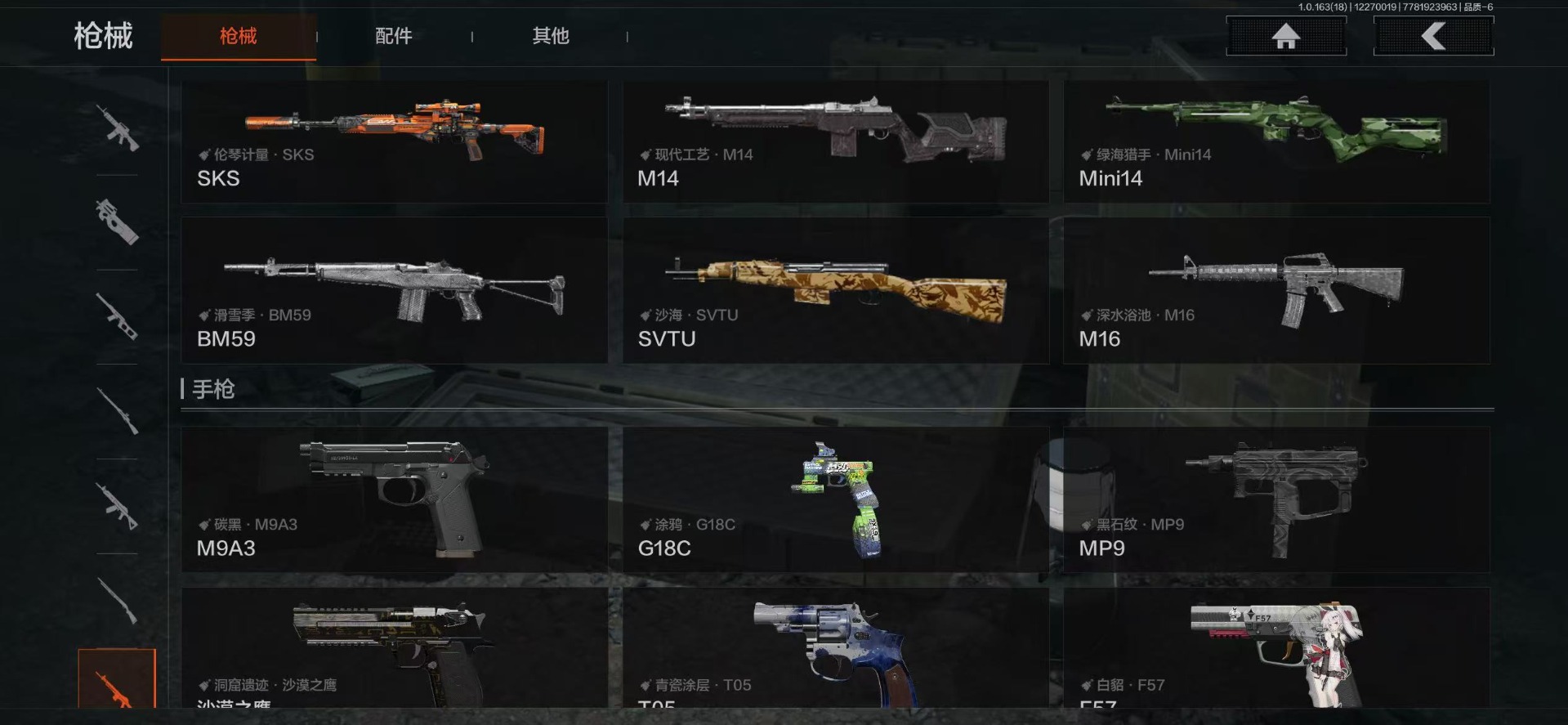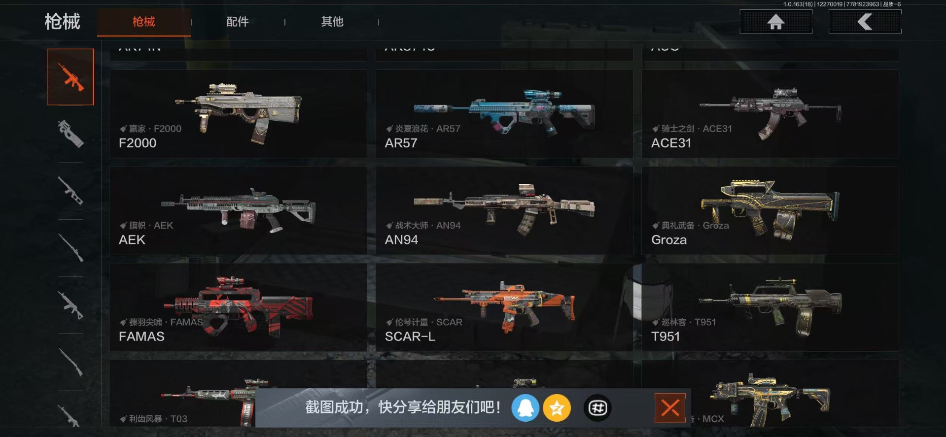 AQ393安Q-可二次-仓库价值:2.2M 科恩币: 525170 3刀皮: S-07折刀 工兵铲 来战·开山刀 金枪: 伦琴幻影· FAL 骑士之剑·VSS 武器: 来战·AKM 自喷网络·H416 北国内卫·MDR 鱼跃丹青·AK102 战术大师·AK74N 骑士之剑·AKS74U 火力倾泻·AUG 战术大师·AEK 幻象·FAMAS 典礼武器·MCX 利齿风暴·MPX 典礼武器·14
