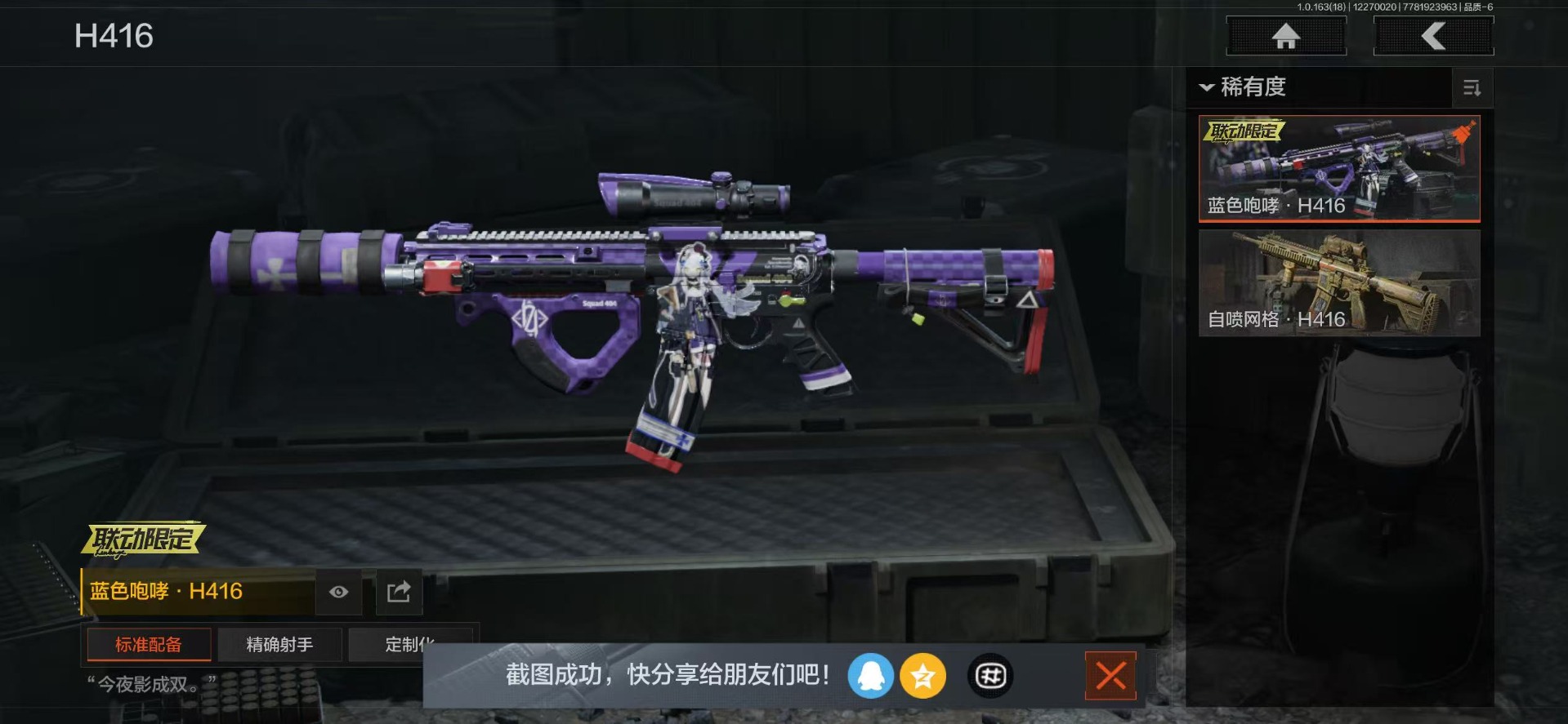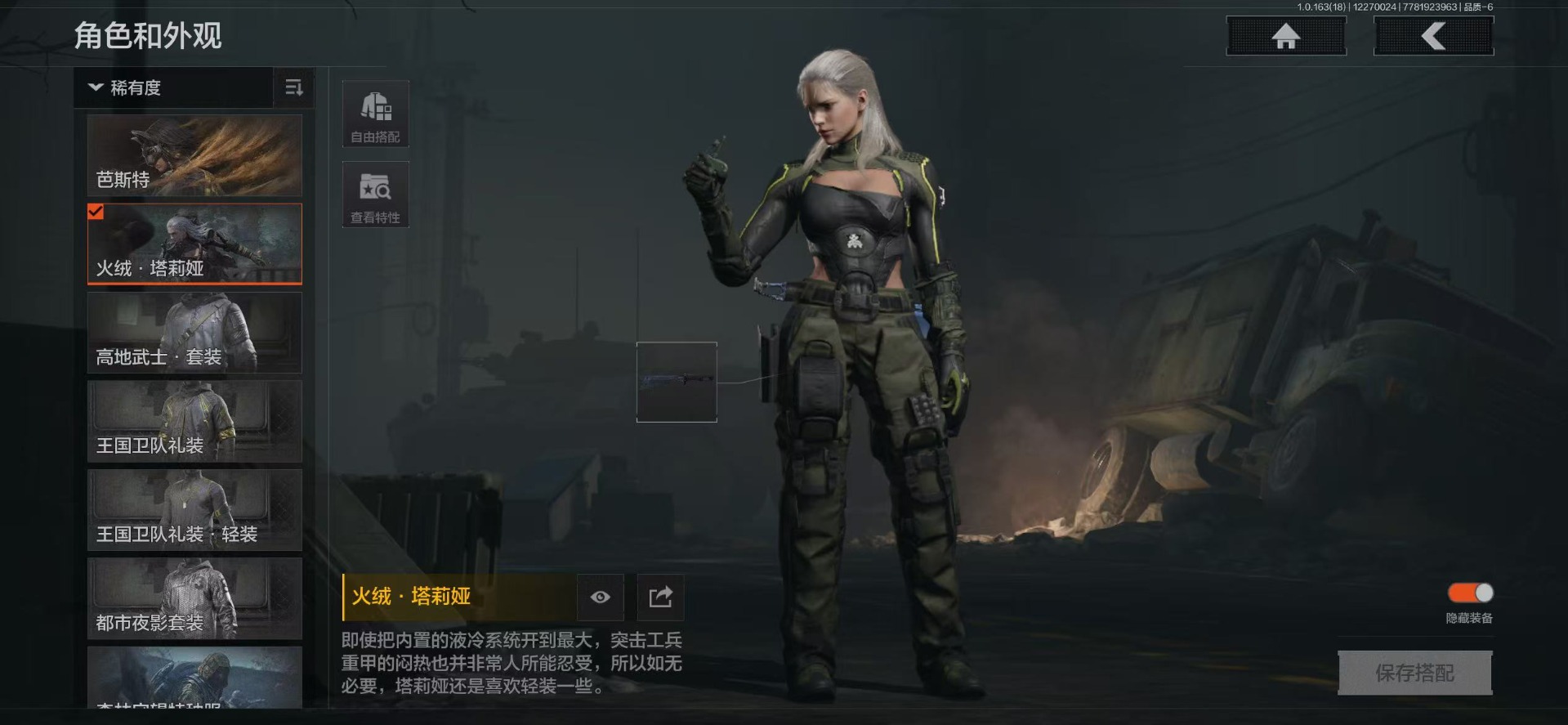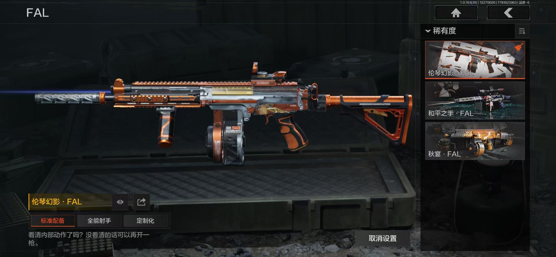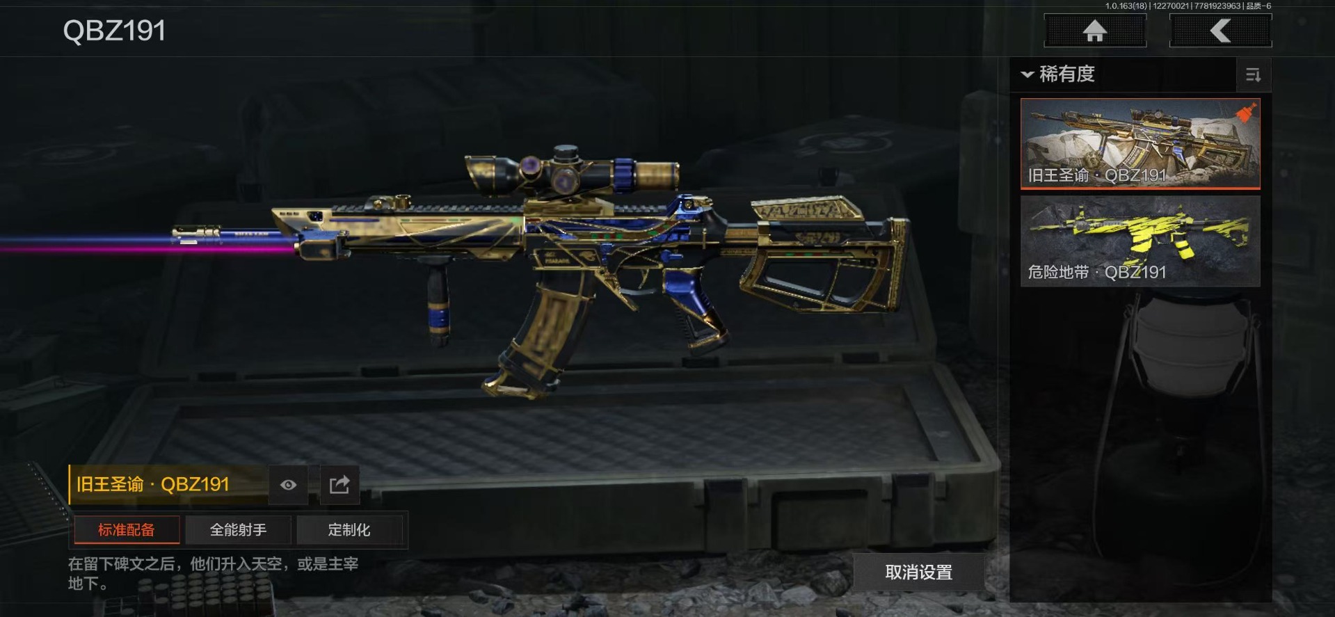 库存价值25.7 9近战武器 1金套装 10金枪皮 可修改实名 【柯恩币数量】2917k【角色装扮(金)】火绒·塔莉娅【近战武器】空腔战术,苍穹利爪,赢家匕首,工兵铲,来战·开山刀,涂鸦利刃,胜利军刀,霜狼生存刀,野战折刀【金色枪皮】利齿风暴·MPX,浮鳞影青·QBZ192,伦琴幻影·FAL,旧王圣谕·QBZ191,旧王圣谕·VSS,战术大师·AN94,包络战术·AKM,骑士之剑·AX50,旗帜·AEK,蓝色咆哮·H416【紫色枪皮】鱼跃丹青·QBU191,竞技·MDR,利齿风暴·T03,火绒·AK12,竞技·AUG,最后防线·AEK,最后防线·AKS74U,赢家·F2000,伦琴计量·SCAR,旗帜·SVDS,火力倾泻·AKM,火力倾泻·RPD,旗帜脉冲·USAS12,战术大师·Suomi,旗帜脉冲·M110,典礼武备·GROZA,伦琴计量·SKS,幻域莎绫·M4A1,典礼武备·S12K,典礼武备·M249,典礼武备·14,典礼武备·MCX,秘域鎏金·RPK16,粉绒臻选·AR30,粉绒臻选·AN94,神锋·Vector45,掌中盾·MP5,白貂·F57,骑士之剑·SJ16【角色装扮(紫)】高地武士套装,王国卫队礼装,都市夜影套装