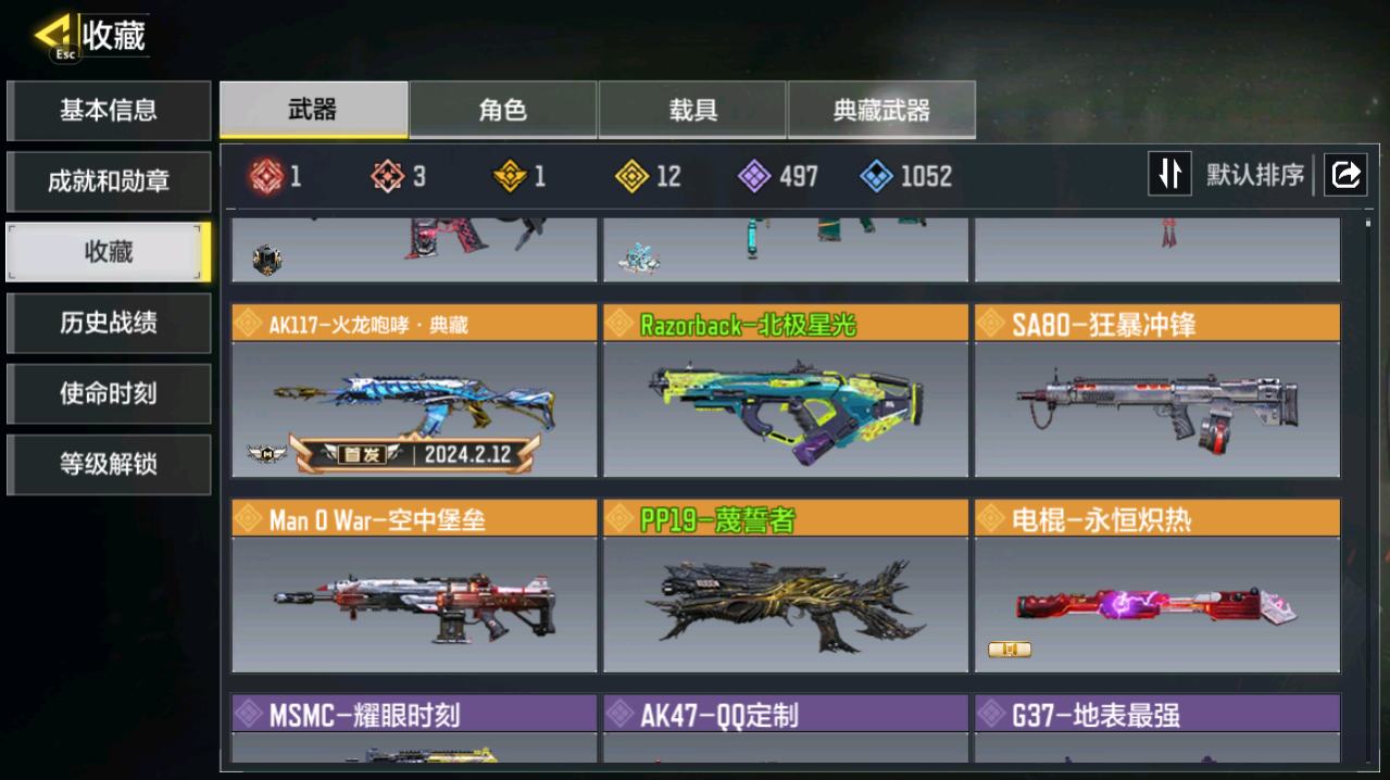 AQY645无二次QQ皇冠1神话 AK117-熔岩 10传说 CR56-回音律动 电棍-永恒炽热 AK47-火箭炮 飞翼浮游炮-v高达 M4-皇家黑魂 AKS 74U-神灯灵愿 RPD--路悠扬 DLQ33-狂热祈愿 FFAR1-星彩乐手 Locus-红色彗星