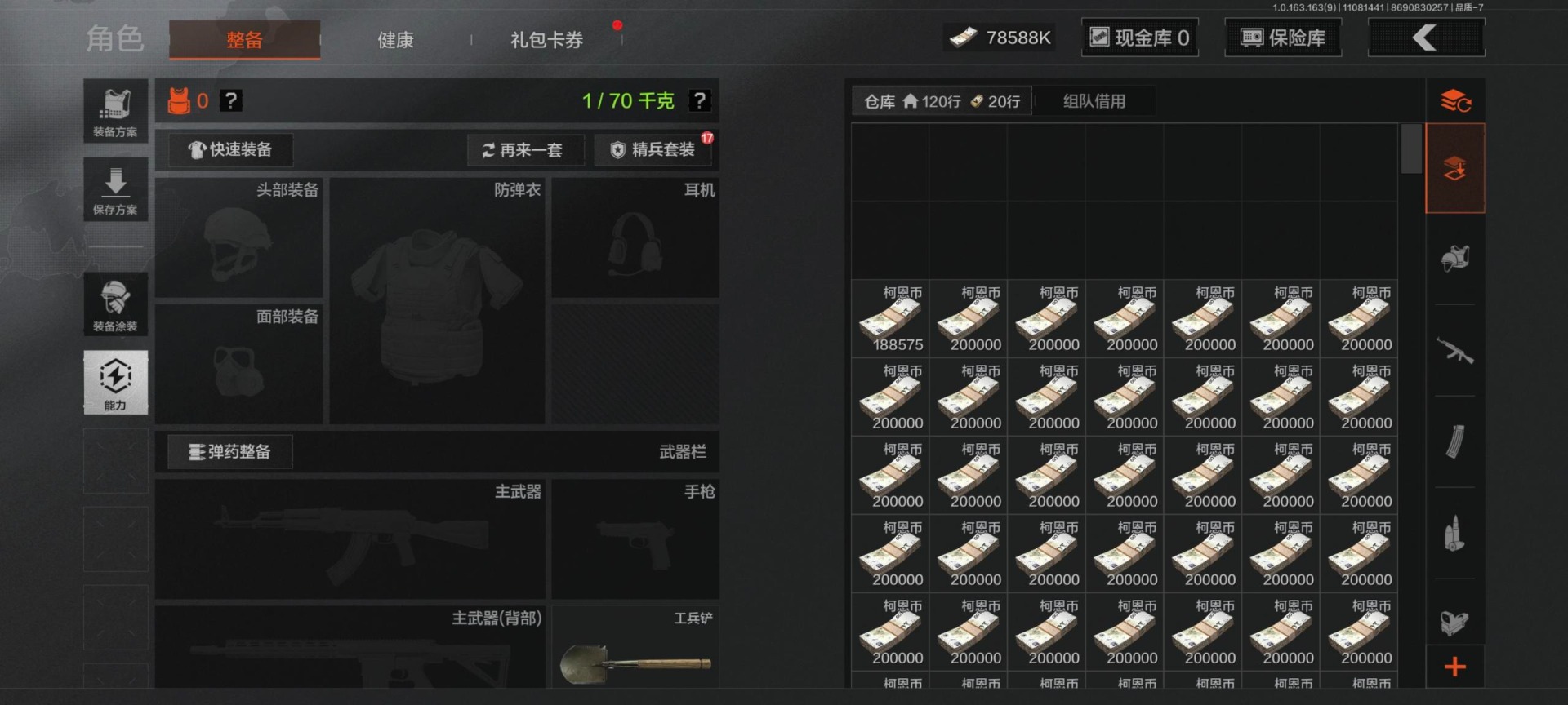 [13630734]库存价值102.7 6近战武器 2金套装 10金枪皮 可修改实名 【柯恩币数量】:3180【角色装扮(金)】:绕指玉鸾·战术甲胄,使徒·欧瑞恩【近战武器】:三尺万仞·战术剑,工兵铲,来战·开山刀,涂鸦利刃,冬日冰镐,急袭弯刀【金色枪皮】:利齿风暴·MPX,告丧夜曲·AUG,告丧夜曲·AR57,浮鳞影青·QBZ192,旧王圣谕·QBZ191,旧王圣谕·VSS,骑士之剑·VSS,长缨风掣·Vector9,长缨风掣·RPK16,长缨风掣·AX50【紫色枪皮】:棱光裂变·AK102,竞技·MDR,骑士之剑·AKS74U,炎夏浪花·H416,快乐游戏·MPX,骤羽尖啸·M4A1,秘域鎏金·RPK16,猩红羽翼·VSS,来战·AKM,德尔塔小队·M4A1,玄戈梨花·MPX,缟兵玄墨·VSS,缟兵玄墨·MPX,07式林地迷彩·QBZ191,玄戈梨花·VSS,涂绘猎人·AR57,战术大师·AK74N【角色装扮(紫)】:金狮护身·转运套装,台风IV竞技运动服