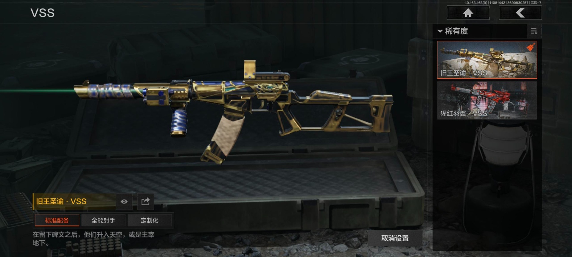 商品描述:[13783114]库存价值78.6 1近战武器 4金枪皮 可修改实名 【柯恩币数量】:78588【近战武器】:工兵铲【金色枪皮】:利齿风暴·MPX,旗帜·AEK,旧王圣谕·QBZ191,旧王圣谕·VSS【紫色枪皮】:旗帜·SVDS,火力倾泻·AUG,骤羽尖啸·M4A1,典礼武备·GROZA,秘域鎏金·RPK16,战术大师·SJ16,战术大师·SKS,典礼武备·MCX,利齿风暴·T03,利齿风暴·T79,猩红羽翼·VSS,骤羽尖啸·莫辛,鱼跃丹青·T85【角色装扮(紫)】:都市夜影套装,王国卫队礼装,使徒·瑞文