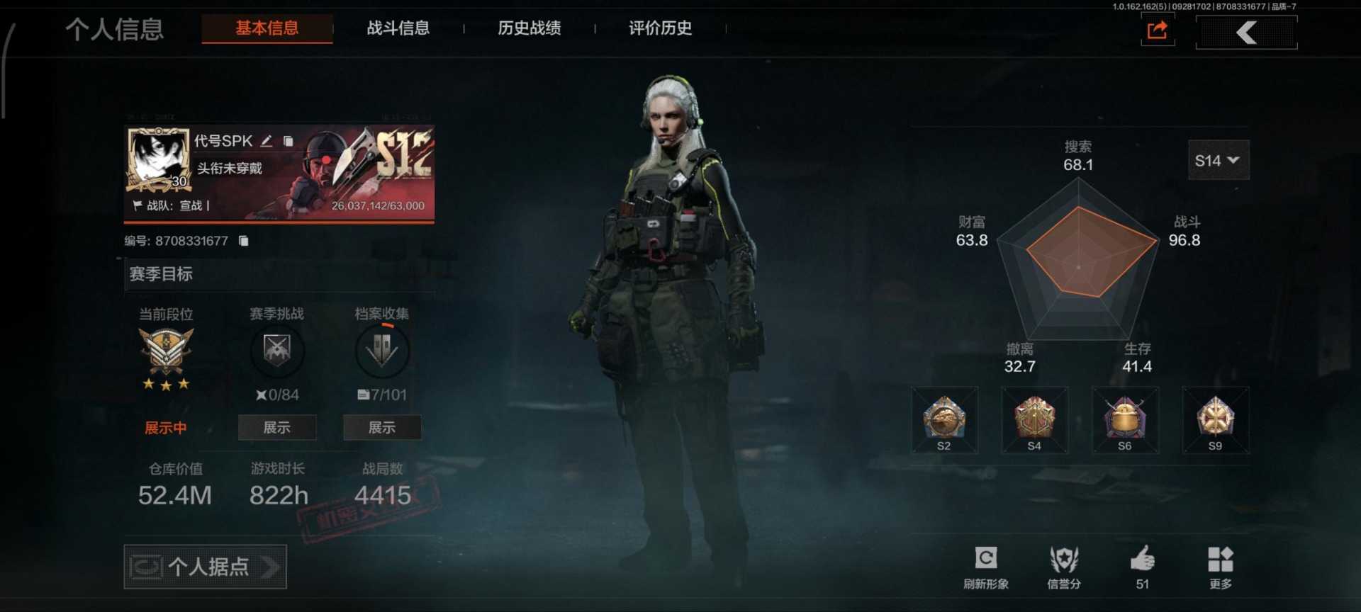 商品描述:[13803687]库存价值52.4 5近战武器 1金套装 3金枪皮 可修改实名 【柯恩币数量】:5307【角色装扮(金)】:火绒·塔莉娅【近战武器】:突击匕首,来战·开山刀,工兵铲,裁决手杖剑,急袭弯刀【金色枪皮】:旗帜·AEK,棱光裂变·QBU191,蓝色咆哮·H416【紫色枪皮】:火绒·AK12,饰金·MP5,旗帜·SVDS,旗帜·RPK16,棱光裂变·ACE31,棱光裂变·AK74N,棱光裂变·AKM,火力倾泻·AUG,最后防线·AEK,骑士之剑·14,禁止访问·UMP45,无畏·USAS12,快乐游戏·M110,猩红羽翼·VSS,德尔塔小队·M4A1,雪山之王·MPX,秩序·G18C【角色装扮(紫)】:鎏金街头套装,都市夜影套装