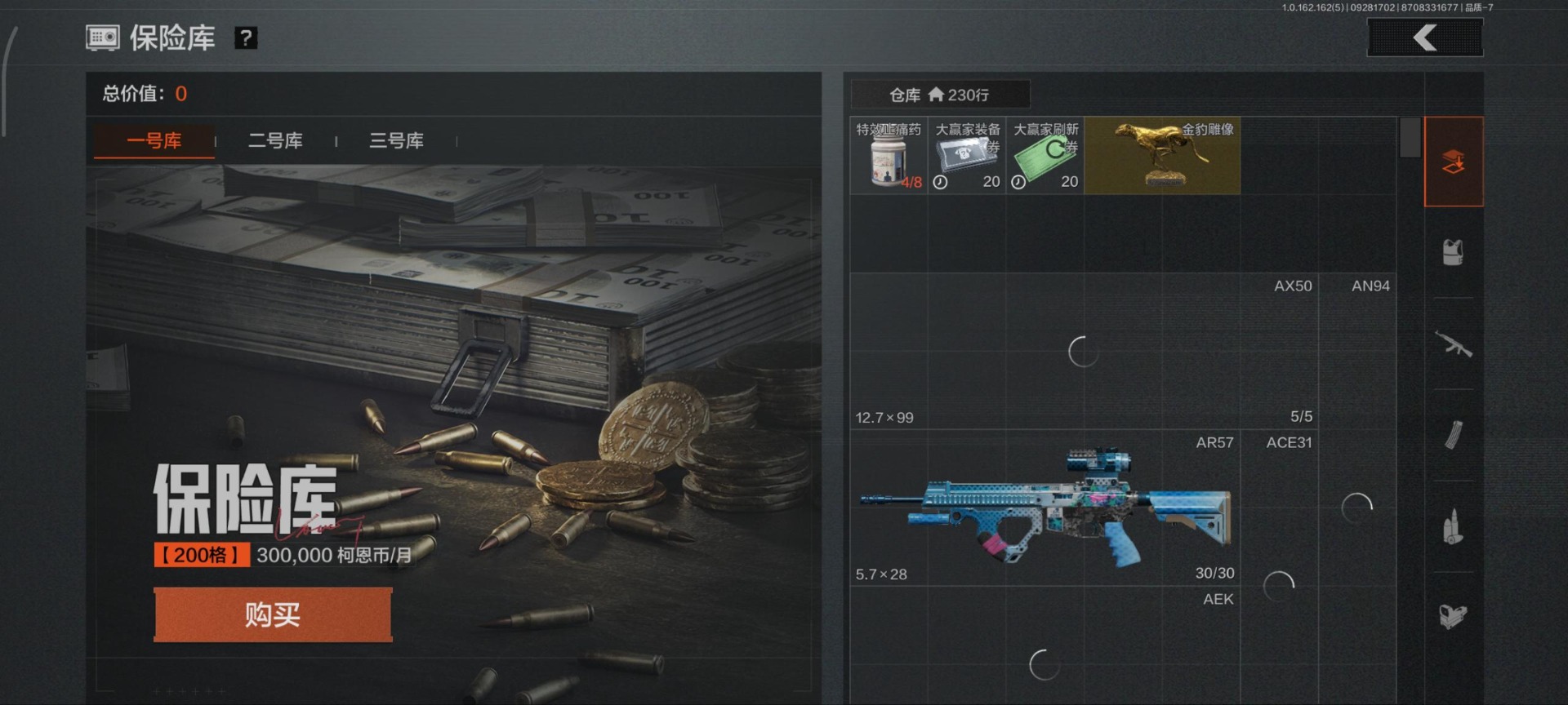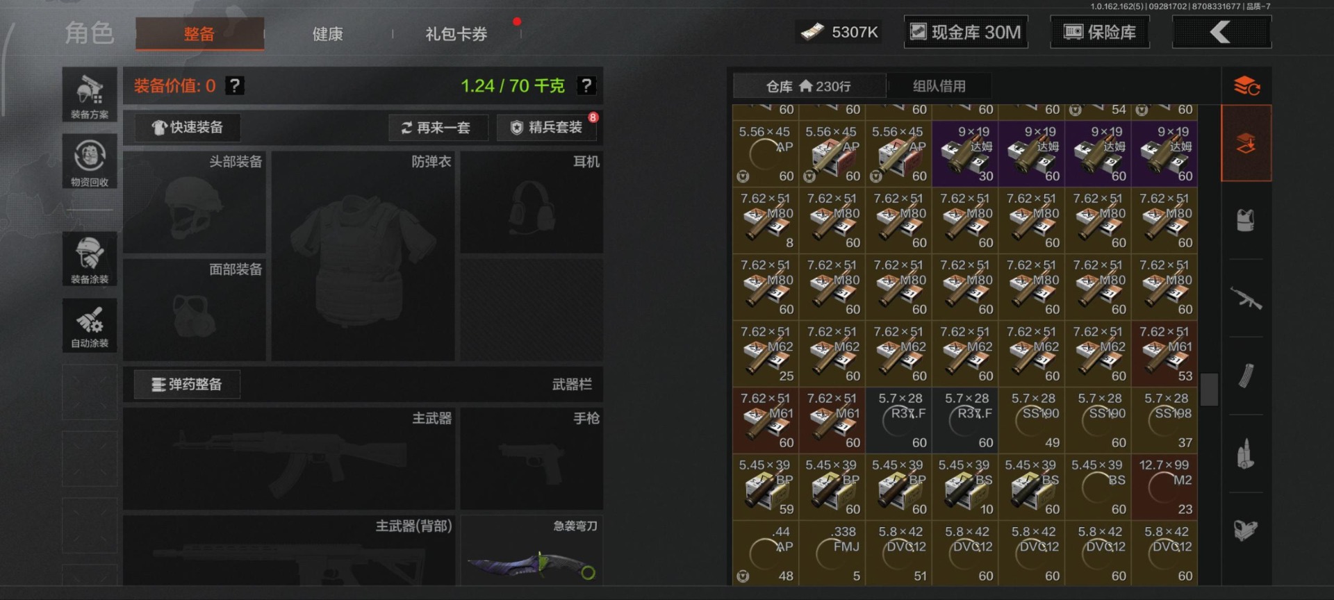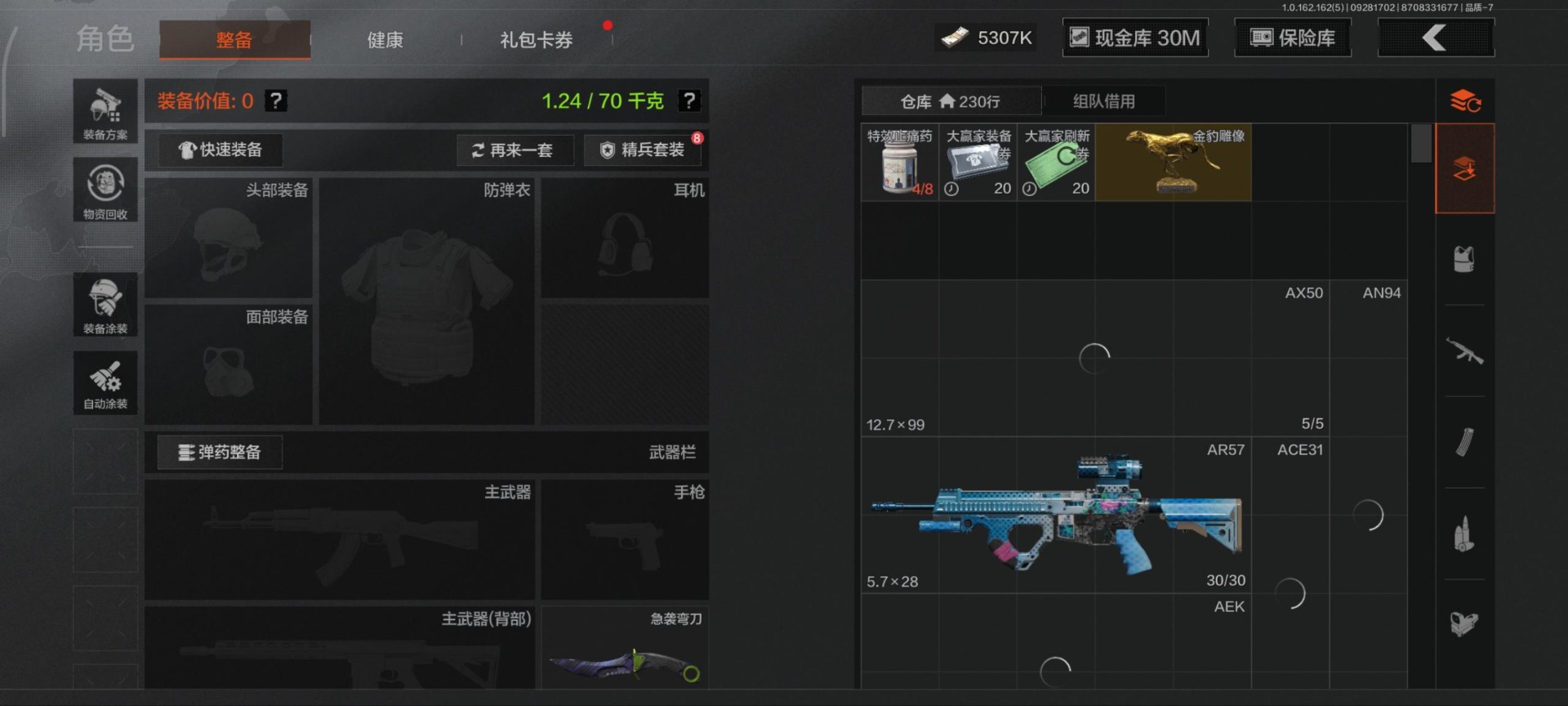 [13630734]库存价值102.7 6近战武器 2金套装 10金枪皮 可修改实名 【柯恩币数量】:3180【角色装扮(金)】:绕指玉鸾·战术甲胄,使徒·欧瑞恩【近战武器】:三尺万仞·战术剑,工兵铲,来战·开山刀,涂鸦利刃,冬日冰镐,急袭弯刀【金色枪皮】:利齿风暴·MPX,告丧夜曲·AUG,告丧夜曲·AR57,浮鳞影青·QBZ192,旧王圣谕·QBZ191,旧王圣谕·VSS,骑士之剑·VSS,长缨风掣·Vector9,长缨风掣·RPK16,长缨风掣·AX50【紫色枪皮】:棱光裂变·AK102,竞技·MDR,骑士之剑·AKS74U,炎夏浪花·H416,快乐游戏·MPX,骤羽尖啸·M4A1,秘域鎏金·RPK16,猩红羽翼·VSS,来战·AKM,德尔塔小队·M4A1,玄戈梨花·MPX,缟兵玄墨·VSS,缟兵玄墨·MPX,07式林地迷彩·QBZ191,玄戈梨花·VSS,涂绘猎人·AR57,战术大师·AK74N【角色装扮(紫)】:金狮护身·转运套装,台风IV竞技运动服