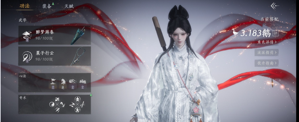 【不可封装陌刀,青丘千岁,瑞鹤仙,戍魂丹心武学,天龙舞火鳞跃天倾奇术,4套258时装,心法6665】 风华值39286 武林造诣(鹅)35775 已用八音窍数量4 未用八音窍数量0 等级100 角色性别【文本】女 【绝境】 【无换绑CD】 【未绑定或可换绑】 【未注册】 【不支持人脸包赔】 【女】 【无】 【ios】 【是】 【是】 【否】 稀有套装2 稀有武器外观1 稀有武学奇术3 套装4 稀有套装:瑞鹤仙,青丘千岁; 稀有武器外观:藏音·万古悲尘; 稀有武学奇术:鳞跃天倾,天龙舞火,戍魂丹心; 套装:白龙,剑影藏心,穿云游雪,蜀戏春;