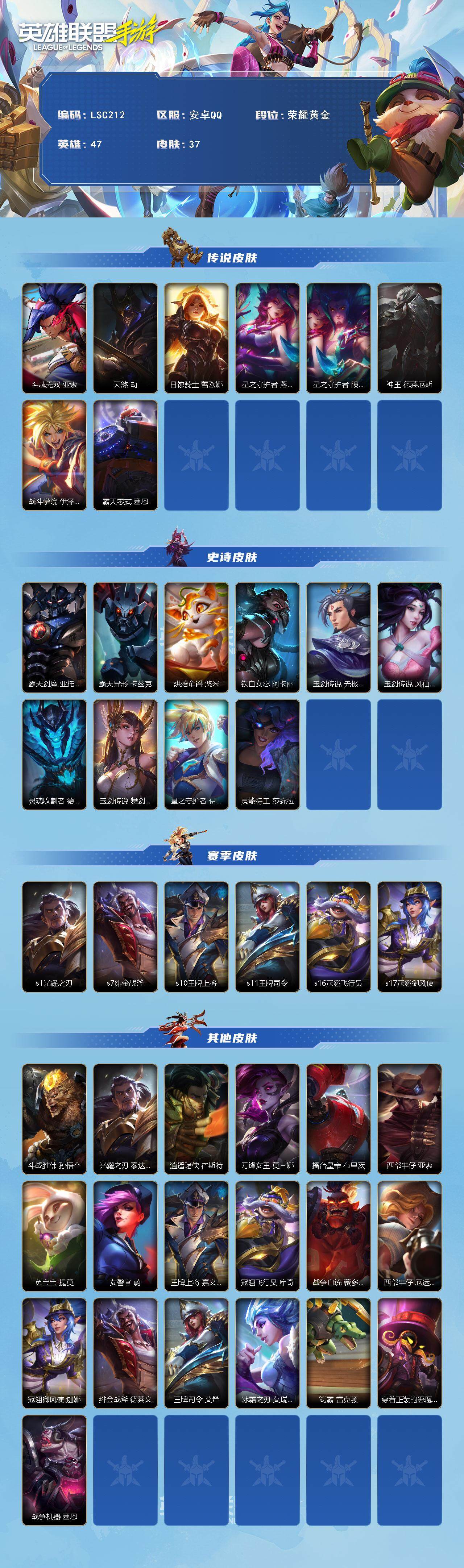 商品描述:【LSC212】47英雄/37皮肤/8传说/10史诗/荣耀黄金/斗魂无双 亚索/天煞 劫/日蚀骑士 蕾欧娜/星之守护者 落 霞/星之守护者 陨 洛/神王 德莱厄斯/战斗学院 伊泽瑞尔/霸天零式 赛恩/霸天剑魔 亚托克斯/霸天异形 卡兹克/烘焙童谣 悠米/铁血女忍 阿卡丽/玉剑传说 无极 易/玉剑传说 风仙子 迦娜/灵魂收割者 德莱文/玉剑传说 舞剑仙 艾瑞莉娅/星之守护者 伊泽瑞尔/灵能特工 莎弥拉/s1光耀之刃/s7绯金战斧/s10王牌上将/s11王牌司令/s16冠翎飞行员/s17冠翎御风使/斗战胜佛 孙悟空/光耀之刃 泰达米尔/逍遥赌侠 崔斯特/刀锋女王 莫甘娜/擂台皇帝 布里茨/西部牛