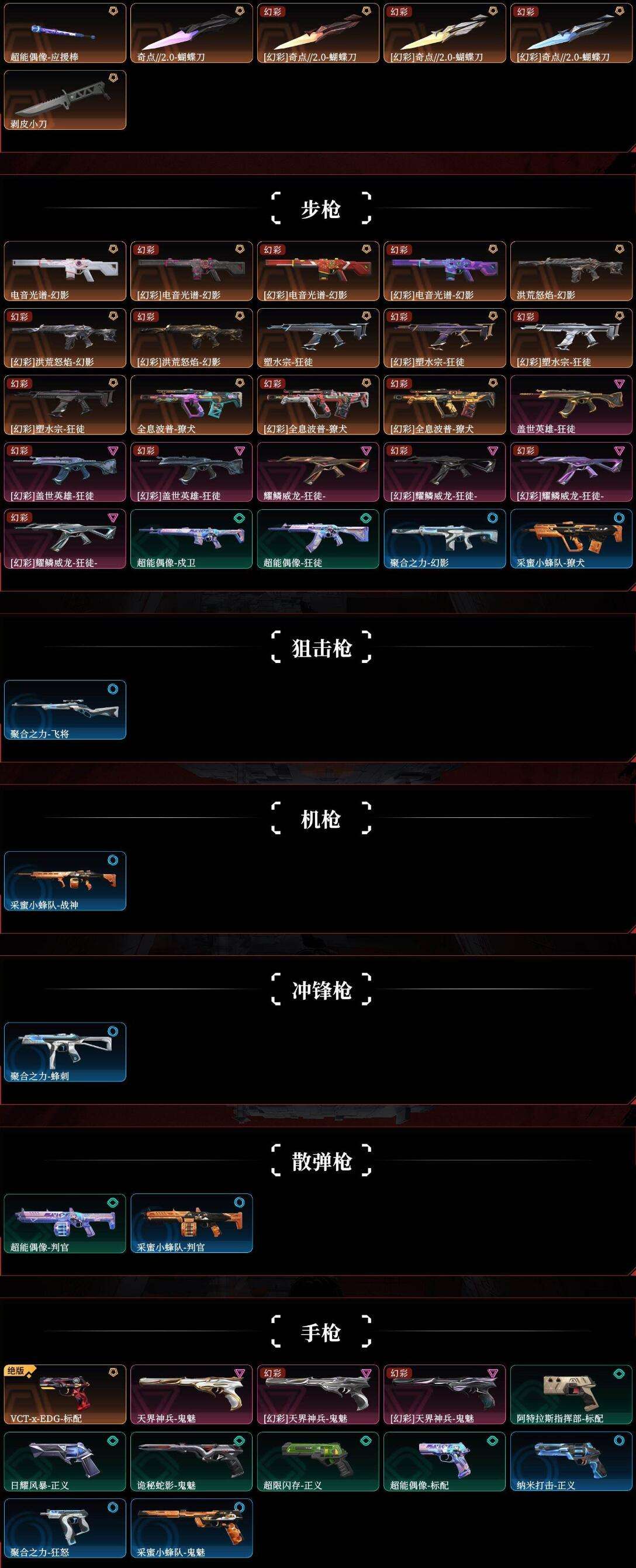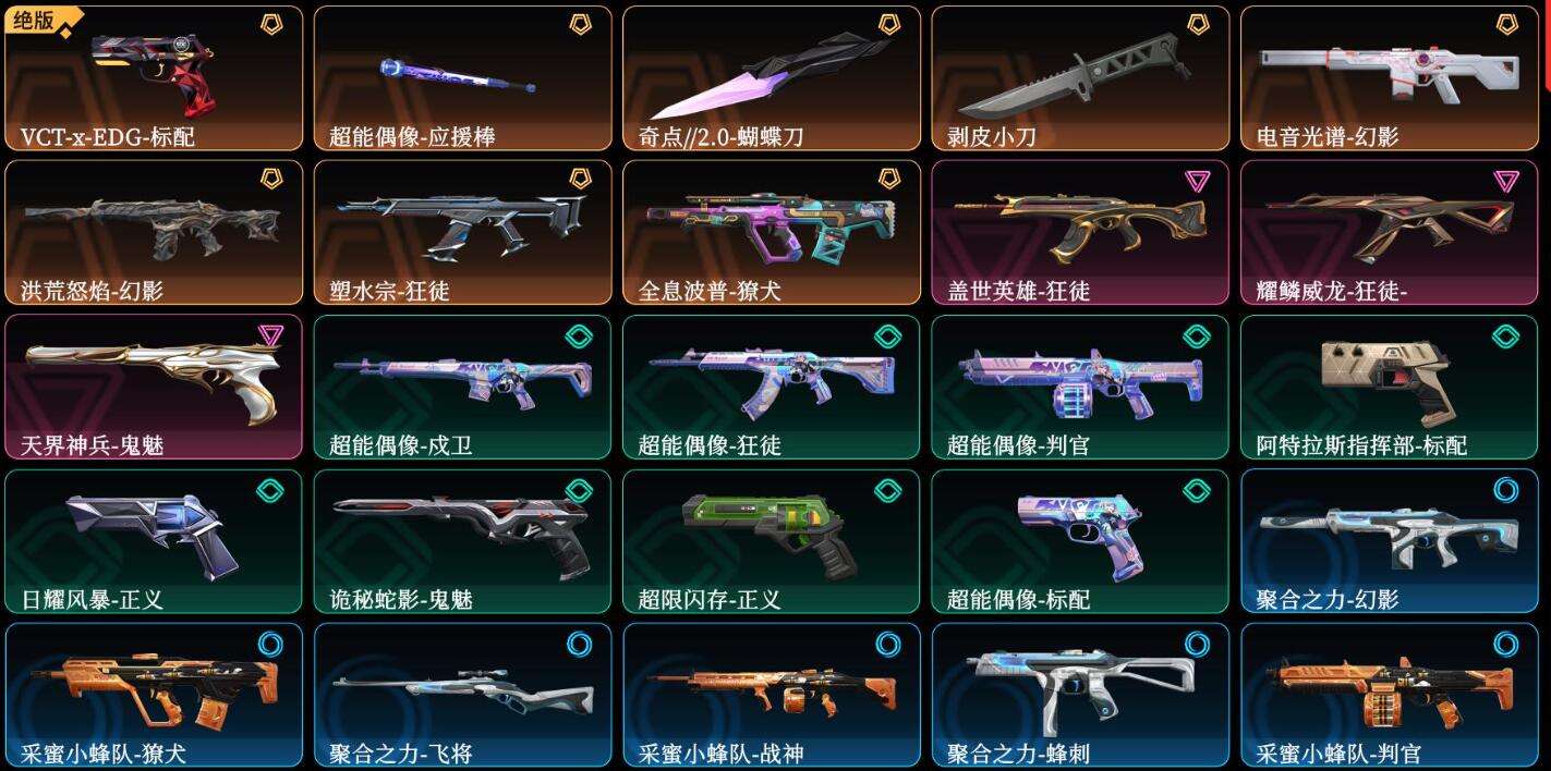 【套装】:2024全球冠军赛套装,2023全球冠军赛套装,《英雄联盟:双城之战》套装,紫阙金琅套装,无畏启程套装【英雄】:幻棱,炼狱,维斯,暮蝶,钛狐,壹决,铁臂,捷风,雷兹,幽影,不死鸟,贤者,猎枭,蝰蛇,零,芮娜,奇乐,尚勃勒,霓虹,斯凯,夜露,星礈,K/O,海神,盖可,黑梦,钢锁【近战 武器】:近战武器-2024全球冠军赛 战刀,近战武器-2023全球冠军赛 苦无,近战武器-合金战车 军刀,近战武器-弧光异彩 军刀,近战武器-金琅斧【狂徒】:狂徒-2023全球冠军赛,狂徒-混沌序曲,狂徒-双城之战,狂徒-RGX 11z Pro,狂徒-掠影,狂徒-紫阙金琅,狂徒-弧光异彩【幻影】