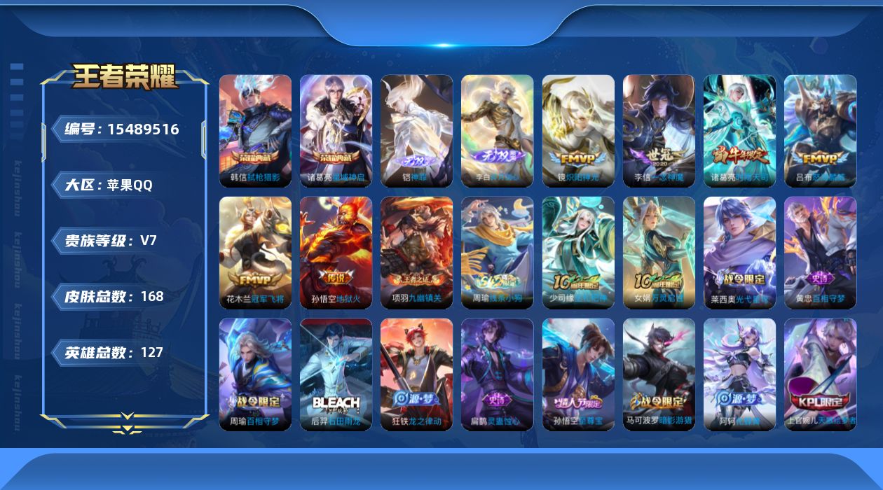 商品描述:[15489516]xr45984-苹果Q-可二次-V7-至尊星耀IV段位-127英雄-164皮肤-2典藏皮肤-2无双-8传说-46史诗【荣耀典藏】:诸葛亮星域神启,韩信弑枪猎影【无双皮肤】:李白碎月剑心,铠神罪【传说皮肤】:杨戬纵目迁山,后羿神树通天,吕布怒海麟威,诸葛亮时雨天司,镜炽阳神光,李信一念神魔,花木兰冠军飞将,孙悟空地狱火【限定皮肤】:狄仁杰阴阳师,赵云皇家上将,墨子神迹守卫,孙尚香蔷薇恋人,元歌无心,马可波罗暗影游猎,狄仁杰魔术师,狄仁杰万华元夜,达摩沙漠行僧,项羽海滩派对,老夫子醍醐杖,老夫子航海奇遇记,程咬金演武夺筹,亚瑟潮玩骑士王,孙悟空至尊宝,李元芳银河之约,钟馗驱傩正仪,鬼谷子原初探秘者,鬼谷子五谷丰年,诸葛亮时雨天司,苏烈千军破阵,弈星混沌棋,公孙离蜜橘之夏,沈梦溪星空之诺,沈梦溪大漠名商,明世隐疑决卦,裴擒虎李小龙,猪八戒西部大镖客,上官婉儿梁祝,上官婉儿天狼绘梦者,嫦娥拒霜思,艾琳女武神,张良古海寻踪,鬼谷子天穹祈灯,李白碎月剑心,沈梦溪龙舞盛年,刘邦剑破天穹【年限皮肤】:诸葛亮时雨天司【赛季限定】:狄仁杰万华元夜,达摩沙漠行僧,老夫子醍醐杖,程咬金演武夺筹,张良古海寻踪,钟馗驱傩正仪,鬼谷子原初探秘者,苏烈千军破阵,弈星混沌棋,沈梦溪大漠名商,明世隐疑决卦,鬼谷子天穹祈灯,刘邦剑破天穹【战令限定】:墨子神迹守卫,马可波罗暗影游猎,老夫子航海奇遇记,亚瑟潮玩骑士王,李元芳银河之约,沈梦溪星空之诺,猪八戒西部大镖客【史诗皮肤】:赵云皇家上将,赵云未来纪元,貂蝉圣诞恋歌,甄姬冰雪圆舞曲,狄仁杰魔术师,宫本武藏鬼剑武藏,孙尚香蔷薇恋人,孙尚香水果甜心,嬴政暗夜贵公子,妲己女仆咖啡,吕布圣诞狂欢,曹操幽灵船长,李白千年之狐,孙悟空至尊宝,刘邦德古拉伯爵,夏侯惇乘风破浪,诸葛亮黄金分割率,亚瑟心灵战警,雅典娜冰冠公主,百里守约特工魅影,铠曙光守护者,刘禅天才门将,公孙离蜜橘之夏,狄仁杰鹰眼统帅,上官婉儿梁祝,李元芳银河之约,不知火舞魅语,橘右京修罗,上官婉儿天狼绘梦者,马可波罗暗影游猎,裴擒虎李小龙,老夫子航海奇遇记,沈梦溪月团寄思,嫦娥拒霜思,澜赏金猎手,鬼谷子五谷丰年,元歌无心,阿轲化蝶舞,狂铁龙之律动,扁鹊灵蛊蚀心,后羿石田雨龙,周瑜百相守梦,黄忠百相守梦,莱西奥光弋星穹,女娲万灵启世,少司缘巫礼祀神,周瑜线条小狗【其他皮肤】:项羽海滩派