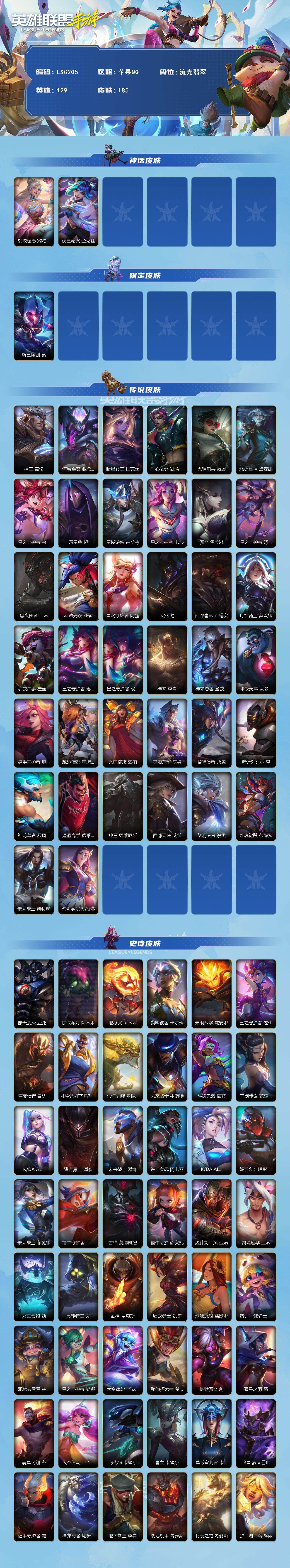 商品描述:【LSC205】129英雄/185皮肤/2神话/38传说/85史诗/流光翡翠/桃映暖春 灼灼芳菲 拉克丝/夜星流火 金克丝/斩星魔剑 易/神王 盖伦/海魔至尊 亚托克斯/暗星女王 拉克丝/心之钢 凯隐/光明哨兵 薇恩/北极星神 黛安娜/星之守护者 金克丝/暗星尊 烬/星域游侠 崔斯特/星之守护者 卡莎/魔女 伊芙琳/星之守护者 阿卡丽/黑夜使者 亚索/斗魂无双 亚索/星之守护者 阿狸/天煞 劫/西部魔影 卢锡安/月蚀骑士 蕾欧娜/驯龙炮手 崔丝塔娜/星之守护者 落 霞/星之守护者 陨 洛/神拳 李青/神龙尊者 圣龙 李青/律政大亨 蒙多医生/福牛守护者 厄运小姐/跳跳倩影 厄运小姐/光电璀璨