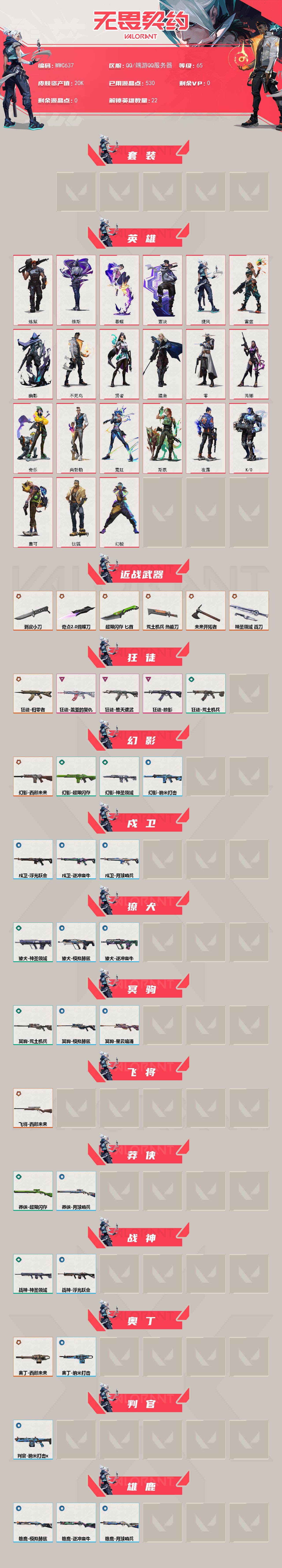 [13706220]Q191850 无畏契约/38等级/未定级段位/16英雄/22皮肤/资产15000/已使用R点355/剩余R点5/2022全球冠军赛-幻影,光明哨兵-狂徒,洪荒怒焰-狂徒,超限闪存-匕首,天御刀,夜之蝴蝶,盖世英雄-冥驹,VCT-x-BLG-标配,破败军械-鬼魅,离子武器-正义