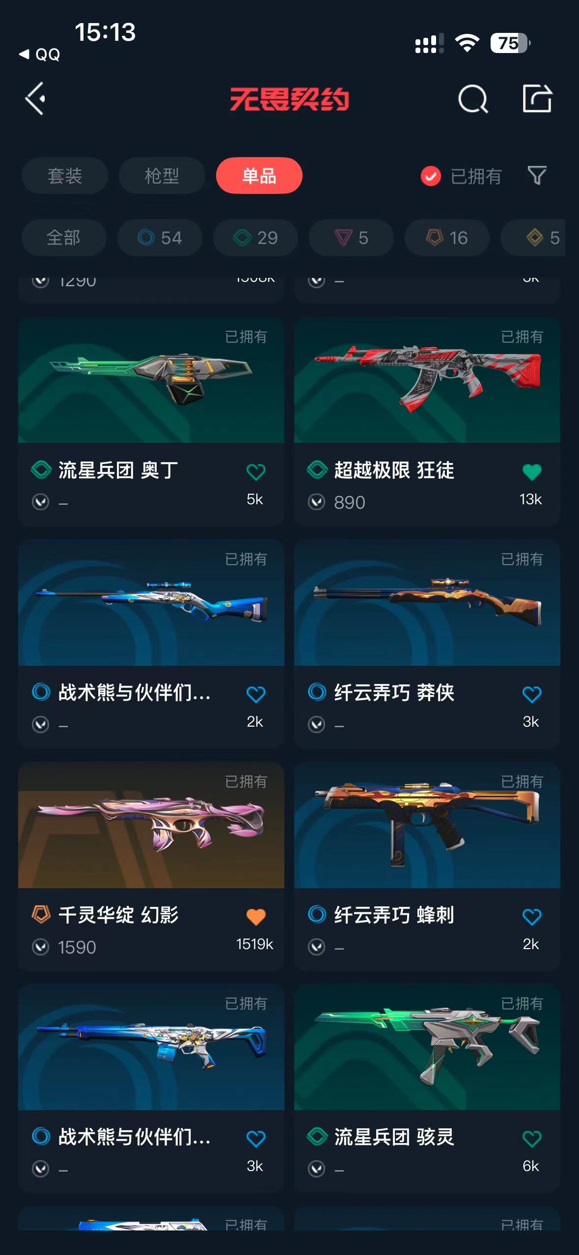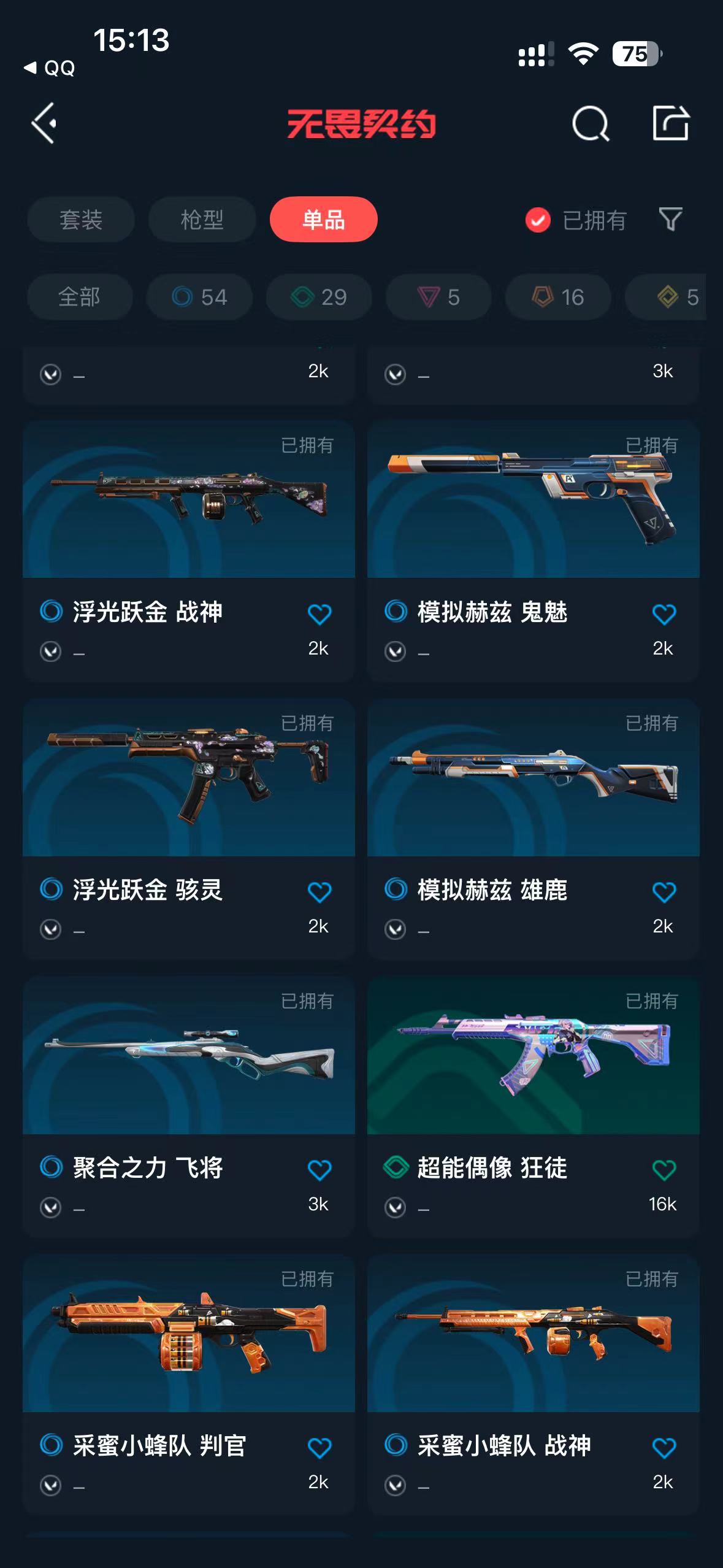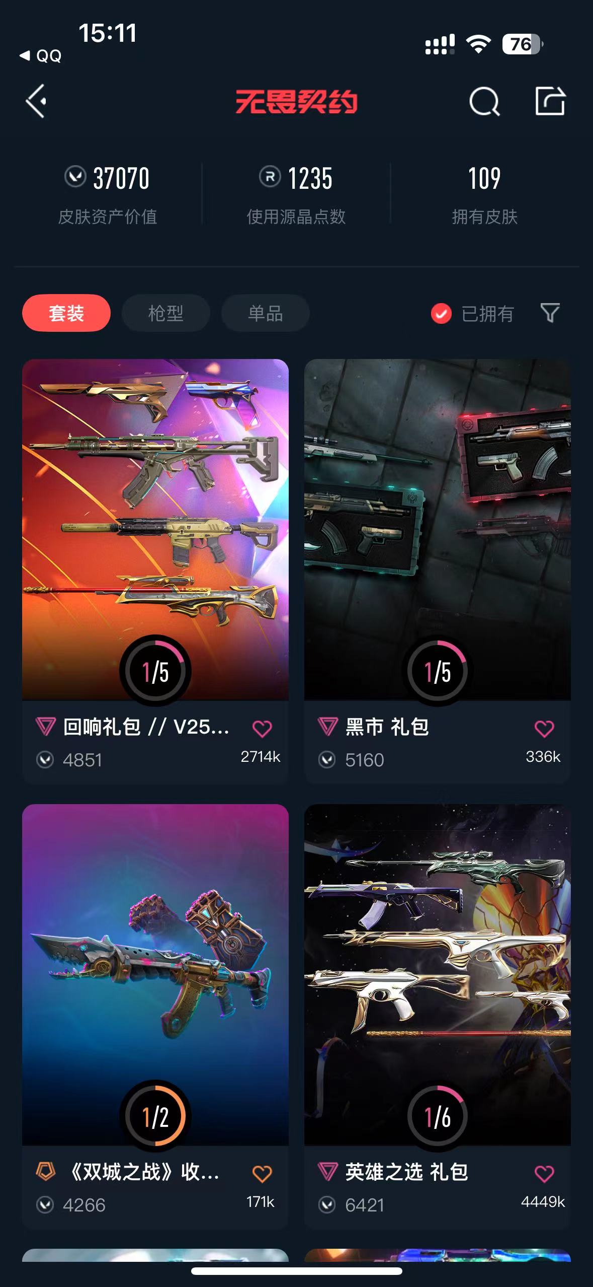 【套装】:2024全球冠军赛套装,2023全球冠军赛套装,《英雄联盟:双城之战》套装,紫阙金琅套装,无畏启程套装【英雄】:幻棱,炼狱,维斯,暮蝶,钛狐,壹决,铁臂,捷风,雷兹,幽影,不死鸟,贤者,猎枭,蝰蛇,零,芮娜,奇乐,尚勃勒,霓虹,斯凯,夜露,星礈,K/O,海神,盖可,黑梦,钢锁【近战 武器】:近战武器-2024全球冠军赛 战刀,近战武器-2023全球冠军赛 苦无,近战武器-合金战车 军刀,近战武器-弧光异彩 军刀,近战武器-金琅斧【狂徒】:狂徒-2023全球冠军赛,狂徒-混沌序曲,狂徒-双城之战,狂徒-RGX 11z Pro,狂徒-掠影,狂徒-紫阙金琅,狂徒-弧光异彩【幻影】