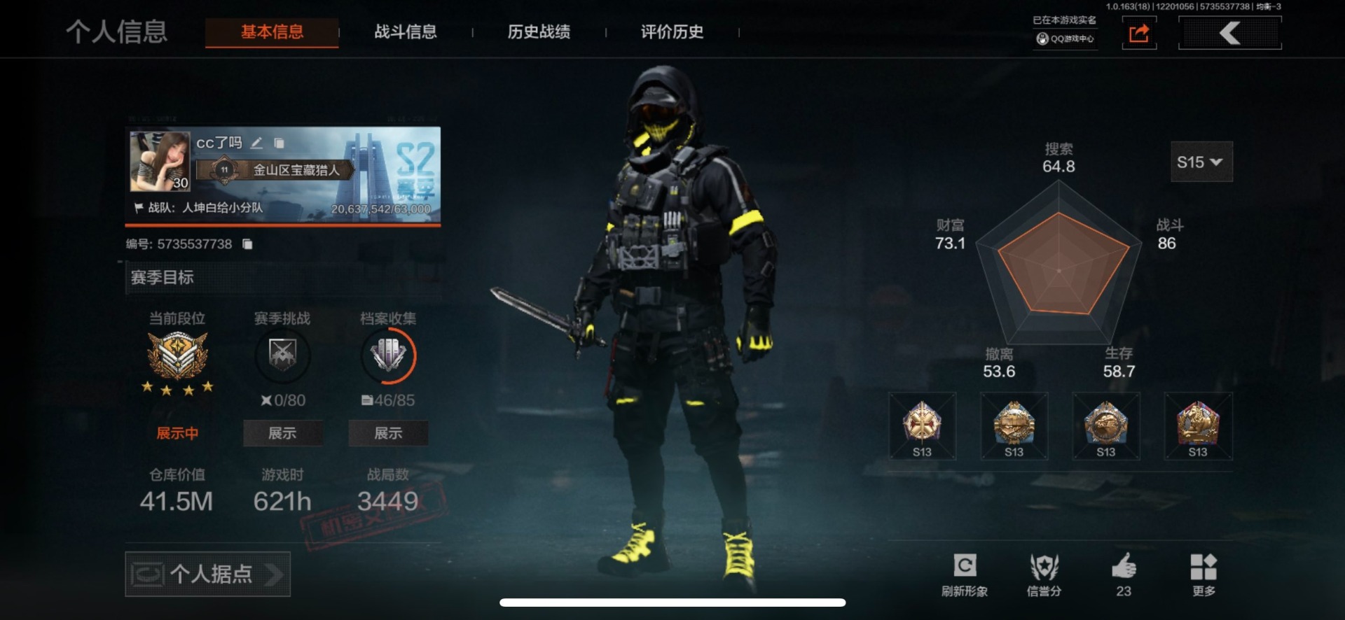 [15902972]库存价值46.3 4近战武器 1金套装 2金枪皮 可修改实名 【柯恩币数量】465440 【角色装扮(金)】不败坚守作战服 【近战武器】赢家匕首,工兵铲,来战·开山刀,涂鸦利刃 【金色枪皮】旧王圣谕·QBZ191,竞技·FAL 【紫色枪皮】赢家·F2000,棱光裂变·AK74N,竞技·AUG,北国内卫·MDR,炎夏浪花·H416,骑士之剑·ACE31,骑士之剑·AKS74U 【角色装扮(紫)】王国卫队礼装库存价值41.5 7近战武器 1金套装 8金枪皮 可修改实名 【柯恩币数量】:137323【角色装扮(金)】:脉冲·马克西姆【近战武器】:空腔战术,S-07折刀,工兵铲,来战·开山刀,胜利军刀,裁决手杖剑,百炼恒常【金色枪皮】:棱光裂变·QBU191,利齿风暴·MPX,浮鳞影青·QBZ192,旧王圣谕·VSS,战术大师·AEK,战术大师·AN94,旗帜·AEK,骑士之剑·VSS【紫色枪皮】:超越自我·Vector9,竞技·MDR,骤羽尖啸·M4A1,骤羽尖啸·MPX,利齿风暴·T03,利齿风暴·T79,猩红羽翼·VSS,最后防线·AEK,火力倾泻·AUG,棱光裂变·AKM,鱼跃丹青·T85,战术大师·Suomi,突变系谱·Groza,典礼武备·MCX,粉绒臻选·AN94,和平之手·FAL,缟兵玄墨·VSS【角色装扮(紫)】:高地武士套装,王国卫队礼装,鎏金街头套装