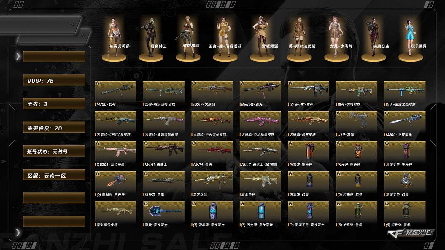 M7862/西部/四川一区/可排位/42V/传说破晓/幻神/幻神电流骇客/M200竞技荣光/QBZ金色蔷薇/COP云龙/【四防角色/王者魅影/】/【角色】/关小雨/零纪元/战地猎狐/奇洋探员/乔伊教练/云海玲珑/【音效卡/碧霄极光音效卡/昌龙怀旧音效卡/】/【枪皮】/雷神源计划/火麒麟心动糖果/毁灭冠军之怒/【小人枪/MK5炽火炎龙/KAC锯式机枪黑桃战神/】/永久AC/找回包赔