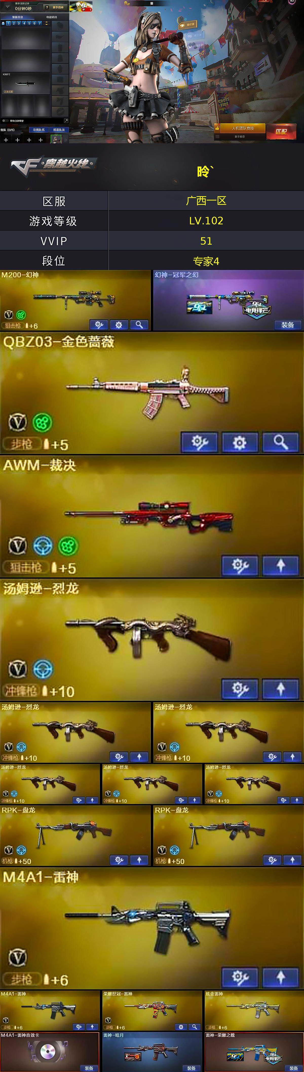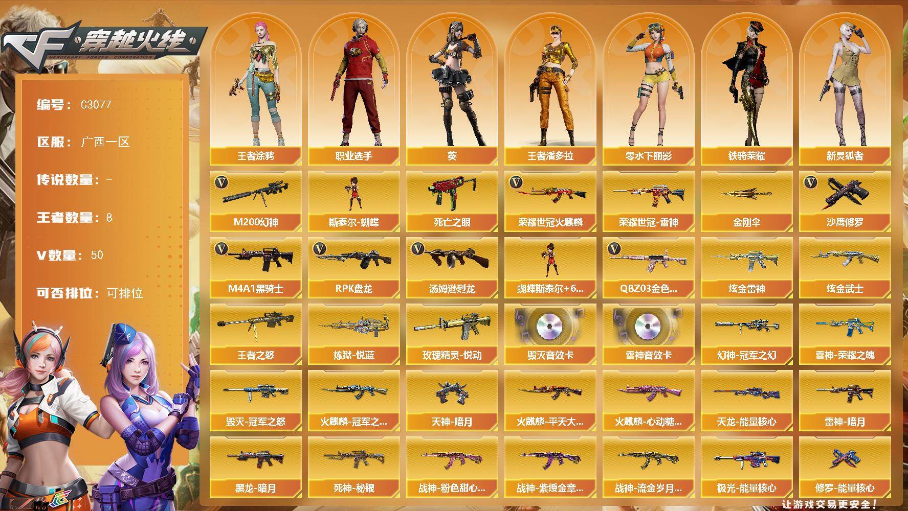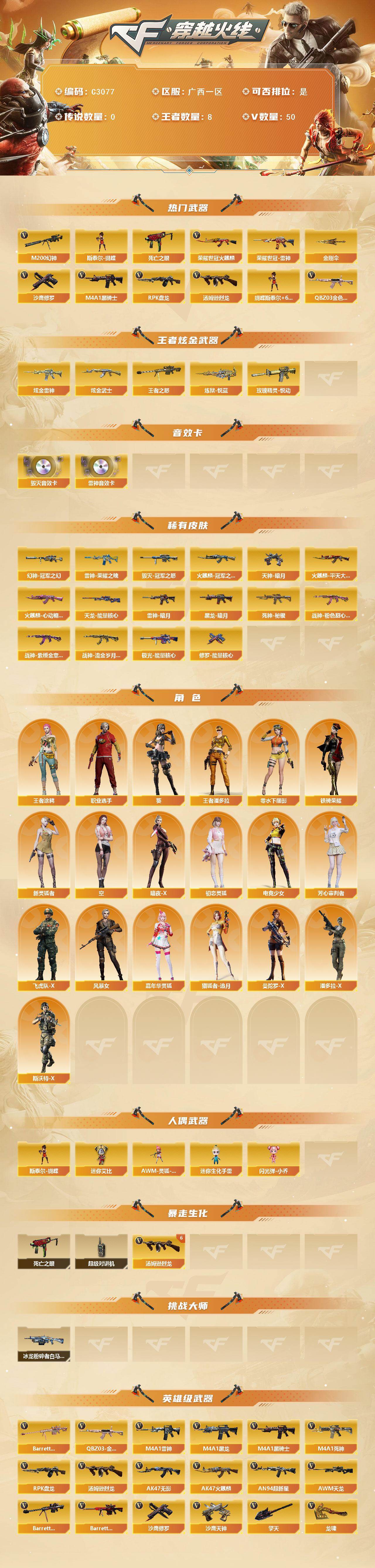 商品描述:[16166595]广西一区-50V-8王者-2炫金【热门武器】:QBZ03-金色蔷薇,M200-幻神,死亡之眼*2,荣耀世冠-火麒麟,荣耀世冠-雷神,M4A1-黑骑士*2,汤姆逊-烈龙*6,RPK-盘龙*2,斯泰尔-蝴蝶,沙鹰-修罗*4,金刚伞【王者炫金武器】:玫瑰精灵-悦动*2,王者之怒,炼狱-悦蓝,炫金雷神,炫金武士【音效卡】:M4A1-雷神音效卡,Barrett-毁灭音效卡【皮肤】:幻神-冠军之幻,雷神-暗月,雷神-荣耀之魄,火麒麟-冠军之心,火麒麟-平天大圣,火麒麟-心动糖果,毁灭-冠军之怒,黑龙-暗月,死神-秘银,战神-粉色甜心皮肤,战神-紫绶金章皮肤,战神-流金岁月皮肤*3,天龙-能量核心,极光-能量核心,修罗-能量核心,天神-暗月【角色】:葵,王者涂鸦,王者潘多拉,空,暗夜-X,初恋灵狐,电竞少女,芳心审判者,飞虎队-X,风暴女,嘉年华灵狐,猎狐者-追月,零-水下丽影,曼陀罗-X,潘多拉-X,斯沃特-X,铁骑荣耀,新灵狐者,职业选手【人偶武器】:斯泰尔-蝴蝶,AWM-灵狐-15周年嘉年华,迷你生化手雷*2,闪光弹-小乔,迷你艾比【暴走生化】:死亡之眼*2,超级对讲机【挑战大师】:冰龙粉碎者-白马银枪【英雄级武器】:AK47-火麒麟,M4A1-黑龙,M4A1-雷神*2,M4A1-黑骑士*2,AK47-无影,M4A1-死神,AN94-超新星,无影-神兵利器,黑武士-锦绣游龙,QBZ03-金色蔷薇,王者之心-觉醒版,AK-47-猩红传说*4,荣耀世冠-火麒麟,荣耀世冠-雷神,AWM-天龙,Barrett-毁灭,Barrett-极光,AWM-裁决,M200-幻神,Barrett-金色蔷薇,王者之怒-觉醒版,RPK-盘龙*2,汤姆逊-烈龙*6,沙鹰-修罗*4,沙鹰-天神*2,修罗-云海游龙,屠龙*3,龙啸*2,擎天*2,麒麟刺【道具】:战舰背包,炫彩背包,超级背包,变异宝贝,生化弹匣,夺命之镰,防化服,金色流光-枪王排位*2,星辰流光-枪王排位,枪王排位28赛季金色流光,防弹头盔,防弹衣,C4工具钳,手雷包【特殊枪械】:蝴蝶斯泰尔+6烈龙,2黑骑士,6烈龙,2盘龙,1蝴蝶斯泰尔