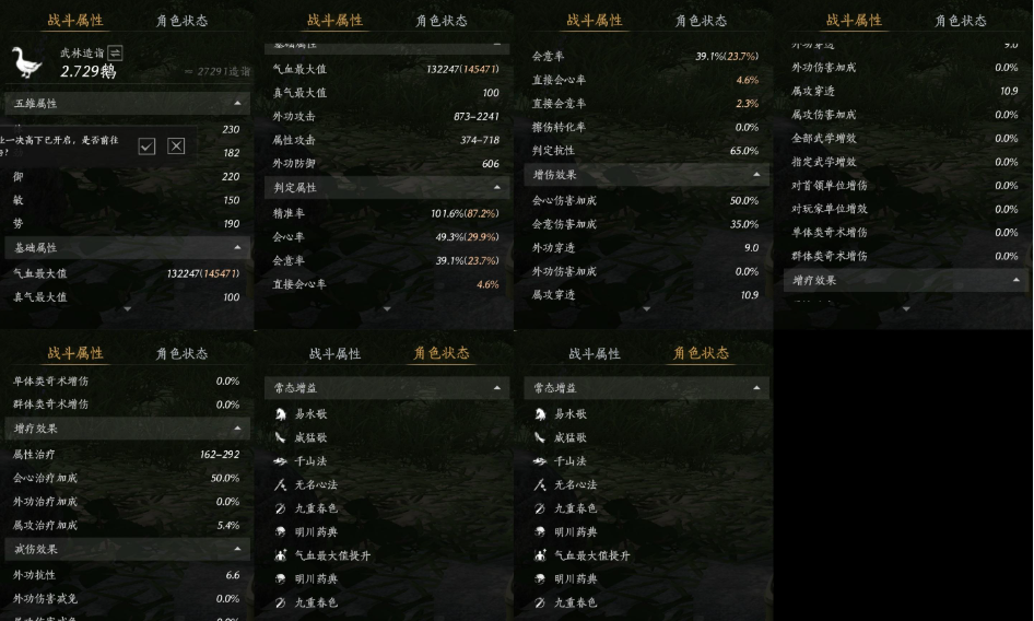【热门套装醉蓬莱 热门发型云深归处 带唐刀武学 接受小刀 】 风华值20725 武林造诣(鹅)34656 已用八音窍数量2 等级100 角色性别【文本】女 【绝境】 【无换绑CD】 【未绑定或可换绑】 【不支持人脸包赔】 【女】 【无】 【是】 【是】 稀有套装2 稀有发型1 稀有武学奇术1 套装5 武器外观1 坐骑2 稀有套装:问春何苦,晏平生; 稀有发型:云深归处; 稀有武学奇术:龙战玄黄; 套装:醉蓬莱,九间当铺,落花闻诏,纵横,夜郎幽问; 武器外观:飒陌耶; 坐骑:飞毛腿,盗骊;