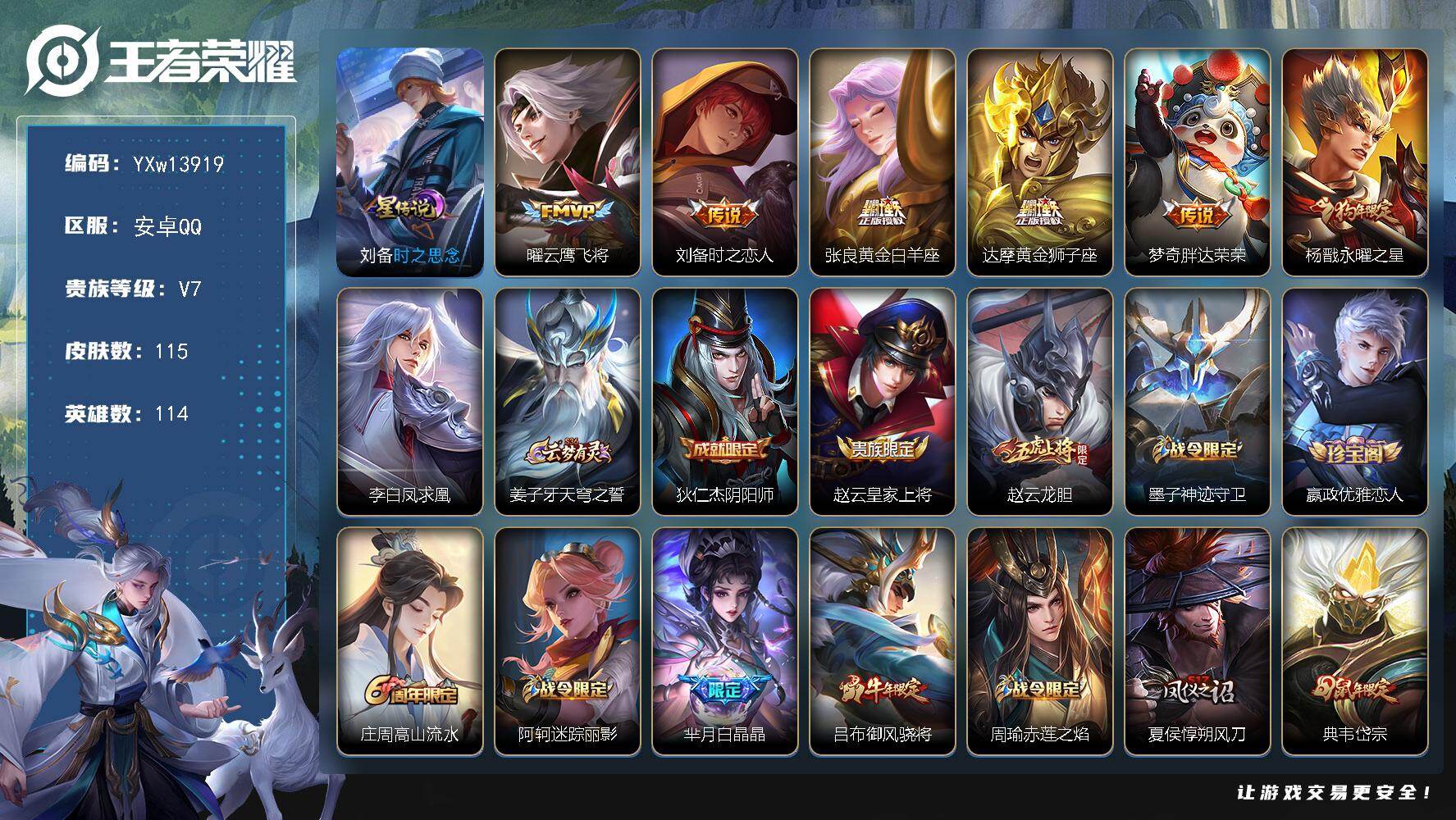 商品描述:【高性价比·时之思念·永曜之星·云鹰飞将·时之恋人·黄金白羊座·黄金狮子座·凤求凰·岱宗·御风骁将·可二次】YXw13919-安卓Q-114英雄-115皮肤-9王者印记-120铭文-贵族积分2w【贵族7】【1星传说·7传说·1按键·251幸运值】【因赛季更新游戏段付以上号为准!】【星元皮肤】:刘备时之思念【传说皮肤】:曜云鹰飞将,刘备时之恋人,张良黄金白羊座,达摩黄金狮子座,梦奇胖达荣荣,杨戬永曜之星,李白凤求凰【限定皮肤】:姜子牙天穹之誓,狄仁杰阴阳师,赵云皇家上将,赵云龙胆,墨子神迹守卫,嬴政优雅恋人,庄周高山流水,阿轲迷踪丽影,芈月白晶晶,吕布御风骁将,周瑜赤莲之焰,夏侯惇朔风刀