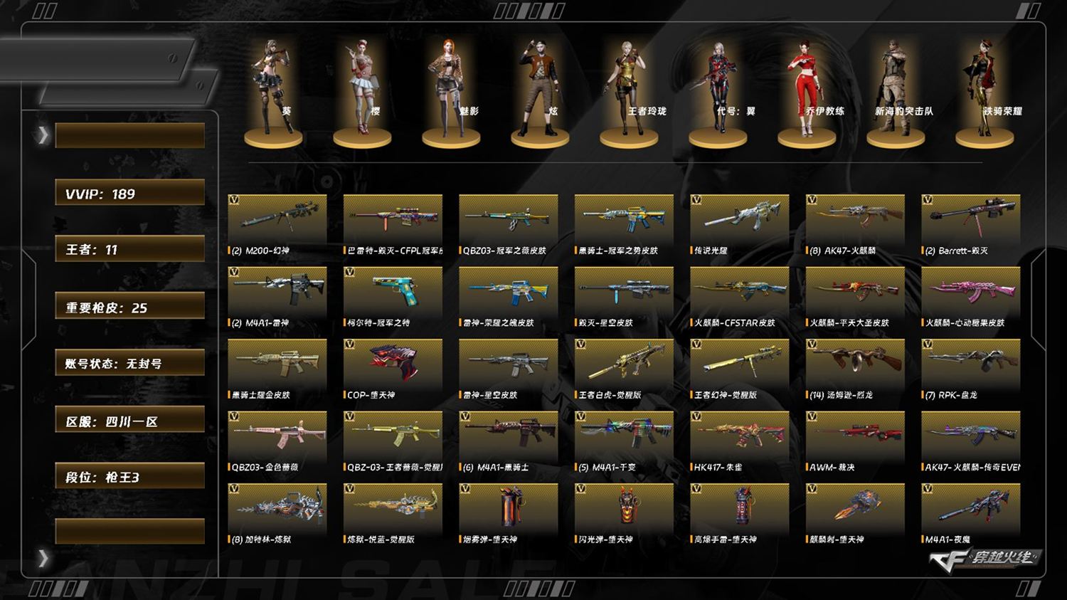 M7659/西部/四川一区/可排位/190v/传说光耀/幻神/*2/6盘龙/6炼狱/6烈龙/6修罗/王者白虎/觉醒版/王者幻神/觉醒版/QBZ王者蔷薇/【金色蔷薇套装/QBZ金色蔷薇/QBZ冠军之薇/QBZ金色蔷薇音效卡/】/M14EBR玄武/朱雀/夜魔套装/破空枪刃夜魔/COP堕天神/柯尔特冠军之特/冠军之刃/【角色】/葵/樱/炫/魅影/乔伊教练/王者玲珑/新海豹突击队/【音效卡/雷神音效卡/火麒麟音效卡/黑骑士音效卡/极光音效卡/毁灭音效卡/】/【枪皮】/毁灭星空/黑骑士冠军之势/火麒麟雷神/火麒麟心动糖果/王者武器/王者之心/王者之影/王者之魄/王者之势/王者之力/王者之怒/王者之锋/王者之击/王者之啸/炫金武器/炫金骑士/炫金毁灭/炫金天龙/炫金天神/炫金修罗/【小人枪/火麒麟绝迹/KAC锯式机枪黑桃战神/Cat刀锋/M37葵/COP旗袍/】/永久AC/找回包赔