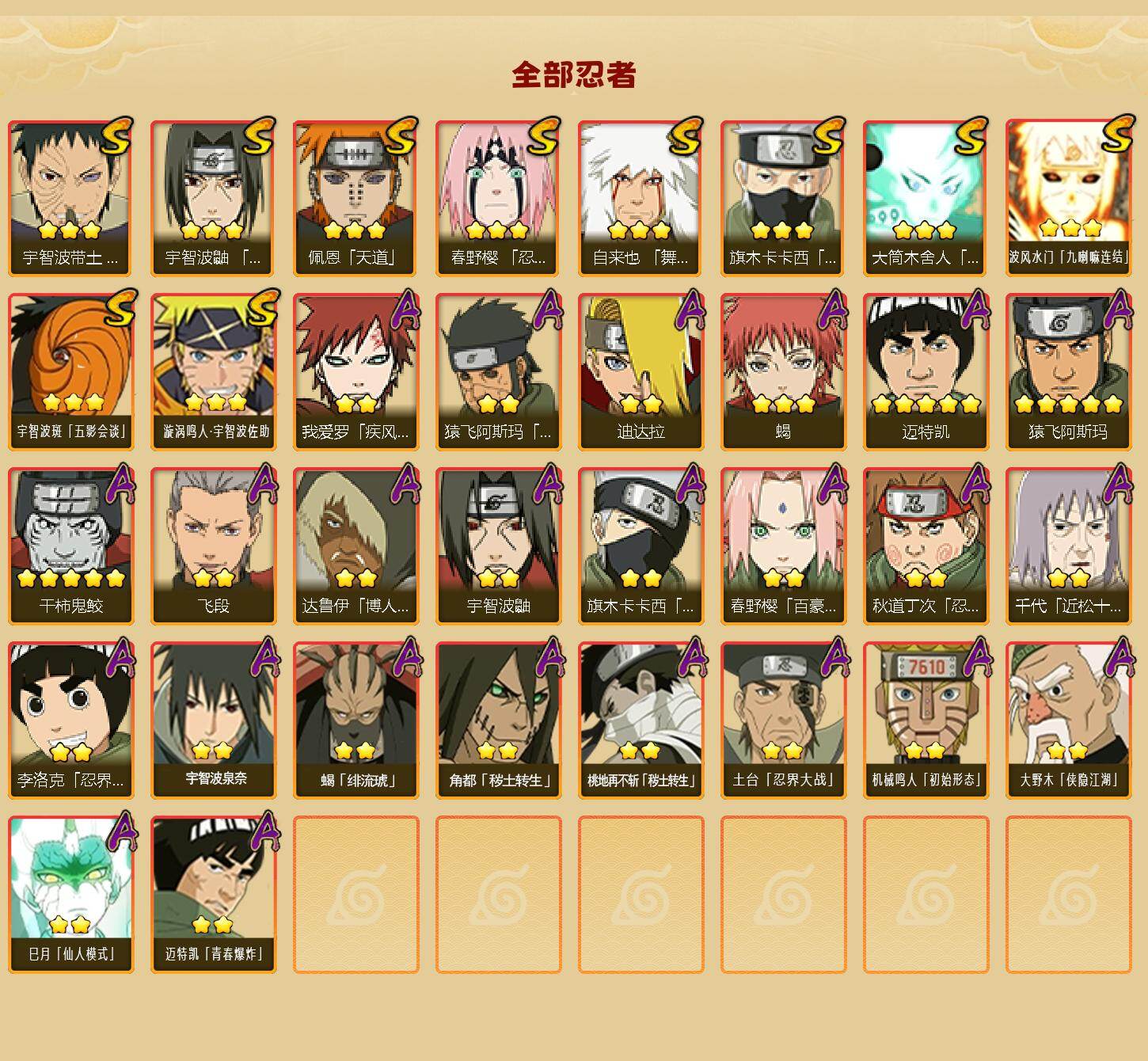 商品描述:[16366924]Xr47832-安Q-10S级忍者数-24A级忍者数【S级忍者】:春野樱「忍界大战」(3星),宇智波带土「忍界大战」(3星),宇智波鼬「须佐能乎」(3星),旗木卡卡西「须佐能乎」(3星),自来也「舞之豪杰」(3星),佩恩「天道」(3星),大筒木舍人「最终章」(3星),波风水门「九喇嘛连结」(3星),宇智波斑「五影会谈」(3星),漩涡鸣人·宇智波佐助(3星)【A级忍者】:达鲁伊「博人传」(2星),迪达拉(2星),飞段(2星),干柿鬼鲛(5星),机械鸣人「初始形态」(2星),迈特凯(5星),旗木卡卡西「忍界大战」(2星),桃地再不斩「秽土转生」(2星),我爱罗「疾风传」(2星),蝎(3星),蝎「绯流琥」(2星),角都「秽土转生」(2星),猿飞阿斯玛(5星),猿飞阿斯玛「秽土转生」(2星),宇智波鼬(2星),李洛克「忍界大战」(2星),春野樱「百豪」(2星),秋道丁次「忍界大战」(2星),千代「近松十人卫」(2星),土台「忍界大战」(2星),宇智波泉奈(2星),大野木「侠隐江湖」(2星),巳月「仙人模式」(2星),迈特凯「青春爆炸」(2星)