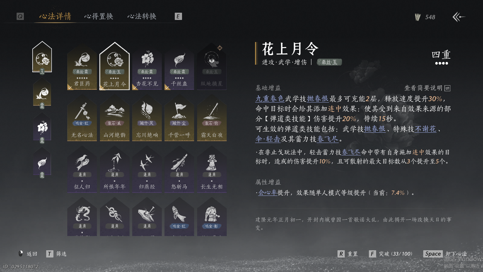 【澄心不染金阙翼回配饰,可封装5金伞,幽灵速坐骑,如碎霜天,青丘千岁,月中天阙,瑞鹤仙,将星入命,弄清影,霓裳徊天武学,鳞跃天倾黄龙断戟奇术,4套258时装,心法6666】 风华值73492 武林造诣(鹅)35029 已用八音窍数量12 未用八音窍数量0 等级100 角色性别【文本】女 【绝境】 【无换绑CD】 【未绑定或可换绑】 【未注册】 【不支持人脸包赔】 【女】 【无】 【ios】 【是】 【是】 【否】 稀有套装5 稀有发型1 稀有武器外观1 稀有武学奇术2 稀有坐骑1 套装4 稀有套装:将星入命,瑞鹤仙,如碎霜天,月中天阙,青丘千岁; 稀有发型:弄清影; 稀有武器外观:藏音·北溟有鱼(五金); 稀有武学奇术:黄龙断戟,鳞跃天倾; 稀有坐骑:幽灵速; 套装:青草原,花月天真,夜郎幽问,金滟玉团;