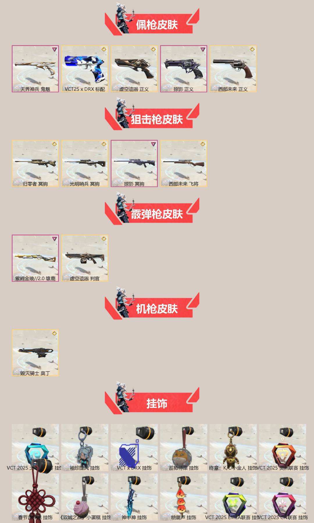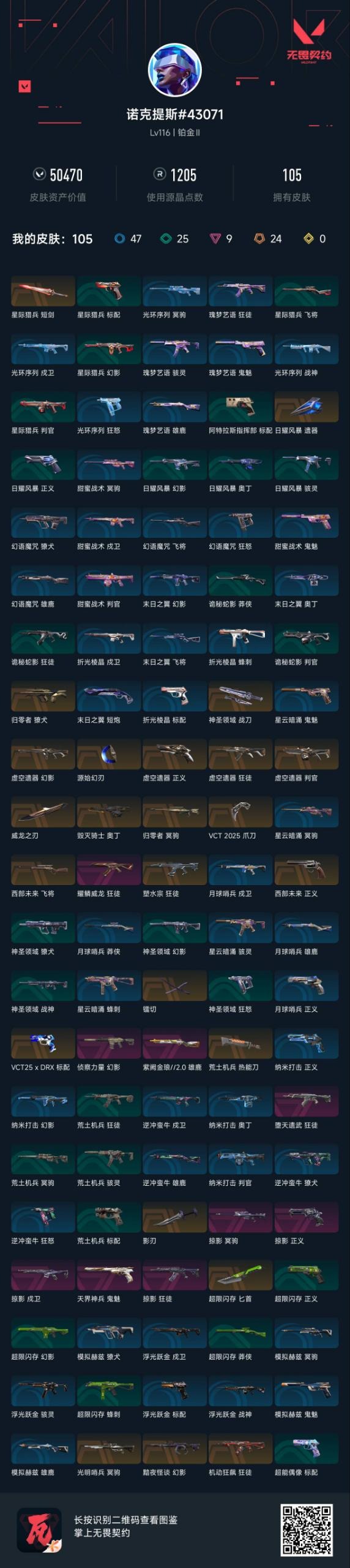 商品描述:[13703702]24橙皮 9紫皮 105皮肤 28英雄 123卡面 1205已用源晶 铂金段位 【套装】:掠影套装,虚空遗器,VCT 2025赛季礼包,VCTCN2025套装【近战武器皮肤】:源始幻刃,神圣领域 战刀,VCT 2025 爪刀,镭切,匕首-超限闪存,荒土机兵热能刀,影刃,星际猎兵 短剑,威龙之刃【佩枪皮肤】:标配-VCT25xDRX,正义-掠影,正义-虚空遗器,正义-西部未来,鬼魅-天界神兵【霰弹枪皮肤】:判官-虚空遗器,雄鹿-紫阙金琅2.0【步枪皮肤】:戍卫-掠影,狂徒-掠影,幻影-黯夜怪谈,狂徒-虚空遗器,幻影-虚空遗器,狂徒-塑水宗,狂徒-耀鳞威龙,狂徒-机动狂飙,狂徒-堕天遗武,幻影-侦察力量,獠犬-归零者【狙击枪皮肤】:冥驹-掠影,飞将-西部未来,冥驹-光明哨兵,冥驹-归零者【机枪皮肤】:奥丁-毁灭骑士【挂饰】:袖珍捷风挂饰,双城之战小蛋糕挂饰,神中神挂饰,春节吉祥结挂饰,VCT2025EMEA联赛挂饰,VCT2025太平洋联赛挂饰,VCT2025美洲联赛挂饰,VCT2025CN联赛挂饰,VCTxDRX挂饰,糖葫芦挂饰,蓄势待滚挂饰,终章KO小金人挂饰