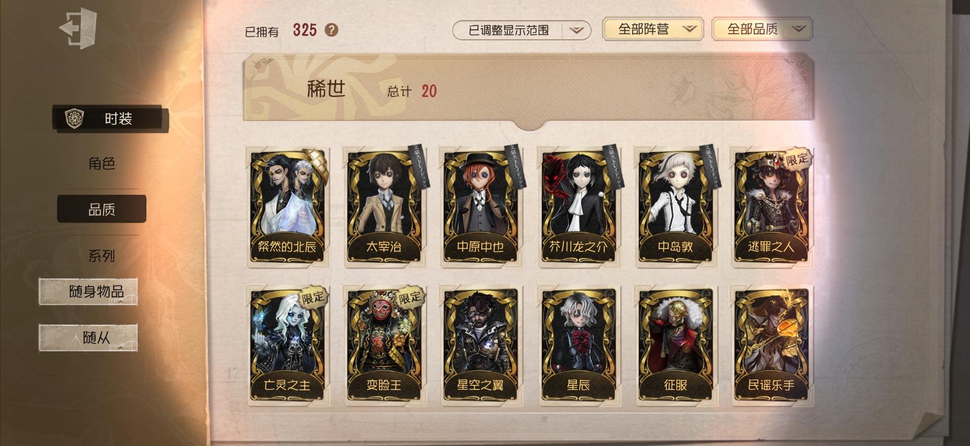 [13739442]苹果官服 邮箱账号 208时装 15金皮 63紫皮 8随从 78随身物品 【时装】:守夜人-KNIGHT-c3,破轮-胡桃夹子,勘探员-盖提亚之遗,飞行家-异相睡眠,小丑-捣蛋裘克,爱哭鬼-摩诺,作曲家-幽灵帆,舞女-西尔菲德,佣兵-中岛敦,园丁-宇宙女巫,杂技演员-茶话会,记者-华生小姐,“囚徒”-OPH.LUCA,骑士-Mentor K,教授-吟游诗人,病患-溯光,“杰克”-加里,雕刻家-善忘的海马体,邮差-华生医生,小丑-OPH.JOKER,邮差-潘塔龙,小说家-“伊始新篇”,哭泣小丑-熄灭的太阳,“法罗女士”-芳泽霞,时空之影-“有机磷”,入殓师-“温室”,“记录员”-删除符,击球手-迫降专家,哭泣小丑-炮弹飞船,勘探员-中原中也,爱哭鬼-雪上小王子,红夫人-女大公,画家-江户川乱步,红蝶-更纱,舞女-高卷杏,调酒师-海盐特调,幸运儿-双一,小丑-变脸王,魔术师-广津柳浪,梦之女巫-信使,前锋-SKULL,梦之女巫-川上富江,前锋-坂本龙司,摄影师-宿醉,“囚徒”-太宰治[13739658]哔哩哔哩 手机账号 330时装 25金皮 86紫皮 7随从 110随身物品 【时装】:宿伞之魂-粲然的北辰,心理学家-长夜,佣兵-赤井秀一,记者-永恒,蜘蛛-花祭,“心理学家”-末世搜救,勘探员-枭徒,冒险家-赞因,心理学家-菲伦,空军-尼德霍格,空军-寒香舞,空军-毛利兰,祭司-引路人,律师-毛利小五郎,昆虫学者-索菲亚,昆虫学者-黑女巫,26号守卫-黑白熊,“博士”-征服,红夫人-夜潮,画家-江户川乱步,“杰克”-盛宴伯爵,“杰克”-忘川渡人,红夫人-贝拉夫人,红蝶-白无垢,黄衣之主-死灵师,红夫人-赤宴,医生-试运者,调酒师-贝尔摩德,调香师-今夜不再,调香师-灰原哀,医生-罪木蜜柑,先知-怪盗基德,前锋-SKULL,梦之女巫-川上富江,前锋-服部平次,摄影师-亚兹拉尔,前锋-霓虹先锋,入殓师-安室透