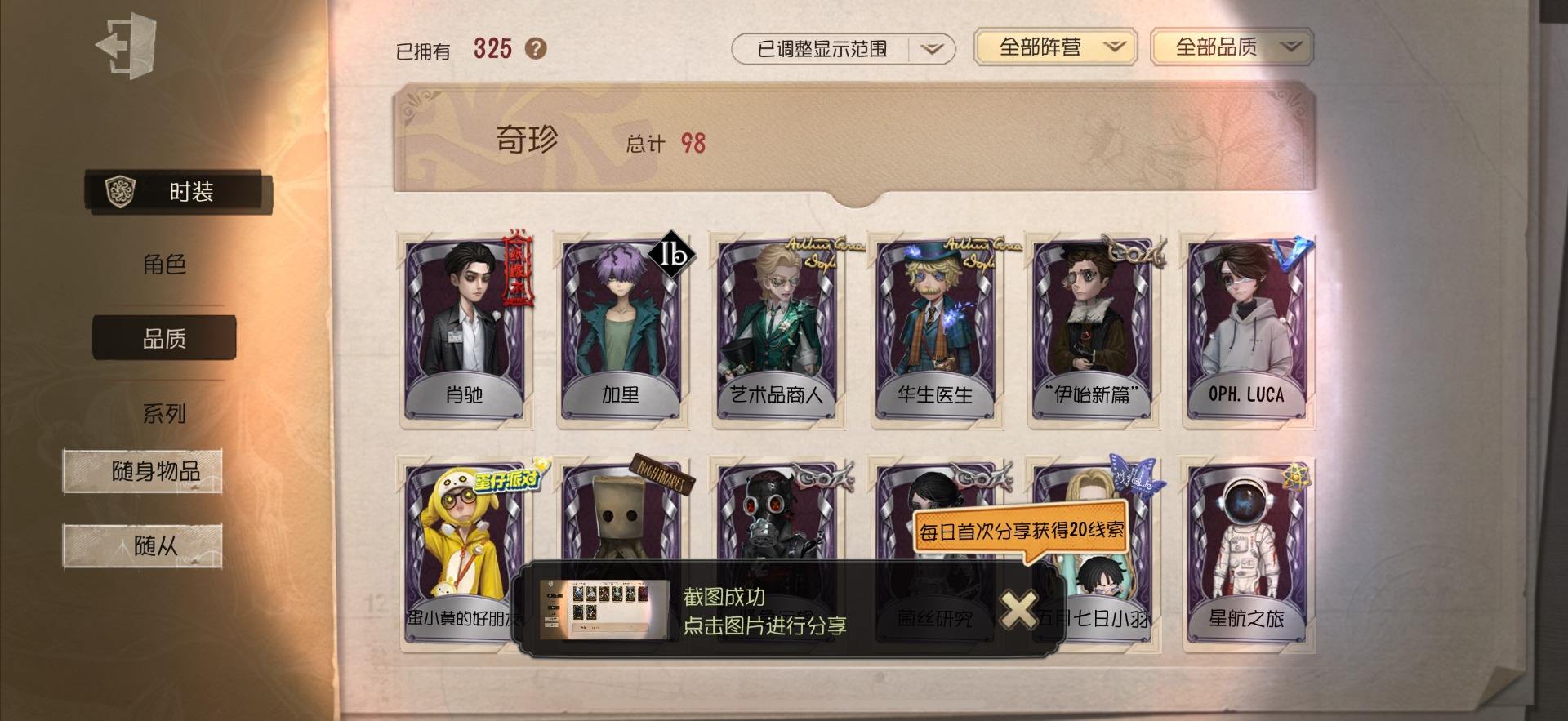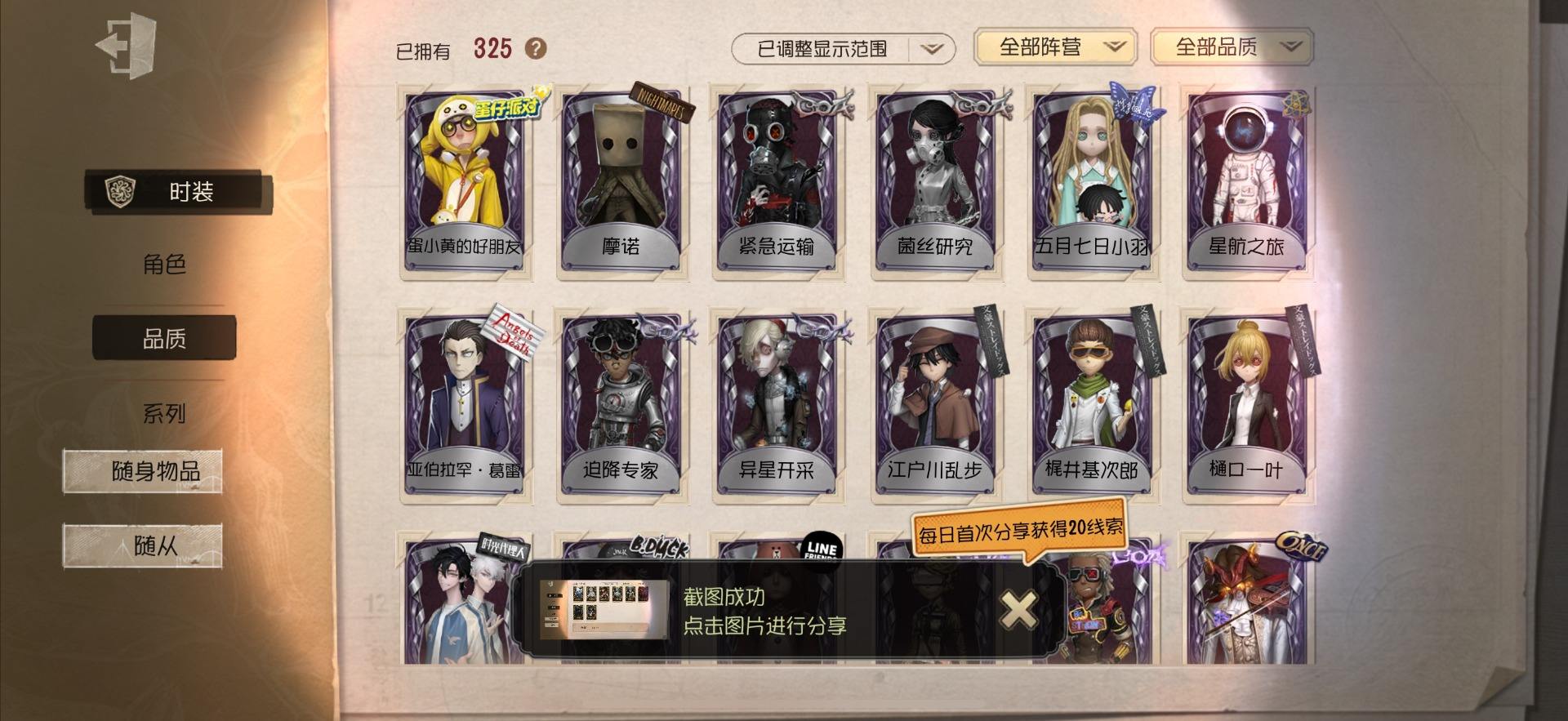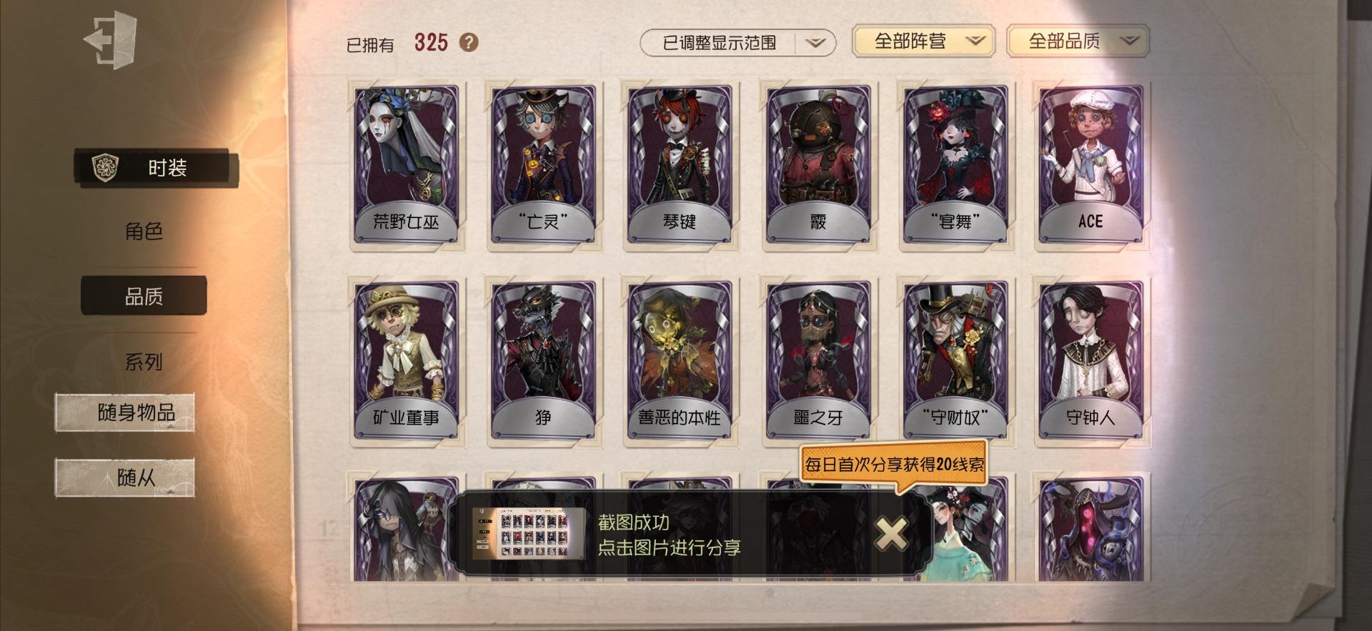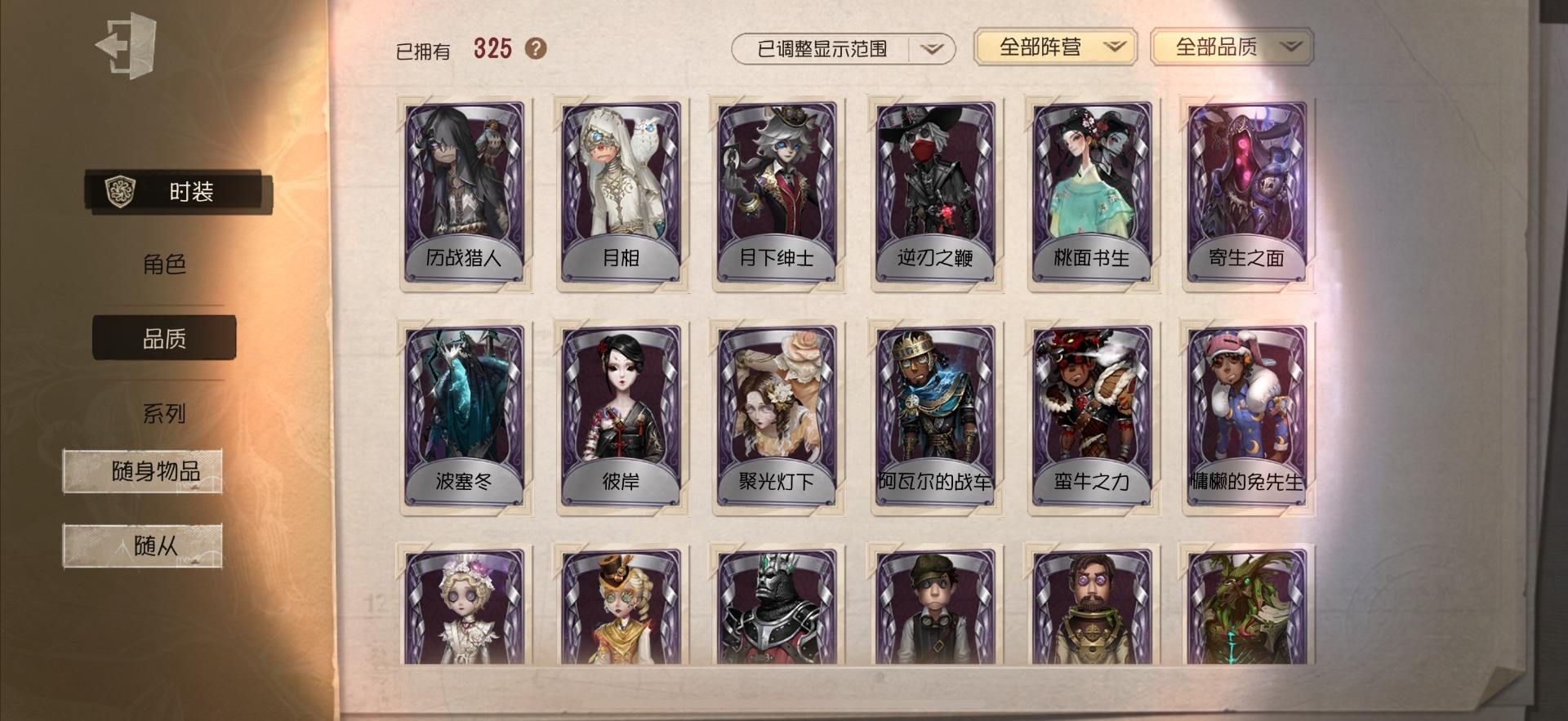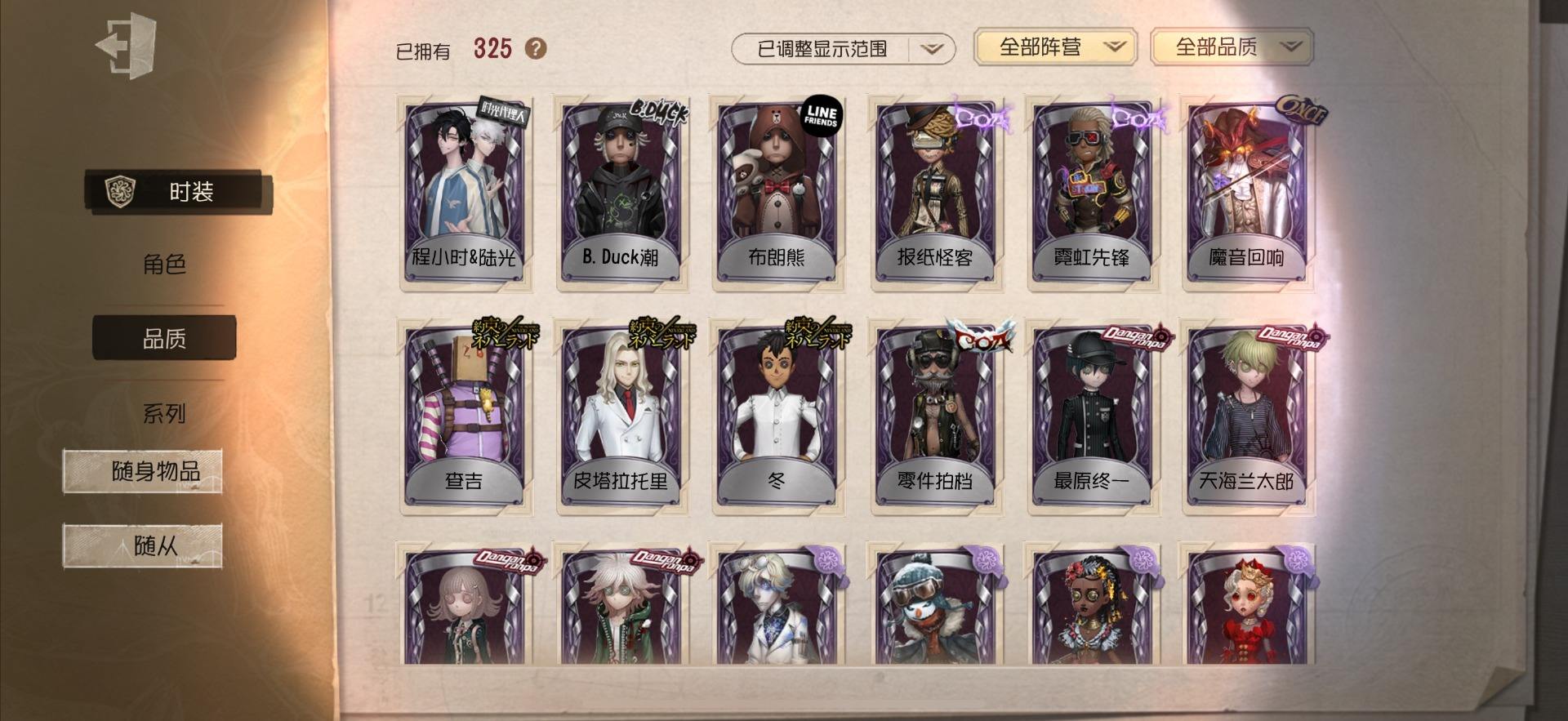 [14028274]OPPO-非账号转移 手机账号 559时装 23金皮 147紫皮 20随从 186随身物品 【时装】:勘探员-盖提亚之遗,爱哭鬼-摩诺,红蝶-壹原侑子,渔女-Chef K,小提琴家-不羁的浪漫,野人-雪原猎人,佣兵-柴郡猫,佣兵-赤井秀一,蜘蛛-花祭,“囚徒”-天海兰太郎,“小女孩”-欧律狄刻,调香师-提炼师,记者-伊布,医生-司药,雕刻家-善忘的海马体,记者-华生小姐,画家-掌中篆记,幸运儿-蛋小黄的好朋友,调香师-Buffy,教授-紧急运输,古董商-菌丝研究,画家-多色印刷,蜘蛛-不息载械,木偶师-义体再构,小说家-“伊始新篇”,击球手-迫降专家,空军-尼德霍格,空军-寒香舞,空军-毛利兰,机械师-不会枯萎的花,机械师-小红帽,26号守卫-蛋壳先生,爱哭鬼-点金,病患-逃罪之人,“杰克”-盛宴伯爵,红夫人-贝拉夫人,红蝶-花嫁,调香师-今夜不再,调香师-Lady K,“小女孩”-滚滚伙伴,医生-罪木蜜柑,幸运儿-苗木诚,幸运儿-拉塔托斯克,孽蜥-窃梦行者,盲女-暗金蛋糕,盲女-吉尔达,梦之女巫-川上富江,“囚徒”-蝰