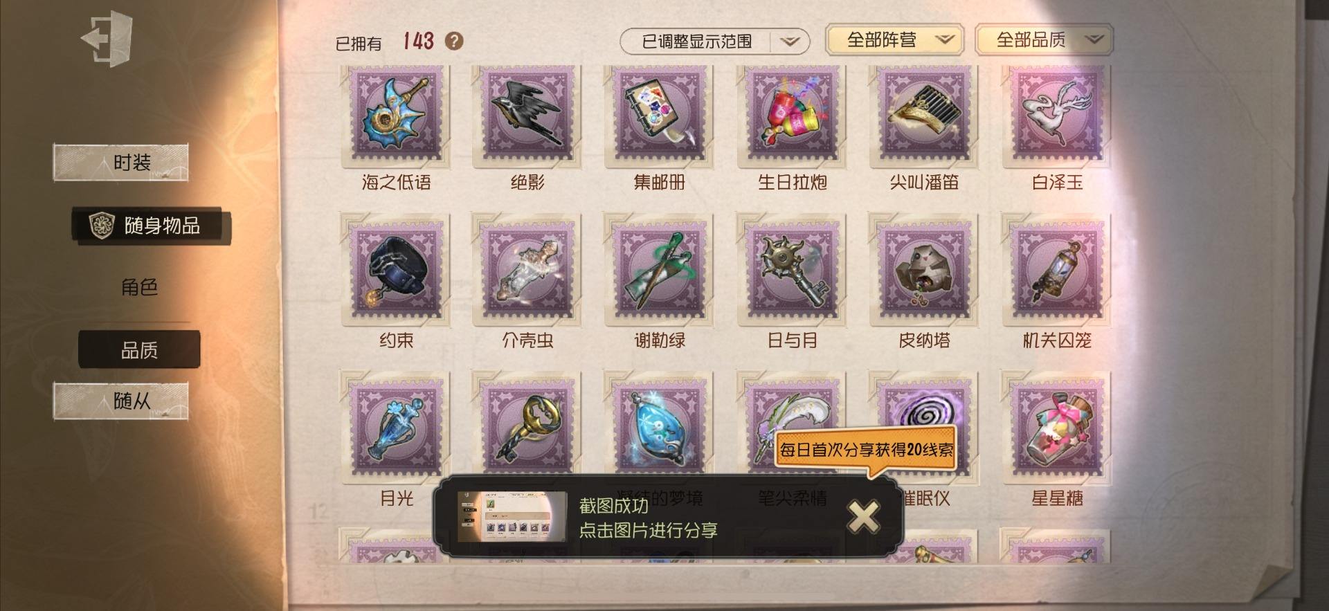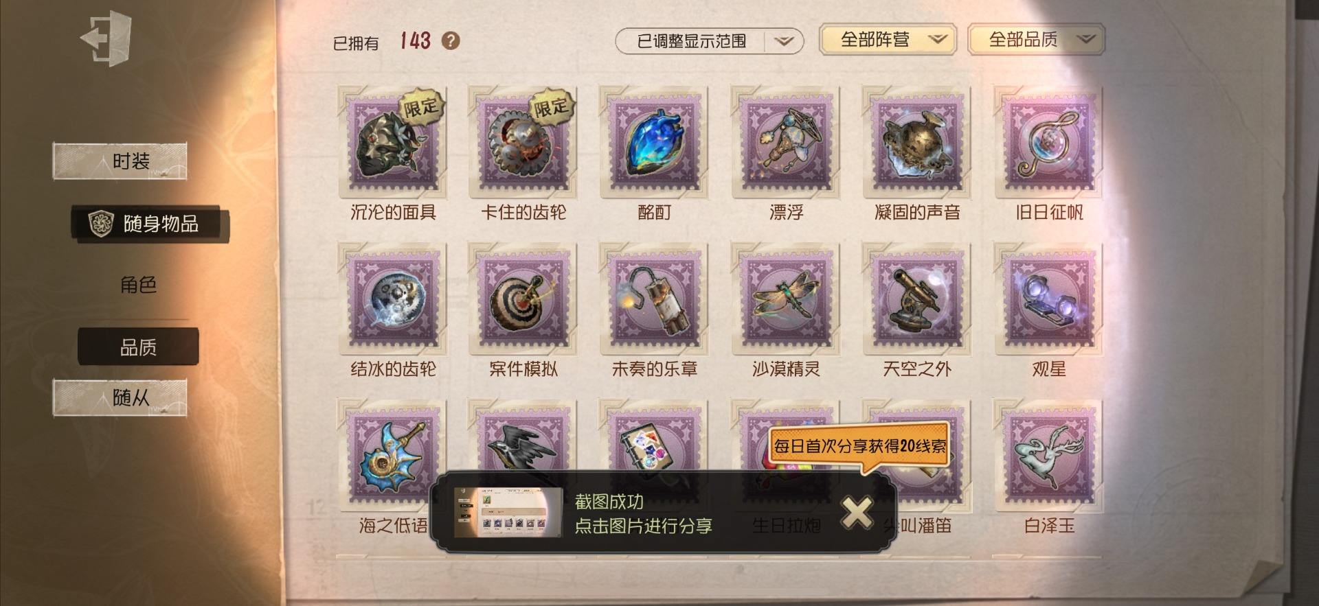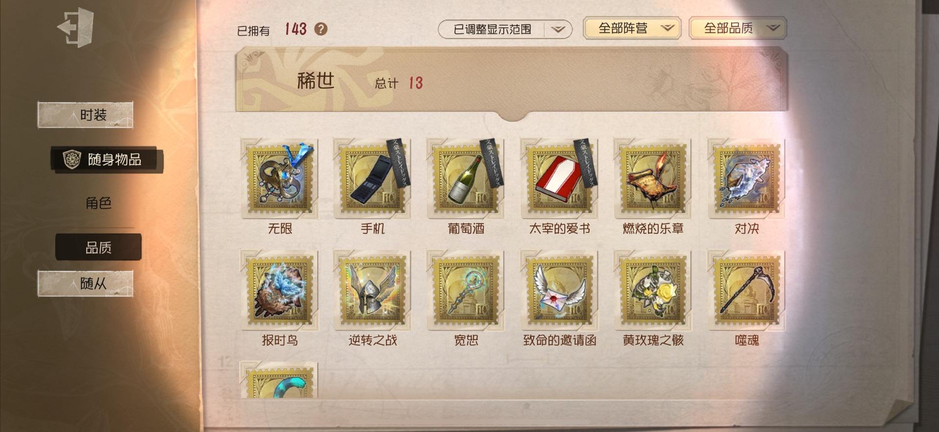 [13699808]安卓官服 手机账号 145时装 8金皮 37紫皮 12随从 37随身物品 【时装】:歌剧演员-幕外之音,作曲家-幽灵帆,爱丽丝·德罗斯-片刻闲暇,渔女-Chef K,调香师-提炼师,咒术师-噩之牙,作曲家-澄明的理性,骑士-Mentor K,骑士-艺术品商人,园丁-郁金香之梦,医生-司药,红蝶-硫火,调香师-Buffy,医生-永生花,小说家-“伊始新篇”,拉拉队员-采集速巡,宿伞之魂-桃面书生,祭司-“朝圣者”,教授-温泉煮酒,祭司-梦之使者,蜡像师-淋浴,昆虫学者-可妮兔,红夫人-女大公,画家-江户川乱步,红夫人-贝拉夫人,红蝶-白无垢,红蝶-更纱,调酒师-海盐特调,舞女-香薰桑拿,调香师-笼中之蝶,调香师-冰上舞蹈,调香师-致命温柔,调香师-今夜不再,调香师-Lady K,小提琴家-孤月骑士,医生-往昔,“使徒”-校监夫人,冒险家-爱丽丝,宿伞之魂-安魂曲【随身物品】:遗忘之花(稀世),沙滩镜(奇珍),月光(奇珍),记忆囚笼(奇珍),酩酊(奇珍),折柳(稀世),法典(奇珍),旧日征帆(奇珍),玫瑰手杖(蓝)(奇珍),长生(奇珍),焚樱(奇珍),玫瑰之下(稀世),完美人偶(稀世),星云瓶(稀世),小人偶(奇珍),“星辰”(稀世),梦魇结晶(稀世),凝露(奇珍),凝聚之水(奇珍),书中蝶(稀世)