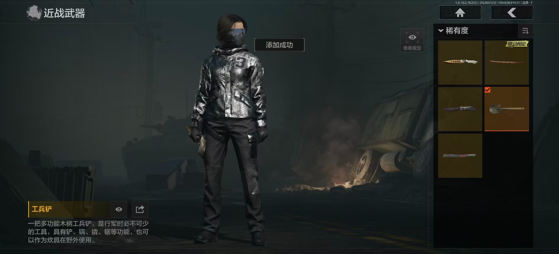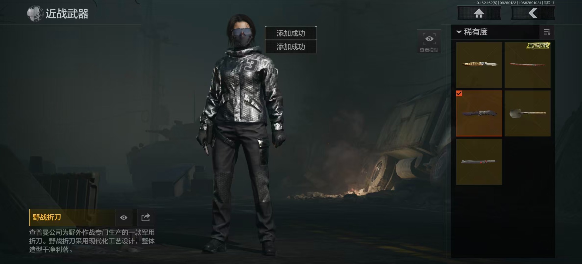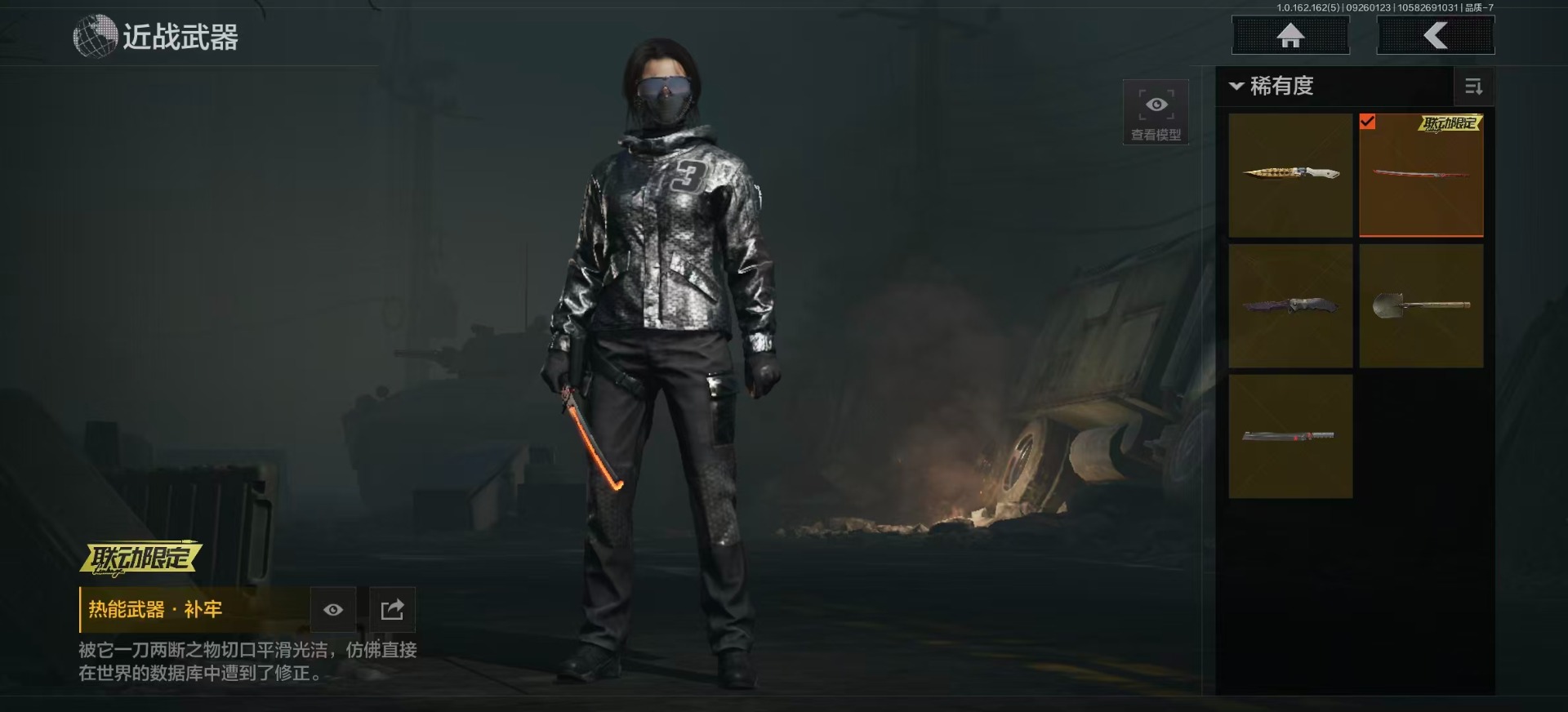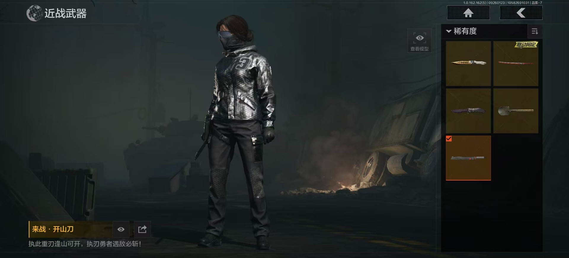 商品描述:库存价值1.6 5近战武器 2金枪皮 可修改实名 【柯恩币数量】:1487【近战武器】:来战·开山刀,热能武器·补牢,赢家匕首,工兵铲,野战折刀【金色枪皮】:旗帜·AEK,浮鳞影青·QBZ192【紫色枪皮】:赢家·F2000,旗帜·SVDS,旗帜·RPK16,火力倾泻·AUG,高塔之内·P90,骑士之剑·AKS74U,高塔之内·VSS,鱼跃丹青·QBU191,竞技·MDR,骤羽尖啸·M4A1,鱼跃丹青·AK102,来战·AK74N【角色装扮(紫)】:鎏金街头套装,都市夜影套装
