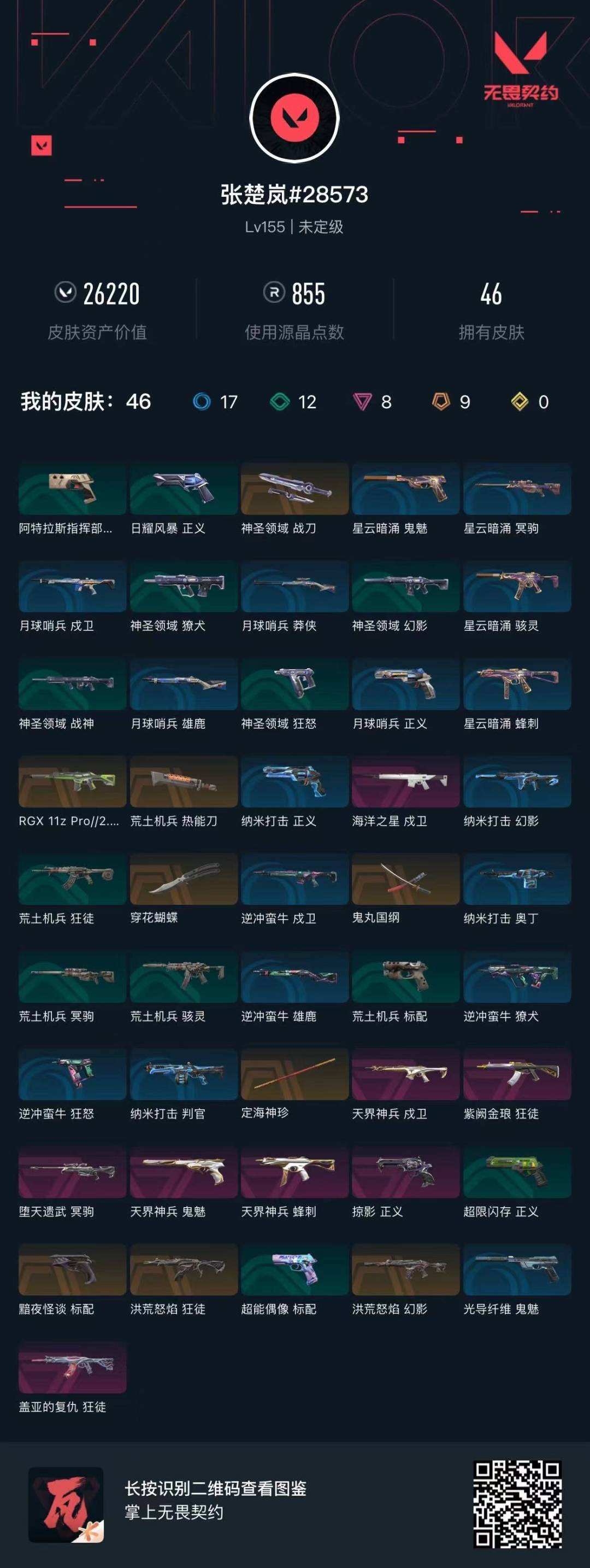 [13644182]8橙皮 1紫皮 23皮肤 19英雄 59卡面 285已用源晶 未定级段位 【近战武器皮肤】:RGX 11z Pro//2.0 蝴蝶刀,匕首-超限闪存,蝴蝶刀-侦察力量【佩枪皮肤】:标配-VCT25xEDG,正义-西部未来【步枪皮肤】:狂徒-掠影,狂徒-混沌序曲,狂徒-塑水宗【挂饰】:鱼骨头挂饰,双城之战小蛋糕挂饰,源晶工程挂饰,神中神挂饰,VCTxEDG挂饰,终章KO小金人挂饰