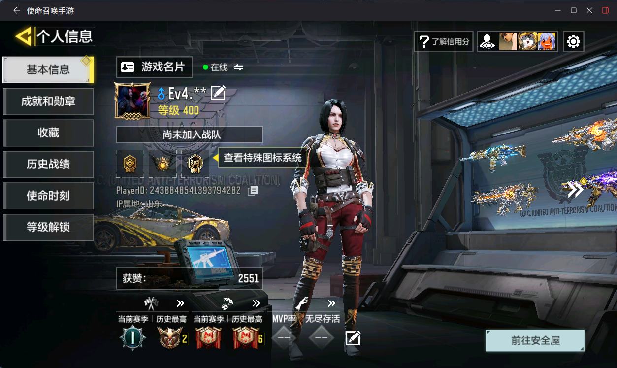 [14832631]400级 2神话 9传说 261史诗 段位铂金 可二次 可修改实名 【神话枪械】:AK117-熔岩,USS9-焕光跃迁【传说枪械】:M4-皇家黑魂,S36-甜心诱惑,FFAR 1-星彩乐手,Locus-红色彗星,Fennec-阿克西斯奇迹,AK47-火箭炮,RPD-一路悠扬,电棍-永恒炽热,CR56-回音律动