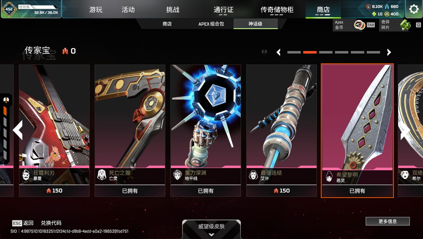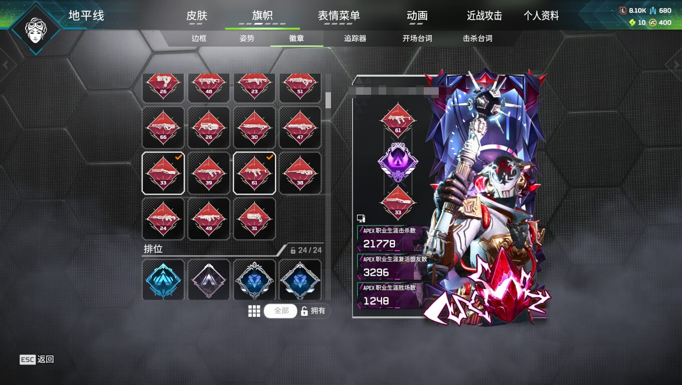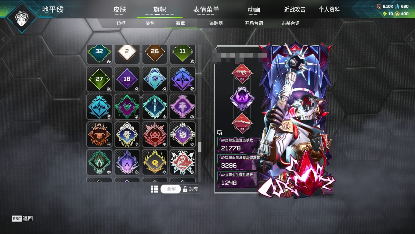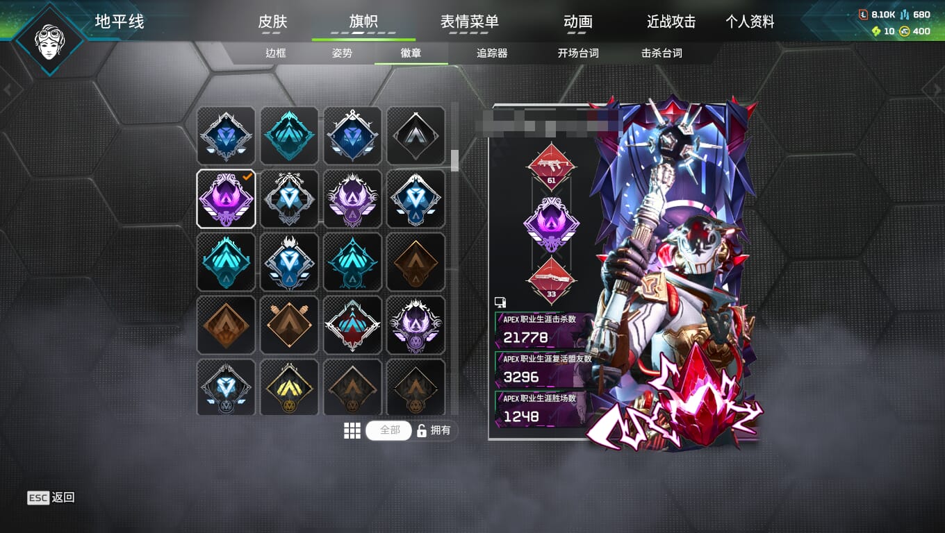 GK6682/【ALGS参赛者徽章】11传/3威望/地平线重力深渊/艾许最强连结/恶灵希望黎明/密客隐秘之刃/亡灵死亡曲线/班加罗尔冷钢/动力小子蝴蝶刀/探路者拳击手套/寻血猎犬渡鸦之咬/恶灵希望的黄昏/APEX蔓延/2级/APEX虚空转移/3级/APEX猎手/3级/718金皮/【排位】3大师/7钻石徽章/9/12/13/15/16/20/24赛季满通/22/23/25下赛季满【枪皮】