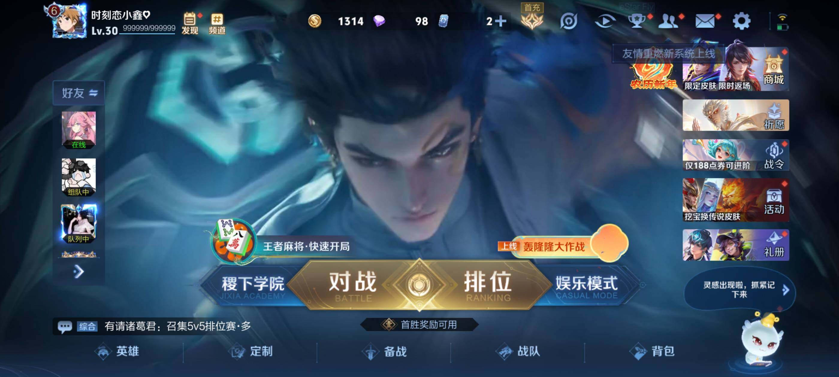【QQ(安卓)】贵族0-贵族积分0万-0英雄-0皮肤 【抢先服】2万金币+回归150级铭文+改名卡