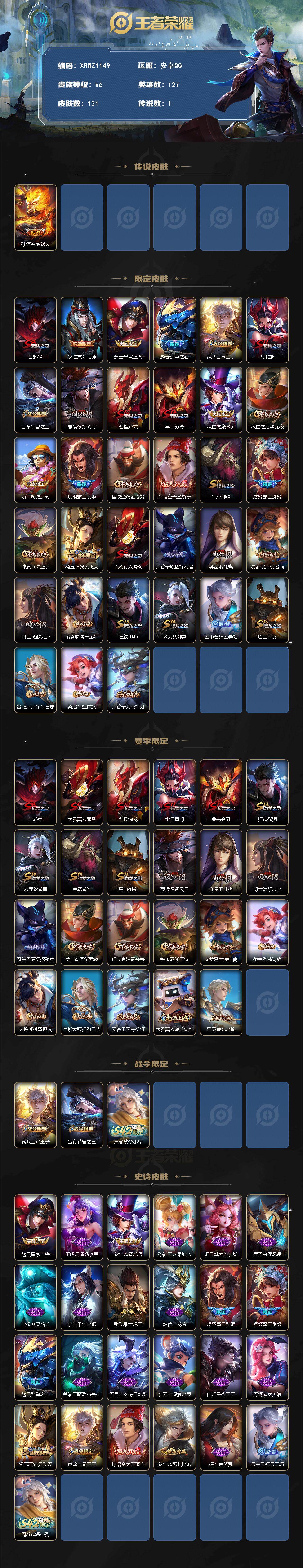 商品描述:[16678634]XR47313-可二次-安卓-Q-V6-永恒钻石IV段位-127英雄-131皮肤-1传说-24史诗【传说皮肤】:孙悟空地狱火【限定皮肤】:白起狰,狄仁杰阴阳师,赵云皇家上将,赵云引擎之心,嬴政白昼王子,芈月重明,吕布猎兽之王,夏侯惇朔风刀,曹操烛龙,典韦穷奇,狄仁杰魔术师,狄仁杰万华元夜,项羽海滩派对,项羽霸王别姬,程咬金演武夺筹,孙悟空大圣娶亲,牛魔御旌,虞姬霸王别姬,钟馗驱傩正仪,杨玉环遇见飞天,太乙真人饕餮,鬼谷子原初探秘者,弈星混沌棋,沈梦溪大漠名商,明世隐疑决卦,裴擒虎擒涛扼浪,狂铁御狮,米莱狄御霄,云中君纤云弄巧,盾山御銮,鲁班大师探海日志,桑启海盐诗旅,鬼谷子天穹祈灯【赛季限定】:白起狰,太乙真人饕餮,曹操烛龙,芈月重明,典韦穷奇,狂铁御狮,米莱狄御霄,牛魔御旌,盾山御銮,夏侯惇朔风刀,弈星混沌棋,明世隐疑决卦,鬼谷子原初探秘者,狄仁杰万华元夜,程咬金演武夺筹,钟馗驱傩正仪,沈梦溪大漠名商,桑启海盐诗旅,裴擒虎擒涛扼浪,鲁班大师探海日志,鬼谷子天穹祈灯,太乙真人谧流熔炉,亚瑟荣光之誓【战令限定】:嬴政白昼王子,吕布猎兽之王,周瑜线条小狗【史诗皮肤】:赵云皇家上将,王昭君偶像歌手,狄仁杰魔术师,孙尚香水果甜心,妲己魅力维加斯,墨子金属风暴,曹操幽灵船长,李白千年之狐,张飞乱世虎臣,韩信白龙吟,项羽霸王别姬,虞姬霸王别姬,赵云引擎之心,兰陵王暗隐猎兽者,百里守约特工魅影,李元芳逐浪之夏,白起星夜王子,阿轲节奏热浪,杨玉环遇见飞天,嬴政白昼王子,孙悟空大圣娶亲,狄仁杰鹰眼统帅,橘右京修罗,云中君纤云弄巧,周瑜线条小狗【其他皮肤】:项羽海滩派对,韩信教廷特使,韩信街头霸王,露娜哥特玫瑰,阿轲爱心护理,达摩大发明家,赵云忍炎影,芈月红桃皇后,白起白色死神,武则天东方不败,扁鹊化身博士,安琪拉玩偶对对碰,孙膑天使之翼,妲己少女阿狸,典韦黄金武士,亚瑟死亡骑士,达摩拳王,花木兰兔女郎,张飞五福同心,甄姬花好人间,宫本武藏万象初新,后羿阿尔法小队,狄仁杰阴阳师,白起狰,钟无艳海滩丽影,太乙真人饕餮,宫本武藏霸王丸,曹操烛龙,王昭君幻想奇妙夜,芈月重明,狂铁命运角斗场,老夫子功夫老勺,典韦穷奇,李白敏锐之力,鬼谷子幻乐之宴,狂铁御狮,安琪拉如懿,米莱狄御霄,吕布猎兽之王,明世隐虹云星官,张良幽兰居士,牛魔御旌,吕布野性能量,盾山御銮,沈梦溪鲨炮海盗猫,姜子