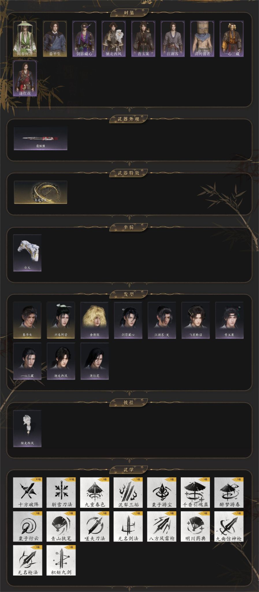 【不可封装陌刀,青丘千岁,瑞鹤仙,戍魂丹心武学,天龙舞火鳞跃天倾奇术,4套258时装,心法6665】 风华值39286 武林造诣(鹅)35775 已用八音窍数量4 未用八音窍数量0 等级100 角色性别【文本】女 【绝境】 【无换绑CD】 【未绑定或可换绑】 【未注册】 【不支持人脸包赔】 【女】 【无】 【ios】 【是】 【是】 【否】 稀有套装2 稀有武器外观1 稀有武学奇术3 套装4 稀有套装:瑞鹤仙,青丘千岁; 稀有武器外观:藏音·万古悲尘; 稀有武学奇术:鳞跃天倾,天龙舞火,戍魂丹心; 套装:白龙,剑影藏心,穿云游雪,蜀戏春;