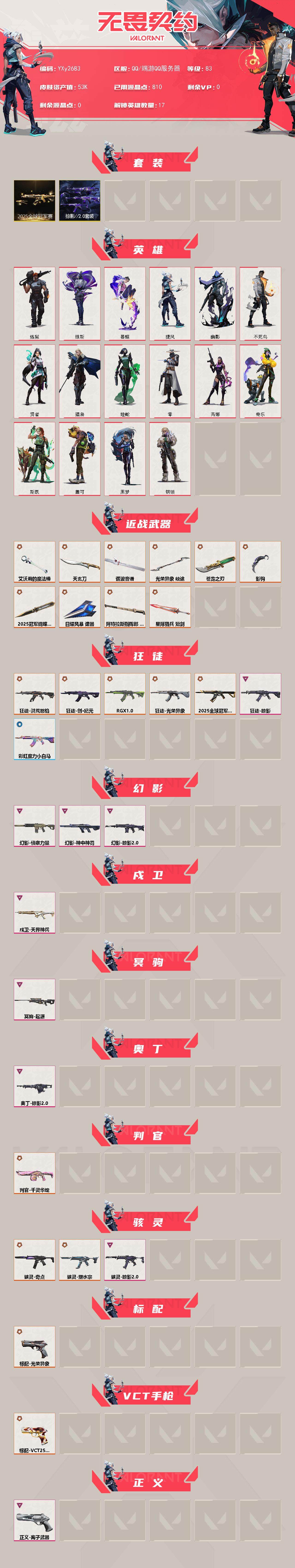【WWC577】卓越*2/皮肤*4/等级*31/段位:白银/炼狱/维斯/暮蝶/捷风/幽影/不死鸟/贤者/猎枭/零/芮娜/狂徒-日冕雄师/骇灵-无限竞技/正义-离子武器/钢弓与箭弦 卡面/钢锁工牌 卡面/无畏契约GO!第一卷:零 卡面/钢锁vs盖可 卡面/代号红色 卡面/新兵报到 卡面/V契约 卡面/无畏契约 卡面/买装还是存钱 喷漆/胜利属于无畏契约 喷漆/GLHF 喷漆/无畏契约 喷漆/无畏契约GO!第一卷 零 挂饰/天外飞客 挂饰/无畏契约 纪念币 挂饰