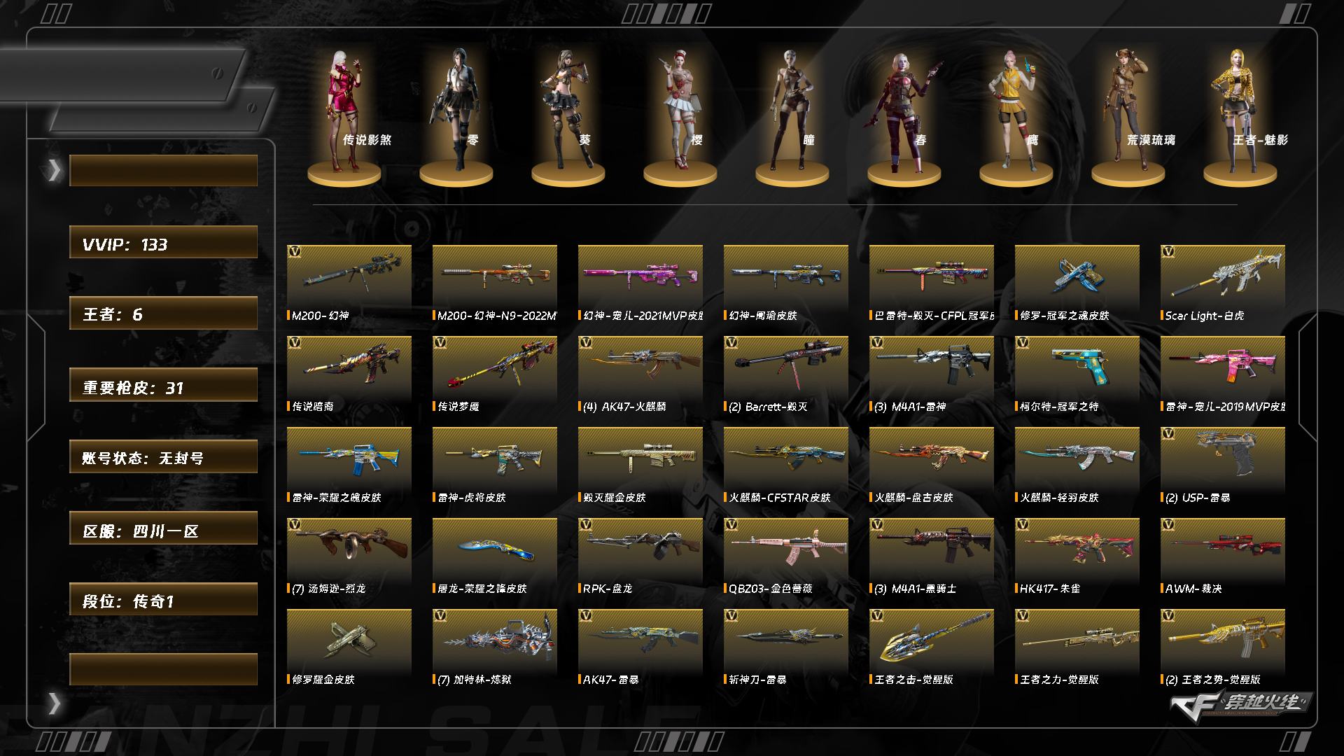 商品描述:[16750500]XH5358/西部/四川一区/可排位/【传奇1】/Lv.102 荣耀元帅/VIP6/133V/【五传说】/【四防】/传说影煞/传说灵眸/传说梦魇/传说暗裔/传说破晓/【幻神三件套】/幻神/幻神音效卡/幻神宠儿/幻神N9/幻神周瑜/王者星霆/QBZ金色蔷薇/白虎/白虎霓虹机甲/朱雀/青龙/法玛斯天戎/QBZ天罚/白虎电玩蓝兔/金色蔷薇古蛇迷踪/雷暴套/柯尔特冠军之特/USP雷暴/*2/炽芒蝶刃/【裁决三件套】/裁决/裁决音效卡/裁决巅峰荣耀/裁决叶芒苍灵/【生化】/6炼狱/6烈龙/3修罗/斯泰尔蝴蝶/七套雷暴雷/【音效卡】/绝迹语音包/雷神音效卡/火麒麟音效卡/毁灭音效卡/碧霄极光音效卡/炼狱百战金芒庆典舞曲音效卡/【枪皮】/毁灭BEAN2020MVP/毁灭神秘黑洞/火麒麟盘古/雷神神秘按键/雷神宠儿/荣耀之魄/雷神虎将/【四防角色】/王者魅影/王者炫/【角色】/零/葵/樱/瞳/春/鹰/荒漠琉璃/王者瞳闭月羞花/葵阿尔法武装/奇洋探员/乔伊教练/【小人枪】/雷神精英刀锋/火麒麟灵狐/朱雀蛇隐宗/雷神小红/炽火炎龙/【挑战】/挑战九阶段全满/爆炎激光超越MAX2+1/集束激光超越MAX3+2/【道具】/永久烟雾头/护目镜/超级背包/各种戒指/各种光效/各种玩偶/永久AC/永久雷包/细节看图/【此账号未被封过十年】