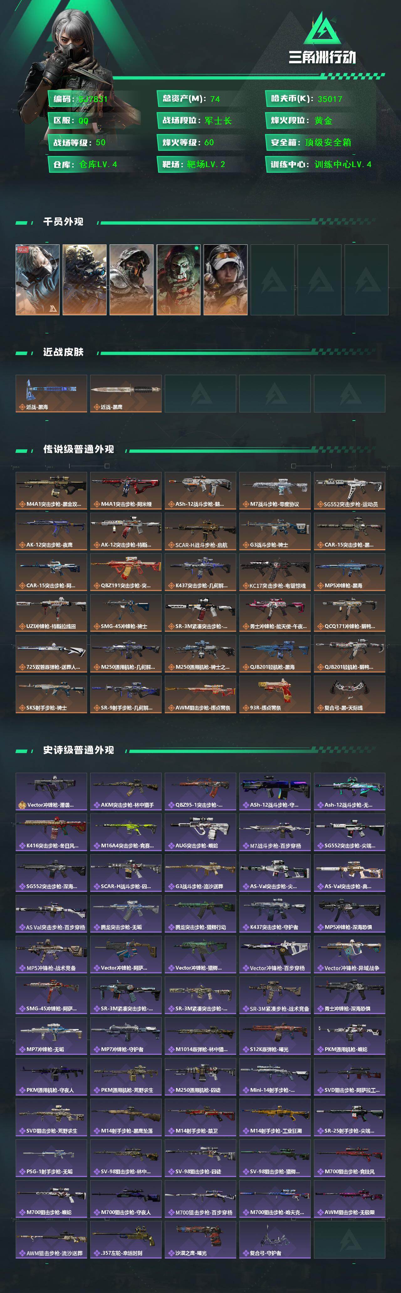 TD10698/QQ区/可二次/钱包注销/【总资产:73.9M+近战怜悯+近战黑海+K416突击步枪-命运(极品C)+M7战斗步枪-棱镜攻势S2(优品A)+M4A1突击步枪-棱镜攻势(优品B)+SCAR-H战斗步枪-电玩高手(优品C)+QBZ95-1突击步枪-王牌之剑(优品C)+红狼蚀金玫瑰+骇爪水墨云+骇爪维什戴尔+牧羊人街头之王+威龙壮志凌云+无名夜鹰+威龙铁面判官】哈夫币:19W,武器皮肤256;烽火60级:铂金Ⅲ,战场:军士长Ⅱ,【安全箱】进阶安全箱;【特勤处等级】仓库LV.8,靶场LV.6,训练中心LV.7;【捆绑包9】怜悯捆绑包,黑海捆绑包,维什戴尔捆绑包,鹅鸭杀捆绑包,蚀金玫瑰捆绑包,水墨云图捆绑包,曙光捆绑包,蝮蛇捆绑包,禁卫捆绑包;【干员皮肤7】骇爪维什戴尔,骇爪水墨云图,红狼蚀金玫瑰,牧羊人街头之王,威龙壮志凌云,无名夜鹰,威龙铁面判官;【典藏皮肤】K416突击步枪-命运(极品C),M7战斗步枪-棱镜攻势S2(优品A),M4A1突击步枪-棱镜攻势(优品B),SCAR-H战斗步枪-电玩高手(优品C),QBZ95-1突击步枪-王牌之剑(优品C);【近战皮肤】近战武器-怜悯,近战武器-黑海,近战武器-黑鹰;【步枪皮肤】M4A1突击步枪-棱镜攻势,SCAR-H战斗步枪-电玩高手,K416突击步枪-命运,QBZ95-1突击步枪-王牌之剑,M7战斗步枪-棱镜攻势S2,M4A1突击步枪-蚀金玫瑰,QBZ95-1突击步枪-破军,ASh-12战斗步枪-怜悯,ASh-12战斗步枪-鹅鸭杀,M7战斗步枪-神秘艺术,M7战斗步枪-怜悯,M7战斗步枪-维京,AK-12突击步枪-夜鹰,SCAR-H战斗步枪-启航,SCAR-H战斗步枪-水墨云图,SCAR-H战斗步枪-铁艺苍穹,G3战斗步枪-骑士,CAR-15突击步枪-阿米娅,ASVal突击步枪-蛇年祥瑞,腾龙突击步枪-死神玫瑰,K437突击步枪-极速狂飙,AK-12突击步枪-原型机,M4A1突击步枪-竞技风,M4A1突击步枪-特勤执行,AKM突击步枪-林中猎手,QBZ95-1突击步枪-曙光,QBZ95-1突击步枪-ACE,ASh-12战斗步枪-守夜人,K416突击步枪-竞技风,AUG突击步枪-蝮蛇,AUG突击步枪-特勤执行,M7战斗步枪-禁卫,SG552突击步枪-尖端治疗,SG552突击步枪-深海恐惧,SCAR-H战斗步枪-国风,SCAR-H战斗步枪-猎鳄行动,SCAR-H战斗步枪-危险实验,G3战斗步枪-阿萨拉工艺,G3战斗步枪-战场英杰,PTR-32突击步枪-ACE,ASVal突击步枪-刀锋,ASVal突击步枪-尖端治疗;【冲锋枪皮肤】MP5冲锋枪-黑海,P90冲锋枪-神秘艺术,SMG-45冲锋枪-骑士,QCQ171冲锋枪-鹅鸭杀,MP5冲锋枪-瑰丽风尚,MP5冲锋枪-深海恐惧,MP5冲锋枪-战术竞备,Vector冲锋枪-阿萨拉文明,Vector冲锋枪-红色彗星,UZI冲锋枪-危险实验,SR-3M紧凑突击步枪-英雄,勇士冲锋枪-深海恐惧,勇士冲锋枪-工业狂潮,QCQ171冲锋枪-禁卫;【射手步枪皮肤】SR-25射手步枪-水墨云图,SVD狙击步枪-阿萨拉工艺,SVD狙击步枪-暗夜猎手,M14射手步枪-禁卫,SKS射手步枪-ACE,SR-25射手步枪-尖端治疗;【狙击步枪皮肤】R93狙击步枪-维什戴尔,M700狙击步枪-竞技风,M700狙击步枪-阿萨拉工艺,M700狙击步枪-蝮蛇,M700狙击步枪-守夜人,AWM狙击步枪-无极限;【霰弹枪皮肤】M1014霰弹枪-林中猎手,S12K霰弹枪-曙光;【轻机枪皮肤】M250通用机枪-骑士之心,QJB201轻机枪-黑海,QJB201轻机枪-鹅鸭杀,PKM通用机枪-蝮蛇,PKM通用机枪-英雄,PKM通用机枪-守夜人,M249轻机枪-维京;【手枪皮肤】QSZ92G-风林火山,沙漠之鹰-曙光,93R-博士;【挂饰28】毁灭之源,挂饰-黄金坦克,挂饰-蚀金玫瑰,挂饰-怜悯,挂饰-黑海,挂饰-维什戴尔,挂饰-激素枪,挂饰-三联装手炮,挂饰-飓风行动,挂饰-坦克,挂饰-保持专注,挂饰-枪匠,挂饰-Relink,挂饰-维京,挂饰-王牌座驾,挂饰-春结,挂饰-小羊,挂饰-大白鹅,挂饰-启程,持剑者,重装记者,演出导演,诡影狙击兵,诡影喷火兵;【载具71】M1A4坦克-纷争,突击车-纷争,步战车-纷争,防空车-纷争,M1A4坦克-狮王,M1A4坦克-飓风行动,M1A4坦克-鹰击长空,突击车-鹰击长空,M1A4坦克-无瑕,步战车-无暇,M1A4坦克-黑骑士,步战车-鹰击长空,防空车-鹰击长空,步兵车-黑骑士,防空车-黑骑士,步兵车-卦象,防空车-卦象,步战车--克苏鲁,轮式突击炮-暗夜行动,轮式突击炮-克苏鲁,轮式突击炮-荣耀,突击直升机-纷争,突击直升机-飓风行动,突击直升机-鹰击长空,突击直升机-无瑕,侦察直升机-卦象,突击直升机-黑骑士,侦察直升机-克苏鲁,突击直升机-暗夜行动,步战车-炭黑蜂窝,防空车-炭黑蜂窝,M1A4坦克-地平线,步战车-黄蜂,防空车-黄蜂,M1A4坦克-黄蜂,全地形车-猎虎,步兵车-猎虎,防空车-猎虎,防空车-酒红,全地形车-童趣,轮式突击炮-虎纹,M1A4坦克-几何碎片,步战车-几何碎片,防空车-几何碎片,步战车-生命线,防空车-生命线,突击直升机-地平线,突击直升机-黄蜂,突击直升机-猎虎,防空车-雪地迷彩,全地形车-森林迷彩,步战车-森林迷彩,防空车-森林迷彩,突击车-森林迷彩,M1A4坦克-森林迷彩,步战车-夜间迷彩,防空车-夜间迷彩,M1A4坦克-夜间迷彩,防空车-沙漠迷彩,突击车-沙漠迷彩,全地形车-沙漠迷彩,突击车-冷钢,M1A4坦克-赤色军团,步战车-赤色军团,防空车-赤色军团,M1A4坦克-护林人,突击车-寒梅,M1A4坦克-战痕,侦察直升机-夜间迷彩,侦察直升机-沙漠迷彩,突击直升机-赤色军团;【货币】38三角币,541三角卷