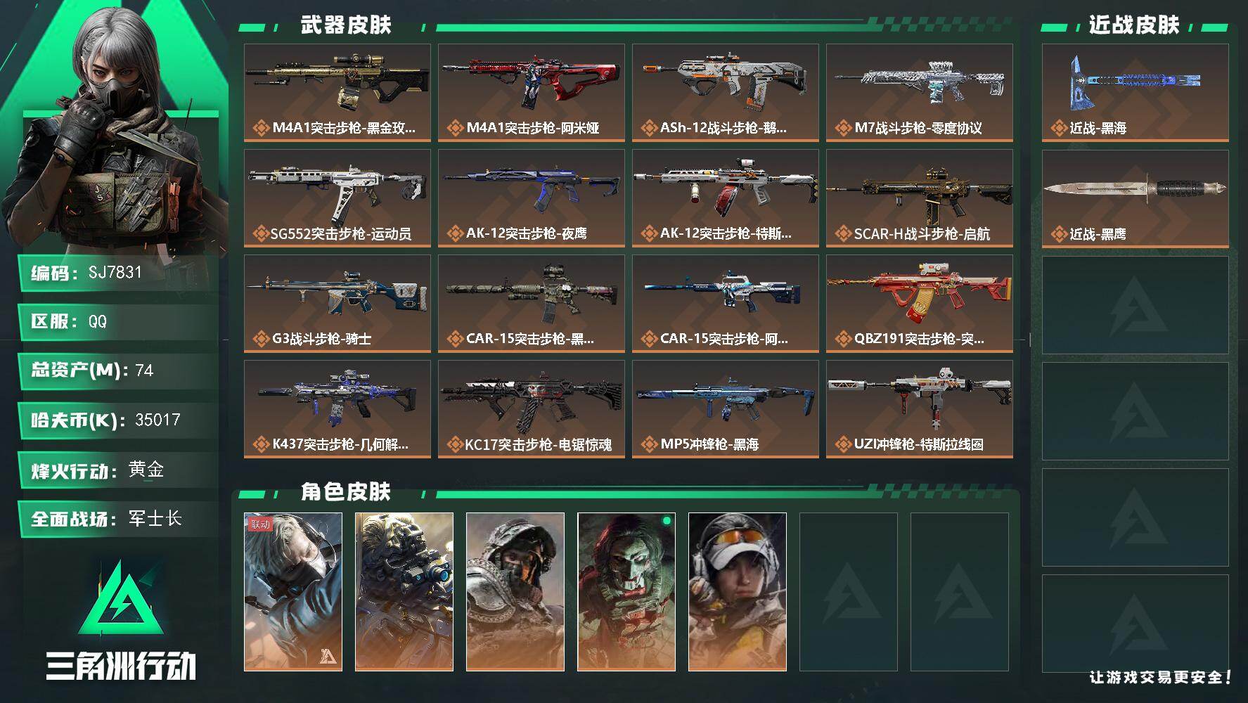 TD10744/QQ区/可二次/钱包注销/【总资产:196.3M+S7顶级安全箱+近战北极星黑海+M7战斗步枪-棱镜攻势S2(优品S)+骇爪维什戴尔+骇爪水墨云图+红狼蚀金玫瑰+蜂医送葬人无题密令+无名夜鹰+红狼电锯惊魂+深蓝不破誓约】哈夫币:101W,武器皮肤264;烽火60级:黑鹰Ⅳ,战场:尉官Ⅳ,【安全箱】S7顶级安全箱;【特勤处等级】仓库LV.9,靶场LV.7,训练中心LV.7;【捆绑包8】黑海捆绑包,北极星捆绑包,维什戴尔捆绑包,鹅鸭杀捆绑包,蚀金玫瑰捆绑包,电锯惊魂干员捆绑包,特斯拉线圈捆绑包,捞点薯条捆绑包;【干员皮肤7】骇爪维什戴尔,骇爪水墨云图,红狼蚀金玫瑰,蜂医送葬人无题密令,无名夜鹰,红狼电锯惊魂,深蓝不破誓约;【典藏皮肤】M7战斗步枪-棱镜攻势S2(优品S);【近战皮肤】近战武器-黑海,近战武器-北极星,近战武器-黑鹰;【步枪皮肤】M7战斗步枪-棱镜攻势S2,M4A1突击步枪-阿米娅,M4A1突击步枪-蚀金玫瑰,ASh-12战斗步枪-鹅鸭杀,SG552突击步枪-运动员,AK-12突击步枪-夜鹰,AK-12突击步枪-特斯拉线圈,SCAR-H战斗步枪-启航,SCAR-H战斗步枪-水墨云图,CAR-15突击步枪-阿米娅,CAR-15突击步枪-黑鹰坠落,腾龙突击步枪-捞点薯条,K437突击步枪-北极星,KC17突击步枪-电锯惊魂,K416突击步枪-潜袭者,AKM突击步枪-林中猎手,ASh-12战斗步枪-守夜人,ASh-12战斗步枪-无极限,M16A4突击步枪-竞赛选手,AUG突击步枪-蝮蛇,SG552突击步枪-尖端治疗,SG552突击步枪-深海恐惧,SCAR-H战斗步枪-囚徒,G3战斗步枪-哈夫克警备,G3战斗步枪-流沙送葬,PTR-32突击步枪-英雄,PTR-32突击步枪-工业狂潮,ASVal突击步枪-尖端治疗,ASVal突击步枪-典狱官,ASVal突击步枪-百步穿杨,腾龙突击步枪-无垢,腾龙突击步枪-猎鳄行动,K437突击步枪-守护者;【冲锋枪皮肤】MP5冲锋枪-黑海,UZI冲锋枪-特斯拉线圈,SMG-45冲锋枪-骑士,SR-3M紧凑突击步枪-特斯拉线圈,勇士冲锋枪-能天使-午夜邮差,QCQ171冲锋枪-北极星,QCQ171冲锋枪-鹅鸭杀,SMG-45冲锋枪-飓风行动,Vector冲锋枪-潜袭者,MP5冲锋枪-深海恐惧,MP5冲锋枪-战术竞备,MP5冲锋枪-竞技风,P90冲锋枪-紧急戒备,SR-3M紧凑突击步枪-荒野求生,SR-3M紧凑突击步枪-战术竞备,勇士冲锋枪-深海恐惧,勇士冲锋枪-工业狂潮,MP7冲锋枪-无垢,MP7冲锋枪-守护者;【射手步枪皮肤】M14射手步枪-电锯惊魂,Mini-14射手步枪-守护者,SVD狙击步枪-阿萨拉工艺,SVD狙击步枪-暗夜猎手,SVD狙击步枪-荒野求生,M14射手步枪-黑鹰坠落,SR-25射手步枪-尖端治疗,PSG-1射手步枪-无垢;【狙击步枪皮肤】R93狙击步枪-维什戴尔,AWM狙击步枪-捞点薯条,SV-98狙击步枪-林中猎手,SV-98狙击步枪-囚徒,SV-98狙击步枪-猎鳄行动,M700狙击步枪-竞技风,M700狙击步枪-蝮蛇,M700狙击步枪-守夜人,AWM狙击步枪-无极限;【霰弹枪皮肤】725双管霰弹枪-送葬人-无题密令,M870霰弹枪-飓风行动,M1014霰弹枪-林中猎手,S12K霰弹枪-曙光;【轻机枪皮肤】M250通用机枪-骑士之心,QJB201轻机枪-黑海,QJB201轻机枪-鹅鸭杀,PKM通用机枪-守夜人,PKM通用机枪-荒野求生,QJB201轻机枪-OldHabits;【手枪皮肤】93R-捞点薯条,.357左轮-幸运时刻,沙漠之鹰-曙光;【复合弓皮肤】复合弓-黑-天际线,复合弓-守护者;【挂饰29】毁灭之源,窃风密探,牛角威龙,麦小鼠,火箭玫瑰,麦小鼠,牛角威龙,挂饰-蚀金玫瑰,挂饰-黑海,挂饰-黑,挂饰-维什戴尔,挂饰-北极星,挂饰-能天使,挂饰-三联装手炮,挂饰-磁吸炸弹,挂饰-枪匠,挂饰-彩蛋,挂饰-小羊,挂饰-特斯拉线圈,挂饰-阿米娅,挂饰-来点薯条,挂饰-晶石幻想,挂饰-大白鹅,挂饰-启程,诡影狙击兵,暗行哨兵,崩岩重炮;【载具25】M1A4坦克-烈焰,步战车-警戒线,轮式突击炮-荣耀,步战车-鳄鳄出击,步战车-钢铁洪流,轮式突击炮-钢铁洪流,步战车-地平线,步战车-几何碎片,步战车-生命线,防空车-生命线,M1A4坦克-哈夫克重工,防空车-斑马,轮式突击炮-巅峰竞赛,GTQ35坦克-巅峰竞赛,突击直升机-原始伪装,侦察直升机-巅峰竞赛,全地形车-森林迷彩,防空车-赤色军团,M1A4坦克-护林人,轮式突击炮-护林人,突击车-寒梅,轮式突击炮-寒梅,GTQ35坦克-寒梅,M1A4坦克-战痕,突击直升机-寒梅;【货币】5三角币,155三角卷