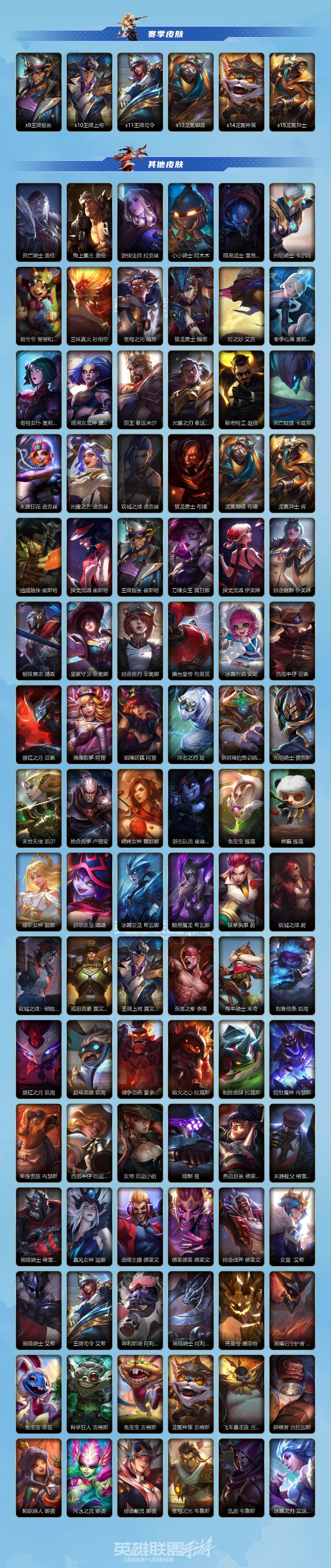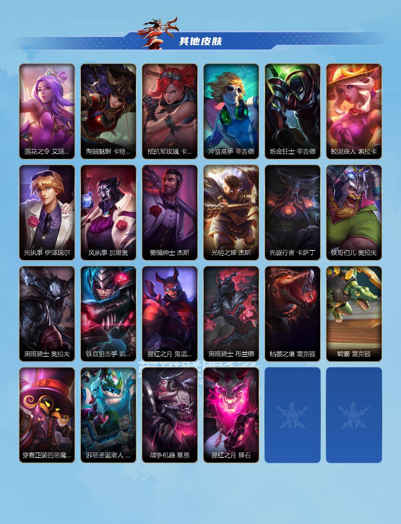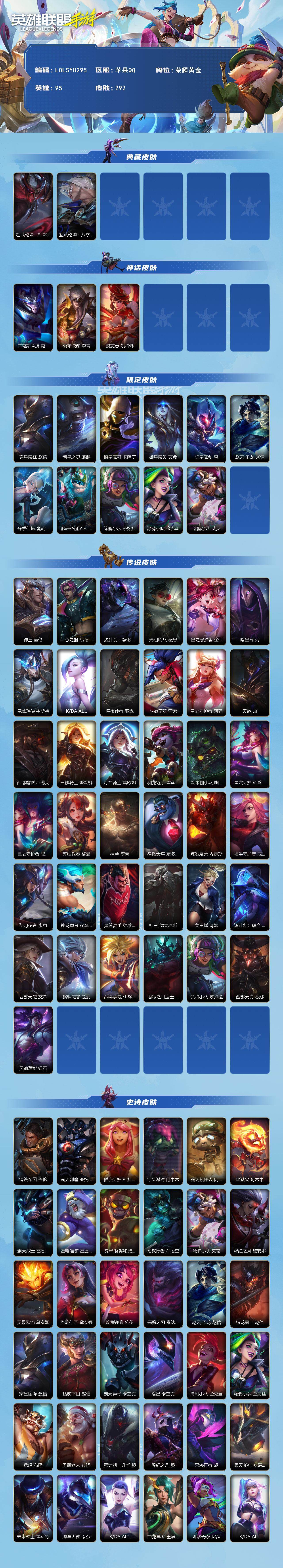 商品描述:【LOLSYH295】95英雄/292皮肤/荣耀黄金/超武乾坤:虹影 劫/超武乾坤:孤拳 瑟提/海克斯科技 嘉文四世/乘龙破渊 李青/蝶恋春 凯特琳/穿星魔锋 赵信/创星之灵 璐璐/掠星魔刃 卡萨丁/御星魔矢 艾希/斩星魔剑 易/赵云 子龙 赵信/冬季仙境 奥莉安娜/邪恶圣诞老人 维迦/涂鸦小队 莎弥拉/涂鸦小队 金克丝/涂鸦小队 艾克/神王 盖伦/心之钢 凯隐/源计划:净化 薇恩/光明哨兵 薇恩/星之守护者 金克丝/暗星尊 烬/星域游侠 崔斯特/K/DA ALL OUT 萨勒芬妮/黑夜使者 亚索/斗魂无双 亚索/星之守护者 阿狸/天煞 劫/西部魔影 卢锡安/日蚀骑士 蕾欧娜/月蚀骑士 蕾欧