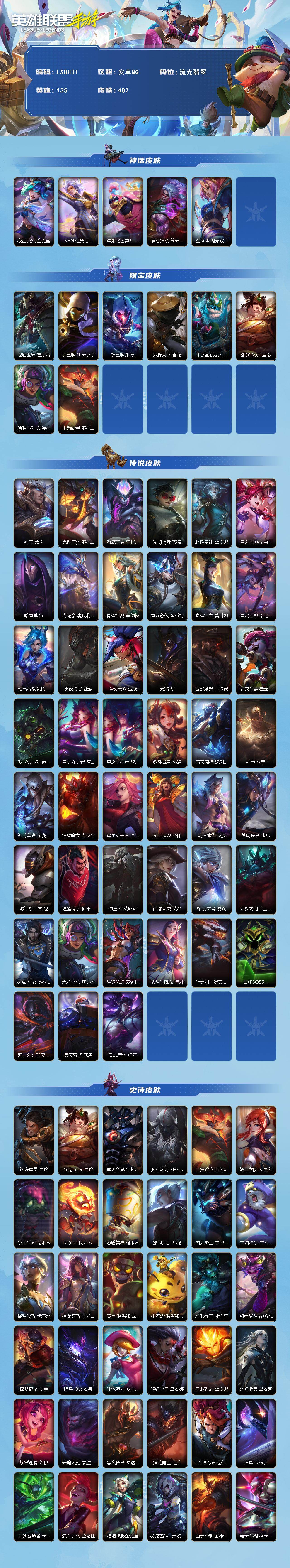 商品描述:【LSQH31】135英雄/407皮肤/6神话/45传说/211史诗/流光翡翠/夜星流火 金克丝/KBG 任凭浪起 破浪 菲奥娜/巡游踏云霄! 墨菲特/满弓镇魂 箭无虚发 韦鲁斯/至臻 斗魂无双 艾瑞莉娅/地底世界 崔斯特/掠星魔刃 卡萨丁/斩星魔剑 易/养蜂人 辛吉德/邪恶圣诞老人 维迦/张辽 文远 盖伦/涂鸦小队 莎弥拉/山海绘卷 亚托克斯/神王 盖伦/光影巨翼 亚托克斯/海魔至尊 亚托克斯/光明哨兵 薇恩/北极星神 黛安娜/星之守护者 金克丝/暗星尊 烬/青花瓷 奥瑞利安·索尔/春晖神裔 辛德拉/星域游侠 崔斯特/春晖神女 莫甘娜/星之守护者 阿卡丽/幻灵特战队长 菲奥娜/黑夜使者 亚
