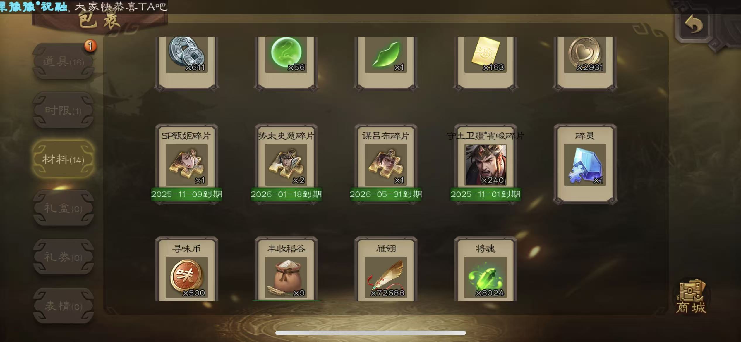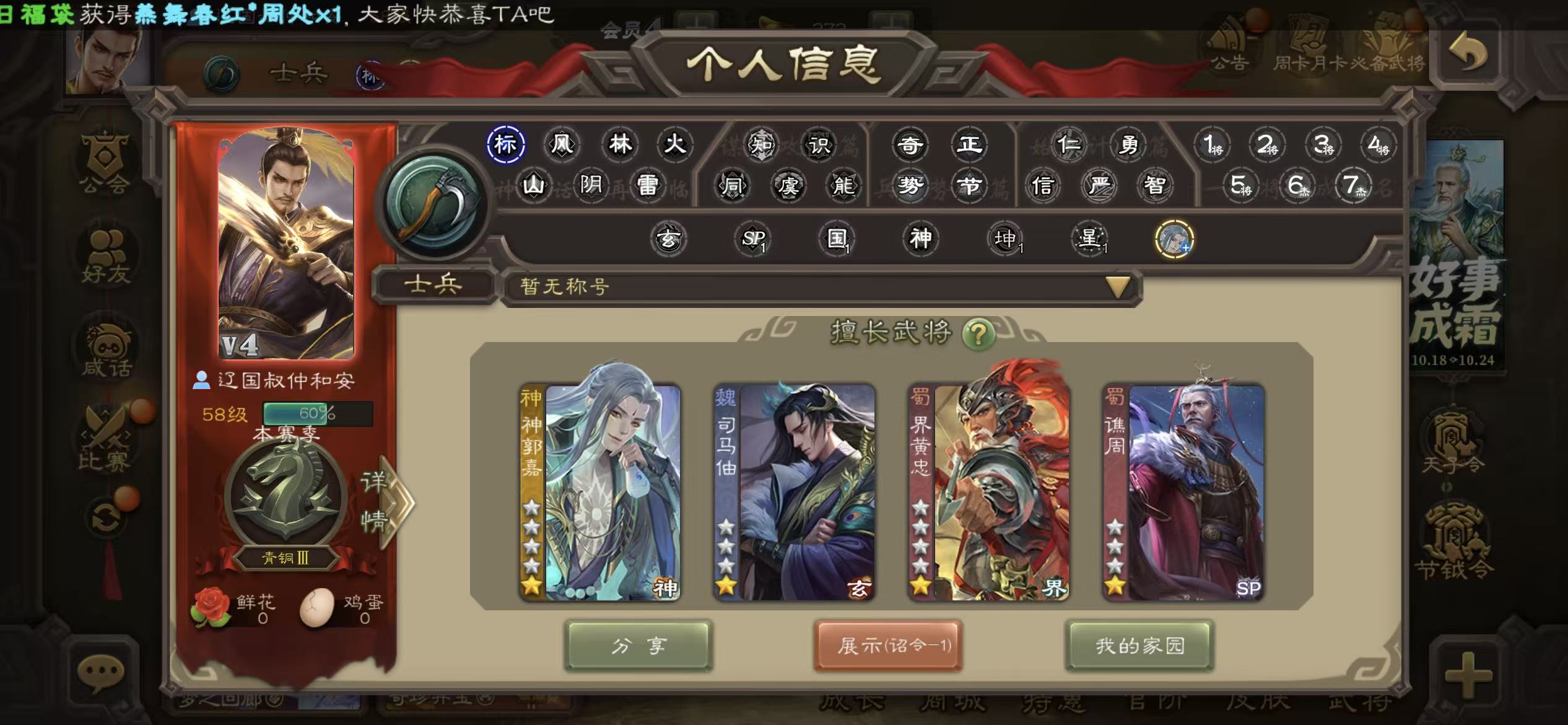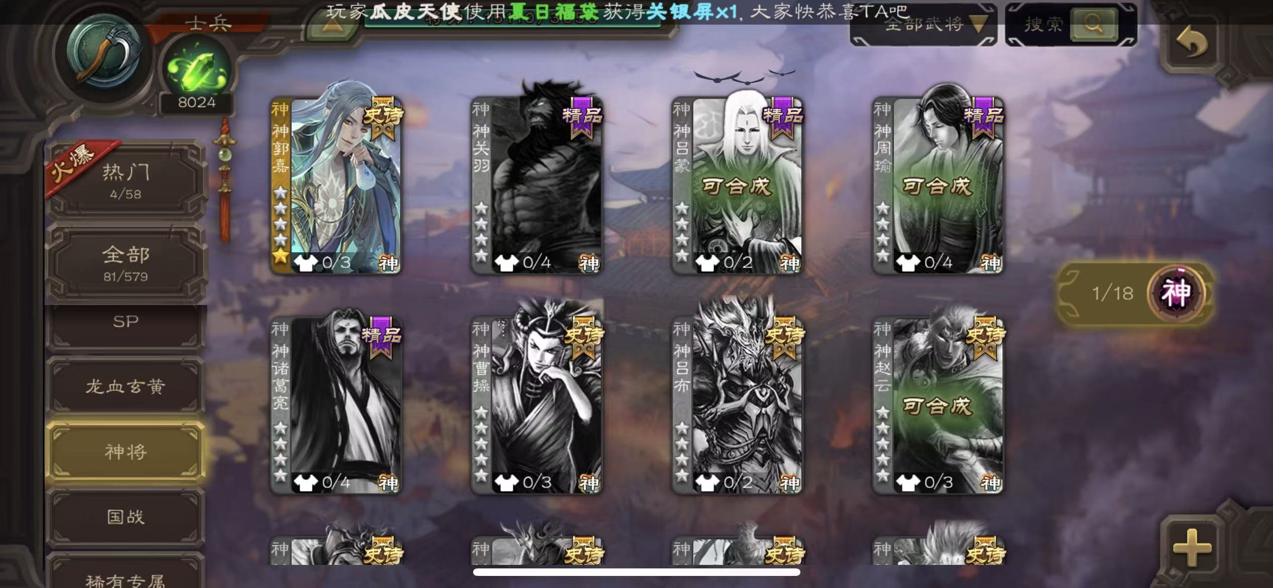 商品描述:士兵神郭嘉56宝珠(可换动态势邓艾)7.26万羽毛8000将魂203雁翎甲138招募令三卡4500菜篮子