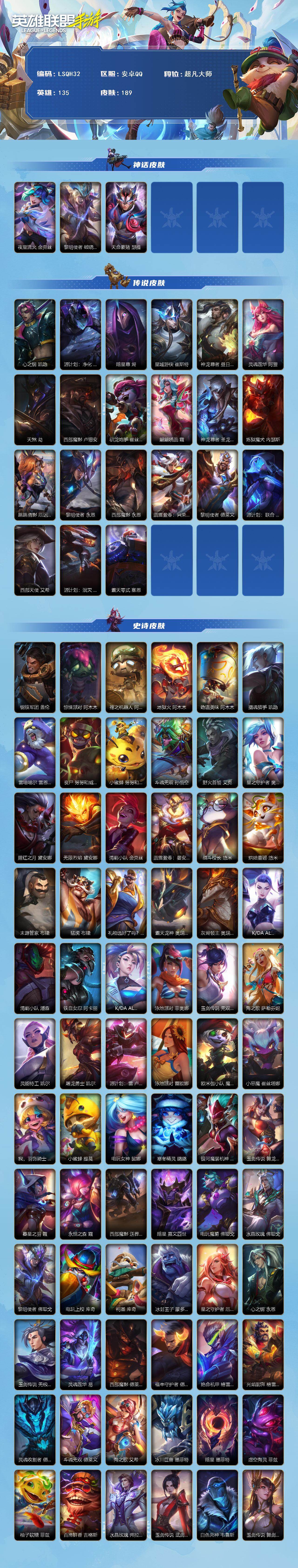 商品描述:【LSQH32】135英雄/189皮肤/2神话/21传说/97史诗/超凡大师/夜星流火 金克丝/黎明使者 破晓之殇 佛耶戈/天命豪赌 瑟提/心之钢 凯隐/源计划:净化 薇恩/暗星尊 烬/星域游侠 崔斯特/神龙尊者 昼日真龙 亚索/灵魂莲华 阿狸/天煞 劫/西部魔影 卢锡安/驯龙炮手 崔丝塔娜/翩翩绣蕊 霞/神龙尊者 圣龙 李青/炼狱魔犬 内瑟斯/跳跳倩影 厄运小姐/黎明使者 永恩/西部魔影 永恩/蕊雪盈春:兴荣 永恩/黎明使者 德莱文/源计划:联合 艾希/西部天使 艾希/源计划:泯灭 雷克顿/霸天零式 赛恩/钢铁军团 盖伦/惊悚派对 阿木木/殇之机器人 阿木木/地狱火 阿木木/劲道美味 阿木