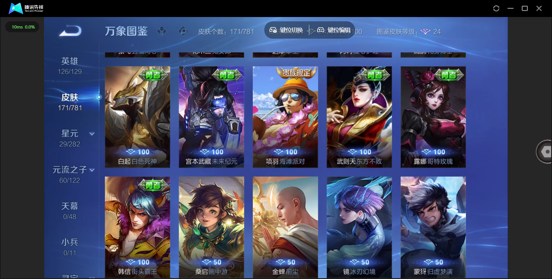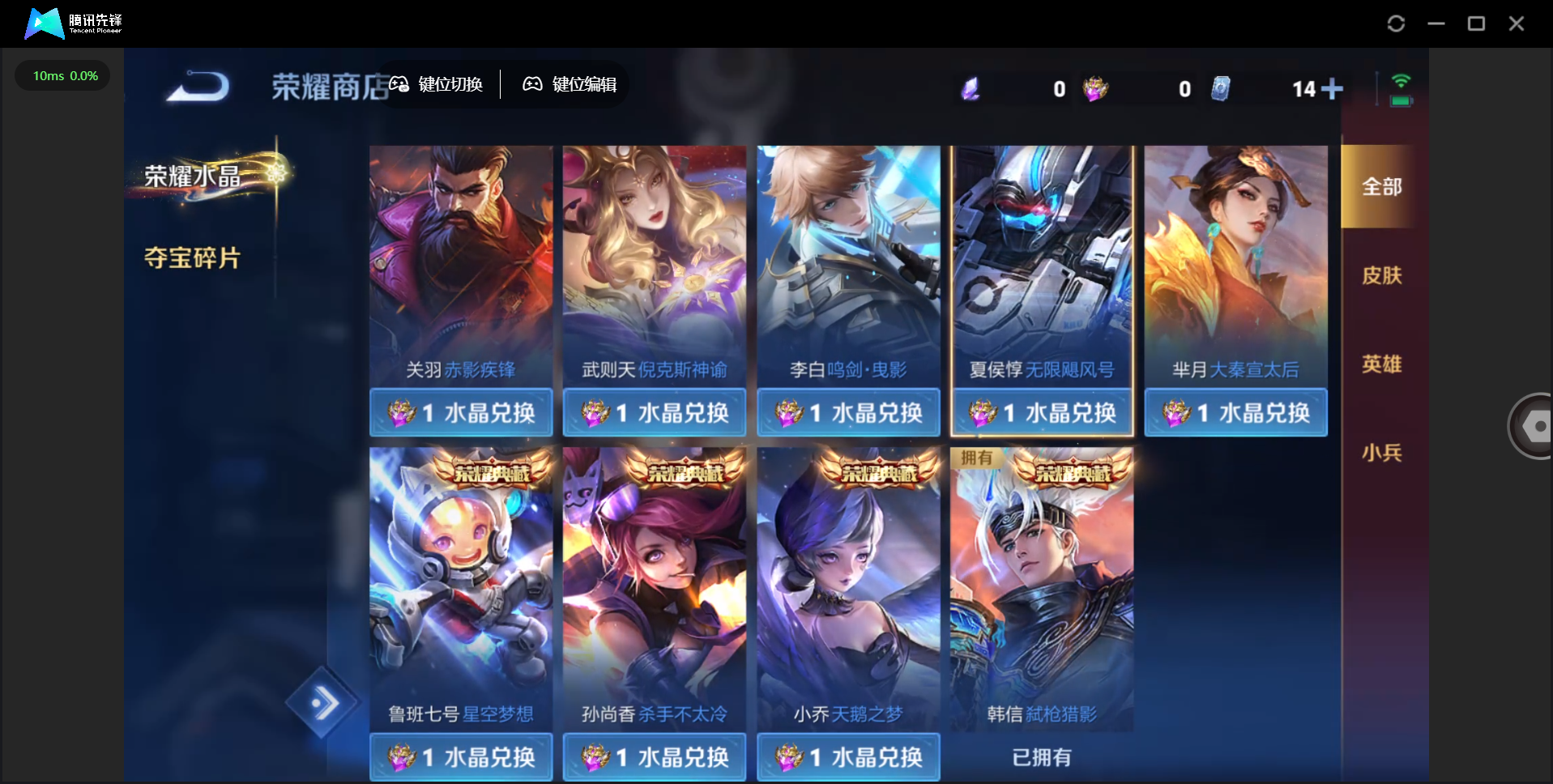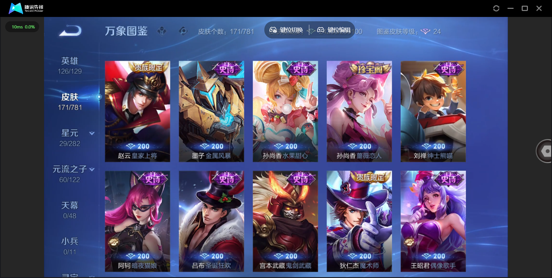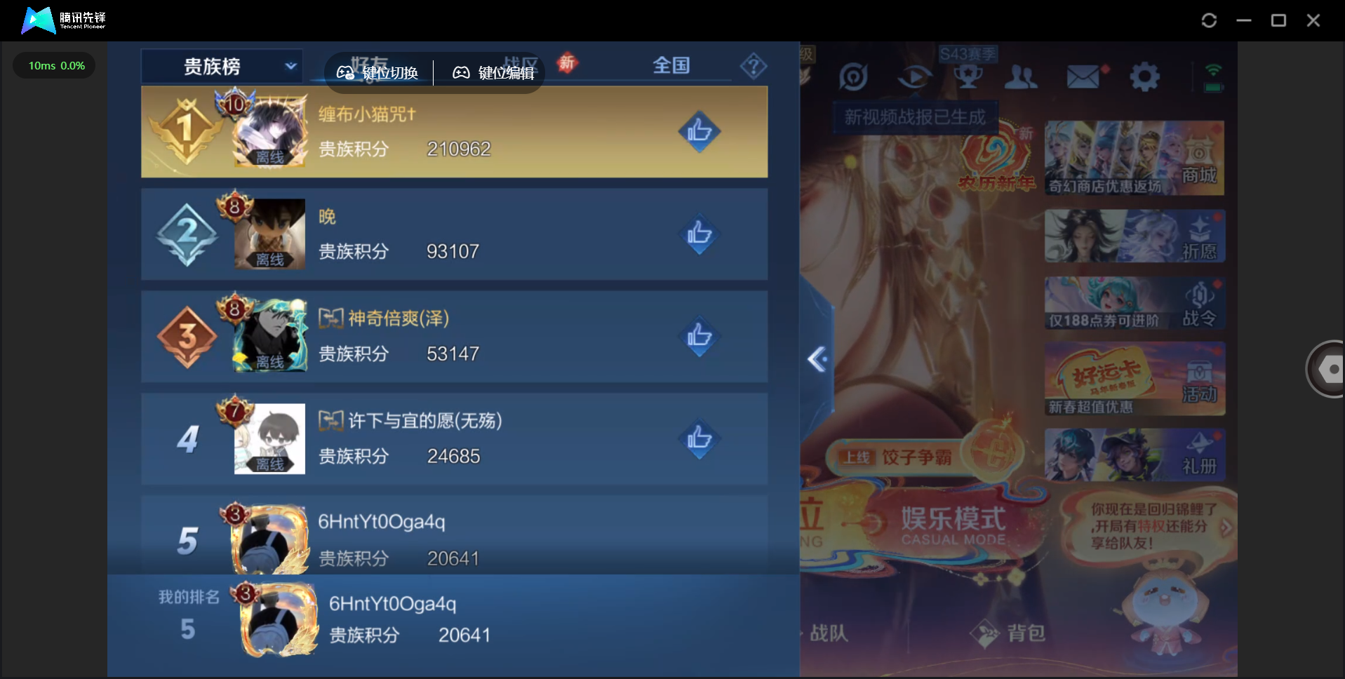 【QQ(安卓)】贵族0-贵族积分0万-0英雄-0皮肤 【抢先服】2万金币+回归150级铭文+改名卡