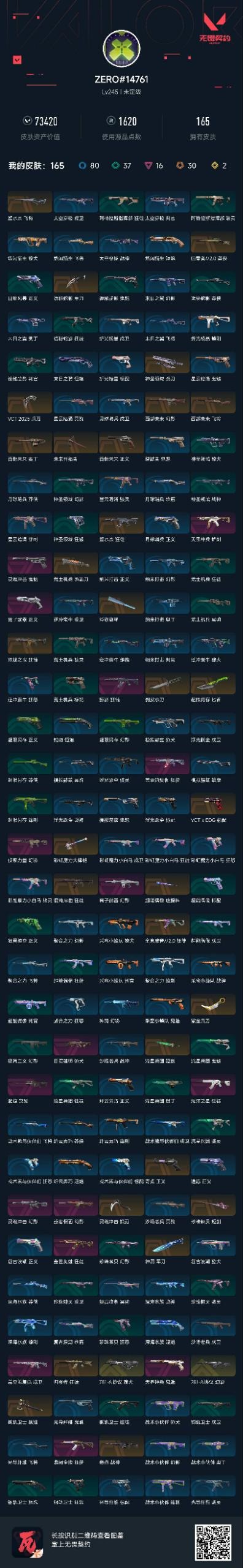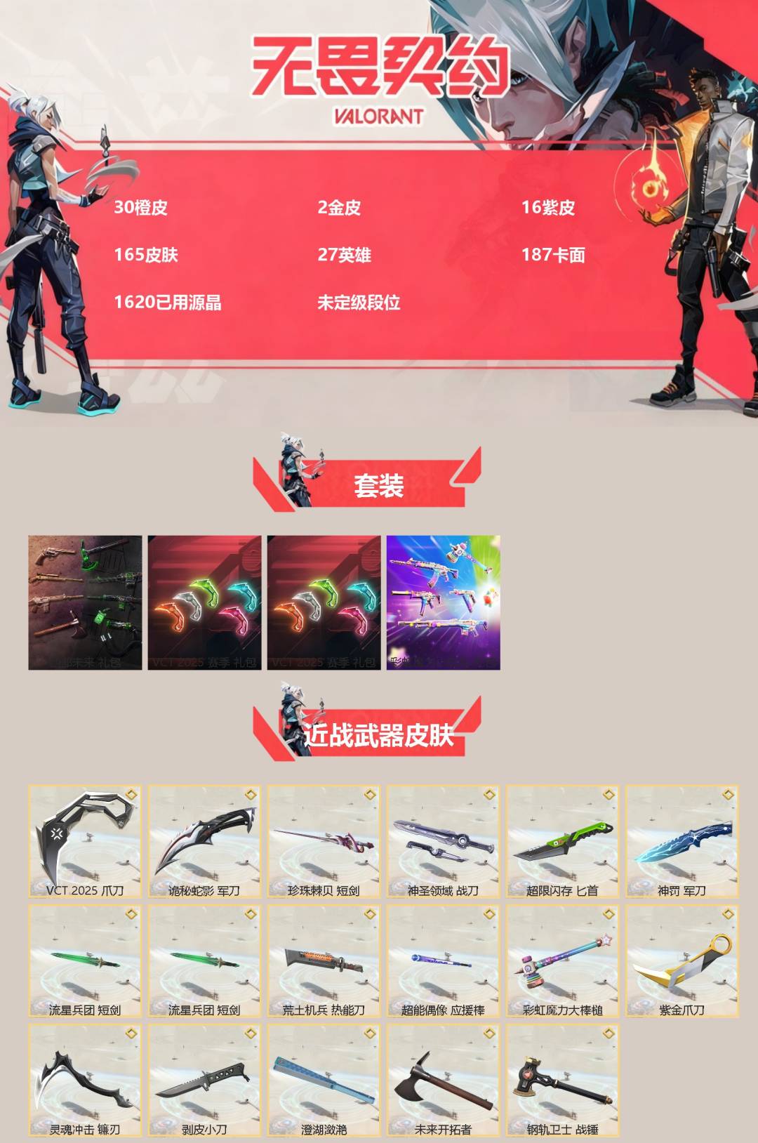 商品描述:[13705990]30橙皮 2金皮 16紫皮 165皮肤 27英雄 187卡面 1620已用源晶 未定级段位 【套装】:彩虹魔力小白马套装,VCT 2025赛季礼包,西部未来,VCN2025套装 【近战武器皮肤】:神圣领域 战刀,未来开拓者,VCT 2025 爪刀,诡秘蛇影,短剑-流星兵团,匕首-超限闪存,战锤-钢轨卫士,彩虹魔力大棒槌,荒土机兵热能刀,剥皮小刀,紫金爪刀,短剑-珍珠棘贝,澄湖潋滟,镰刃-灵魂冲击,超能偶像 应援棒,军刀-神罚 【佩枪皮肤】:正义-西部未来,正义-奇点,正义-离子武器,鬼魅-灵魂冲击,鬼魅-天界神兵,标配-VCTxEDG 【冲锋枪皮肤】:蜂刺-天界神兵 【步枪皮肤】:狂徒-双城之战,狂徒-掠影,狂徒-混沌序曲,幻影-西部未来,狂徒-紫阙金琅,狂徒-海洋之星,狂徒-盖亚的复仇,狂徒-塑水宗,狂徒-归零者,狂徒-全息波普//2.0,狂徒-盖世英雄,幻影-781-A协议,幻影-侦察力量,幻影-灵魂冲击,幻影-般若假面,幻影-离子武器,戍卫-盖亚的复仇,獠犬-781-A协议,獠犬-日冕雄师 【狙击枪皮肤】:莽侠-归零者//2.0,飞将-西部未来,飞将-塑水宗,冥驹-起源 【机枪皮肤】:战神-奇点,奥丁-西部未来 【挂饰】:超能偶像挂饰,幸运星挂饰,薰衣草之心挂饰,西部未来挂饰,袖珍捷风挂饰,超兽队烈火兔挂饰,超兽队黑曜熊挂饰,超兽队海员丹挂饰,传世莲华挂饰,超兽队穿林闪挂饰,鱼骨头挂饰,双城之战小蛋糕挂饰,双城之战魄罗挂饰,神中神挂饰,超兽队大黄鸭挂饰,V25第三幕神话挂饰,第九季超凡挂饰,第八季超凡挂饰,VCT2025EMEA联赛挂饰,改变者全球冠军赛奖杯挂饰,VCT2025太平洋联赛挂饰,VCT2025美洲联赛挂饰,VCT2025CN联赛挂饰,2021冠军巡回赛花火挂饰,糖葫芦挂饰,蓄势待滚挂饰,云开见日挂饰,迷你机甲挂饰,VCTxEDG挂饰,终章KO小金人挂饰,爆能器挂饰