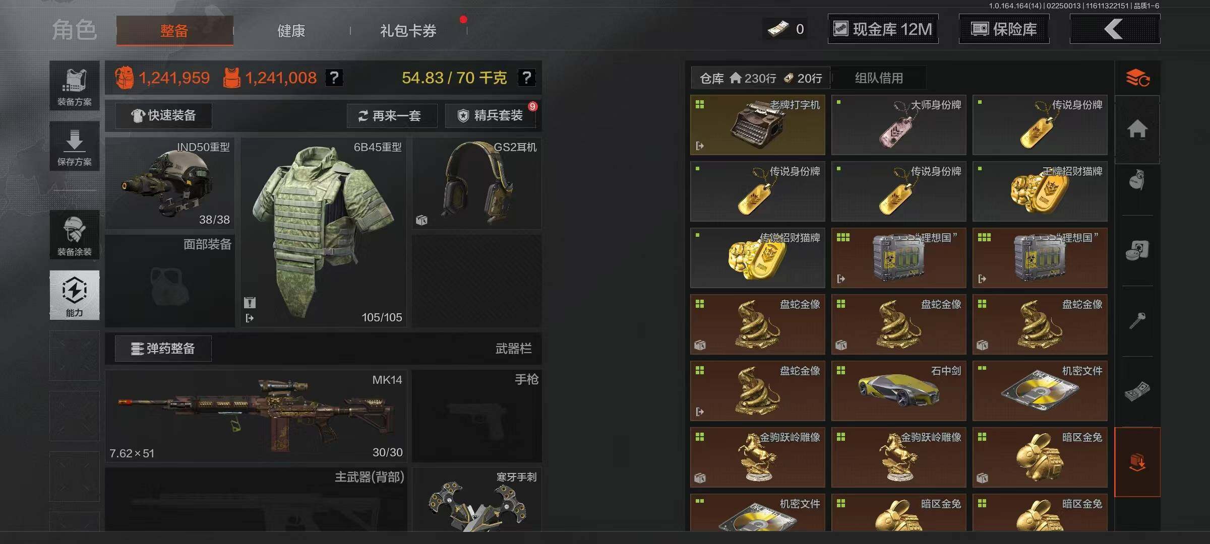 【AQZG1462】等级:30/段位:暗区传说/仓库价值(百万):48/柯恩币:12144488/苍白之触手套/工兵铲/赤火炉心/急袭弯刀/百炼恒常/热能武器补牢/寒牙手刺/下弦月/勇士战斧/林中人特遣作战服/深潜行者II/冥河/苍白隐者伪装服/白蔷薇斯黛拉/弗雷德/蝮蛇/竞技风潮M4A1/午夜梦魇FAL/赤帽要塞AR57/旗帜AEK/百锻铁骑AEK/玉擎天工AN94/旧王圣谕QBZ191/玉擎天工MP5/骑士之剑VSS/旧王圣谕VSS/千炼铁阵MK14/骑士之剑AX50/近卫荣誉RPK16/长夜千军武将/清影/冲刺极限QBZ192