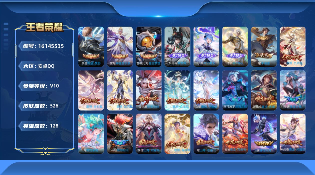 营地号349226875-【QQ(安卓)】贵族9-贵族积分10万-129英雄-299皮肤-203铭文安卓QQ/永恒钻石/299皮肤/129英雄/4典藏/0珍品无双/1无双/2珍品传说/18传说/90史诗/10稀有英雄 【2 珍品传说】怪盗基德 马可波罗,江户川柯南 鲁班七号, 【4 典藏皮肤】鸣剑·曳影 李白,倪克斯神谕 武则天,无限飓风号 夏侯惇,最初的交响 伽罗, 【1 无双皮肤】器灵·螭龙剑 曜, 【18 传说皮肤】启明星使 虞姬,零号·赤焰 孙悟空,云鹰飞将 曜,凤求凰 李白,遇见胡旋 貂蝉,仲夏夜之梦 貂蝉,地狱之眼 宫本武藏,祈雪灵祝 公孙离,时雨天司 诸葛亮,黄金射手座 后羿,黄金狮子座 达摩,久胜战神 干将莫邪,愿照·九州拓 澜,神树通天 后羿,幻光神枪 云缨,愿照·山河定 司空震,愿照·岁时盈 虞姬,鸣野蒿 桑启, 【90 史诗皮肤】奔雷神使 牛魔,电玩小子 鲁班七号,白昼王子 嬴政,紫霞仙子 露娜,银河之约 李元芳,匿光追影者 镜,云端筑梦师 庄周,暗影游猎 马可波罗,冰霜恋舞曲 干将莫邪,德古拉伯爵 刘邦,心灵战警 亚瑟,五谷丰年 鬼谷子,鬼剑武藏 宫本武藏,百相守梦 黄忠,星夜王子 白起,寅虎·心曲 杨玉环,无限星赏官 公孙离,遇见飞天 杨玉环,摇滚巨星 嬴政,冰锋战神 关羽,修罗 橘右京,拒霜思 嫦娥,魅力维加斯 妲己,乐园奇幻夜 钟馗,偶像歌手 王昭君,女仆咖啡 妲己,白蛇 大乔,舞动绿茵 蔡文姬,繁星吟游 蔡文姬,暗夜贵公子 嬴政,鹰眼统帅 狄仁杰,胡桃异想国 米莱狄,大圣娶亲 孙悟空,李小龙 裴擒虎,纤云弄巧 云中君,金属风暴 墨子,玄嵩 庄周,特工魅影 百里守约,猫狗日记 孙策,原初追逐者 百里玄策,逐浪之夏 李元芳,未来纪元 赵云,时之彼端 妲己,黎明之约 雅典娜,石田雨龙 后羿,鸭鸭历险记 刘禅,魔术师 狄仁杰,龙之律动 狂铁,唤灵魅影 貂蝉,皇家上将 赵云,冰冠公主 雅典娜,功夫厨神 程咬金,梁祝 上官婉儿,天才门将 刘禅,圣诞恋歌 貂蝉,云间偶戏 元歌,水晶猎龙者 花木兰,一生所爱 露娜,御风骁将 吕布,圣诞狂欢 吕布,魅语 不知火舞,器灵·浮梦炉 赵怀真,地狱岩魂 廉颇,茶境仙 孙膑,冰雪圆舞曲 甄姬,火炮绅士 黄忠,青蛇 小乔,默契交锋 花木兰,月团寄思 沈梦溪,航海奇遇记 老夫子,千年之狐 李白,节奏热浪 阿轲,万灵启世 女娲,心灵骇客 安琪拉,箭羽风息 伽罗,乱世虎臣 张飞,万物之道 弈星,谪仙醉月 李白,绅士熊喵 刘禅,缤纷独角兽 小乔,陌上桑 艾琳,百相守梦 百里守约,蓝屏警告 典韦,真爱魔法 干将莫邪,水果甜心 孙尚香,狂想玩偶喵 蒙犽,化蝶舞 阿轲,幽灵船长 曹操,乘风破浪 夏侯惇,暗隐猎兽者 兰陵王