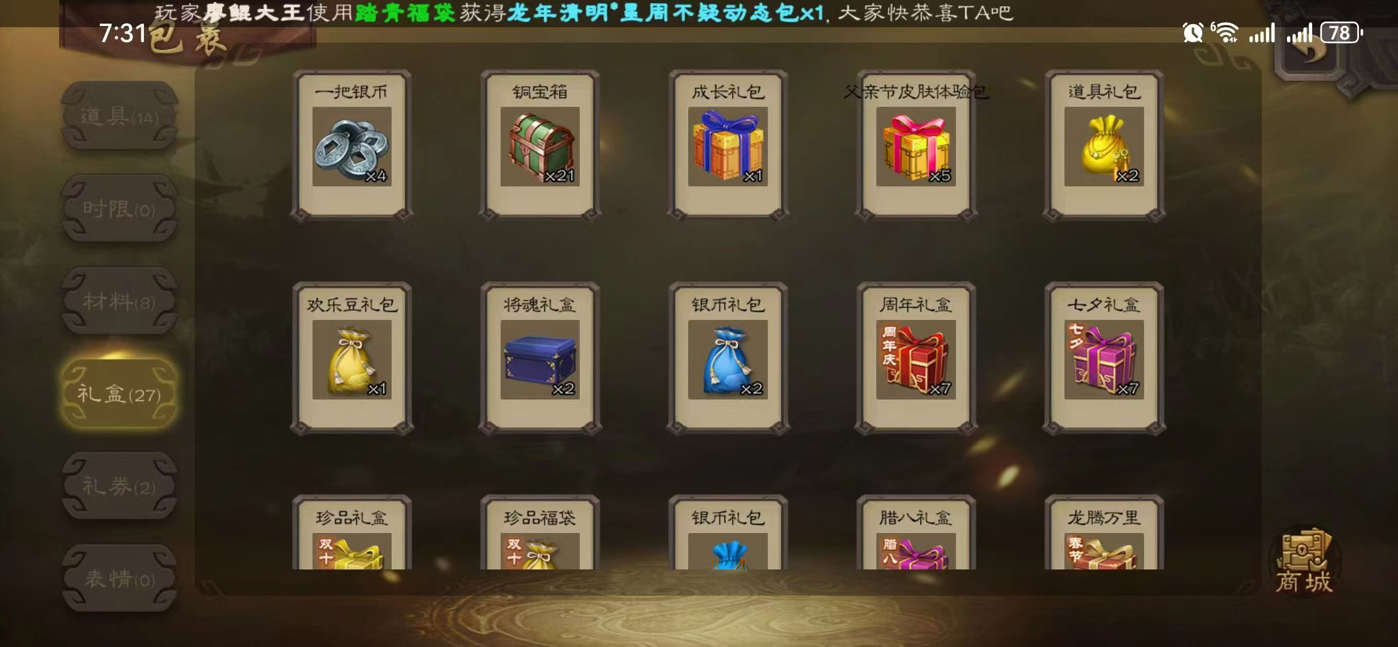 商品描述:2万元宝500左右大盒子