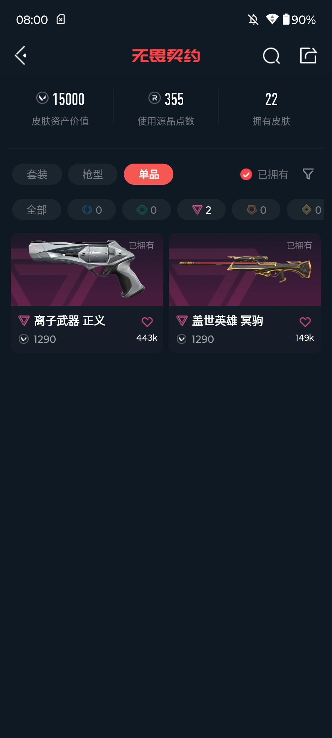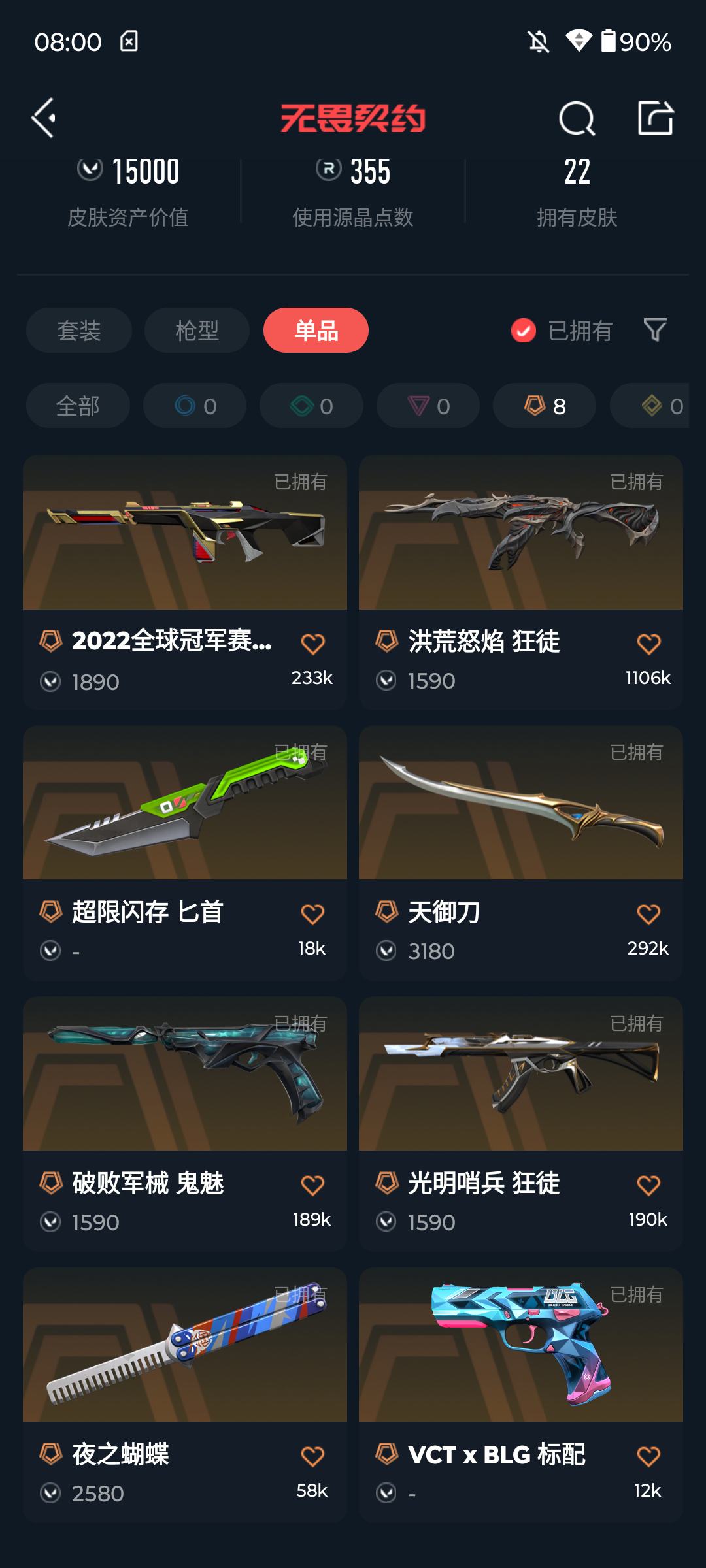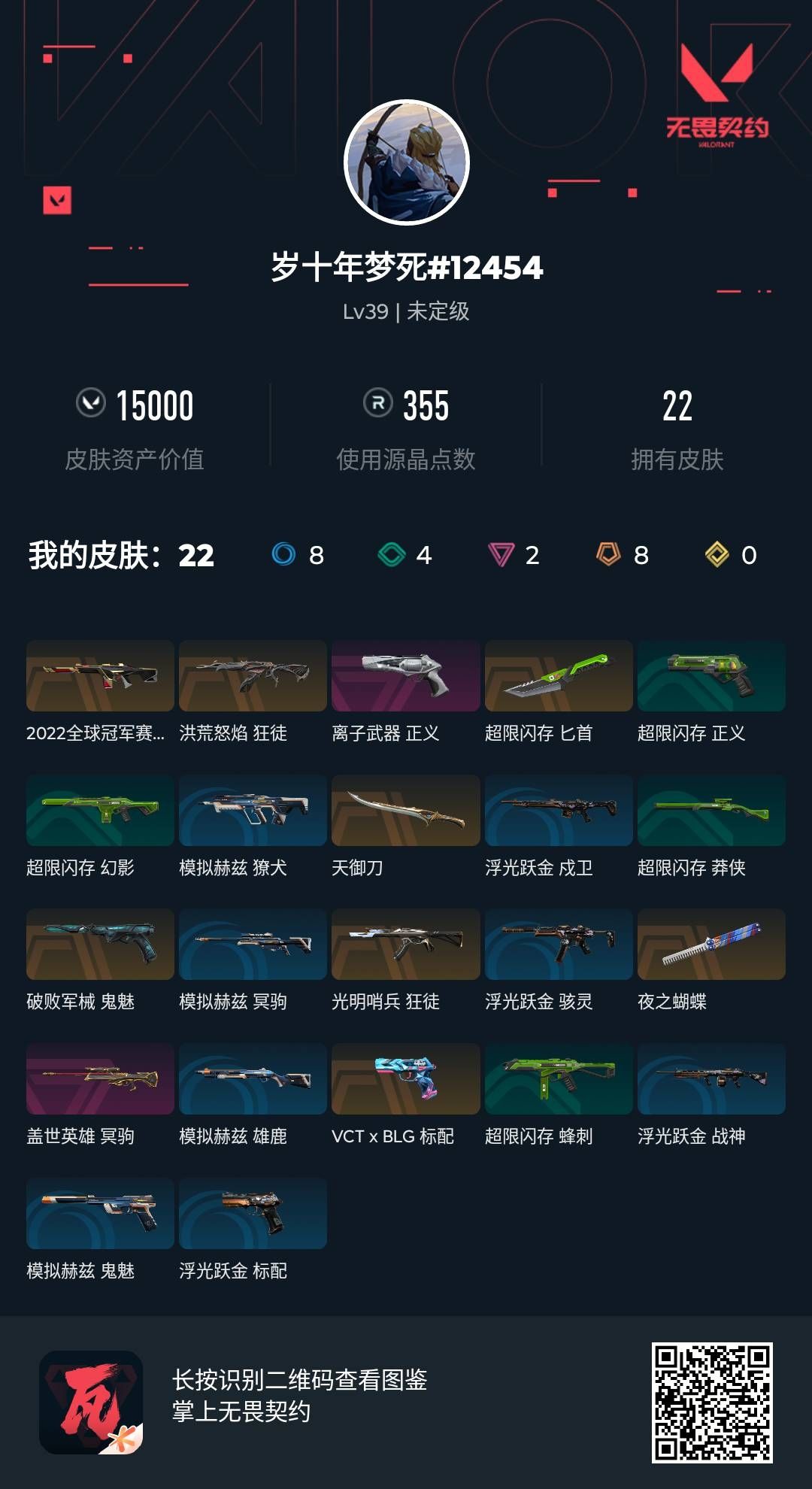 [13706220]Q191850 无畏契约/38等级/未定级段位/16英雄/22皮肤/资产15000/已使用R点355/剩余R点5/2022全球冠军赛-幻影,光明哨兵-狂徒,洪荒怒焰-狂徒,超限闪存-匕首,天御刀,夜之蝴蝶,盖世英雄-冥驹,VCT-x-BLG-标配,破败军械-鬼魅,离子武器-正义