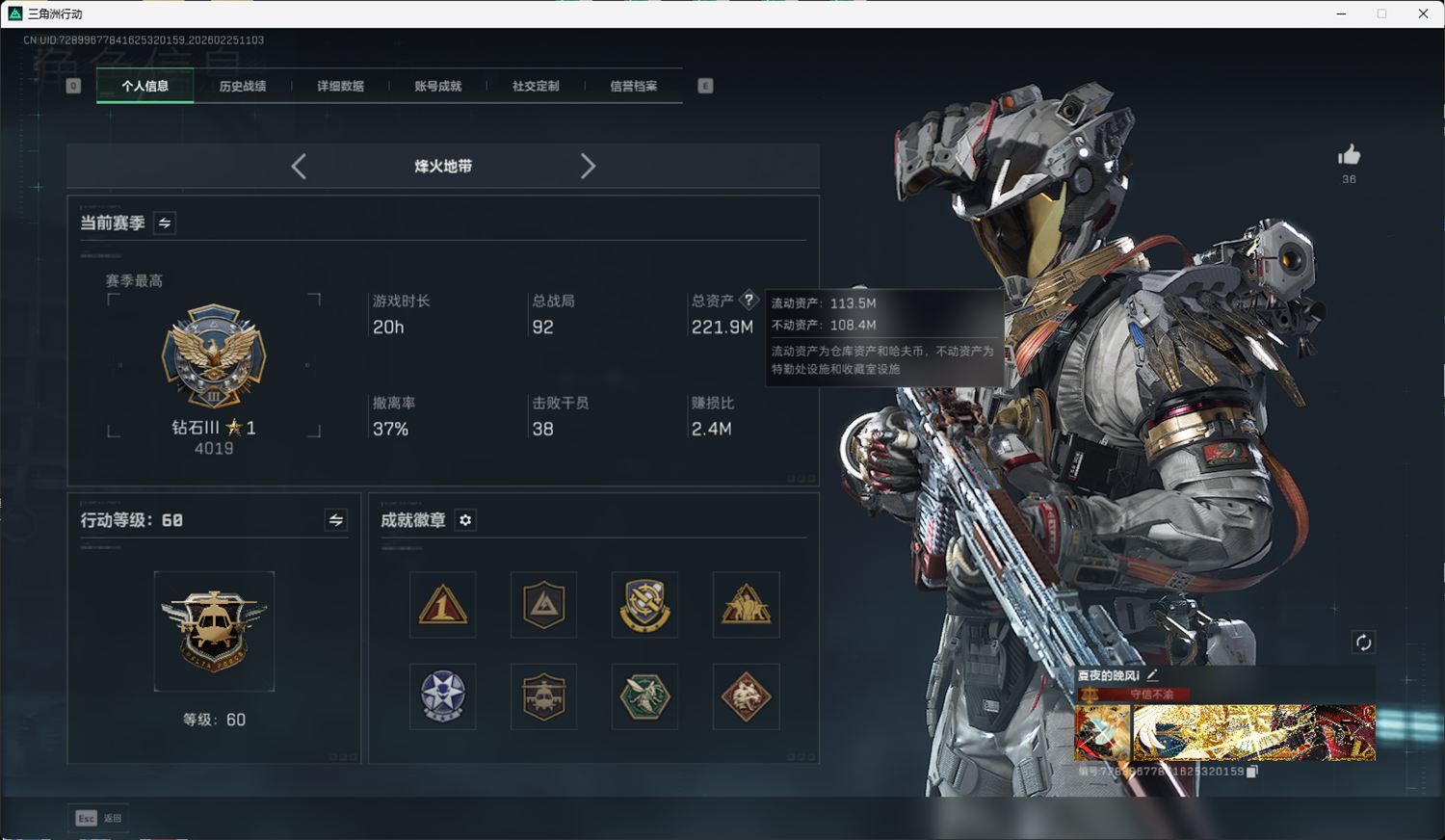 N6449/哈夫币/16270W/武器皮肤175/烽火60级/黑鹰Ⅲ/战场/暂无段位/【货币】40三角币/250三角卷/【安全箱】进阶安全箱/【特勤处等级】仓库LV.7/靶场LV.5/训练中心LV.7/【捆绑包6】北极星捆绑包/鹅鸭杀捆绑包/蚀金玫瑰捆绑包/特斯拉线圈捆绑包/捞点薯条捆绑包/蝮蛇捆绑包/【干员皮肤3】红狼蚀金玫瑰/蜂医送葬人无题密令/露娜金牌射手/【近战皮肤】近战武器-北极星/近战武器-黑鹰/【步枪皮肤】M4A1突击步枪-阿米娅/M4A1突击步枪-蚀金玫瑰/ASh-12战斗步枪-鹅鸭杀/SG552突击步枪-运动员/AK-12突击步枪-特斯拉线圈/SCAR-H战斗步枪-启航/G3战斗步枪-骑士/CAR-15突击步枪-阿米娅/腾龙突击步枪-捞点薯条/K437突击步枪-北极星/AUG突击步枪-蝮蛇/M7战斗步枪-百步穿杨/SG552突击步枪-哈夫克警备/SCAR-H战斗步枪-囚徒/G3战斗步枪-流沙送葬/PTR-32突击步枪-OldHabits/ASVal突击步枪-典狱官/ASVal突击步枪-百步穿杨/腾龙突击步枪-无垢/【冲锋枪皮肤】UZI冲锋枪-特斯拉线圈/SR-3M紧凑突击步枪-特斯拉线圈/勇士冲锋枪-能天使-午夜邮差/QCQ171冲锋枪-北极星/QCQ171冲锋枪-鹅鸭杀/MP5冲锋枪-战术竞备/MP5冲锋枪-竞技风/P90冲锋枪-紧急戒备/Vector冲锋枪-百步穿杨/SR-3M紧凑突击步枪-荒野求生/SR-3M紧凑突击步枪-战术竞备/勇士冲锋枪-工业狂潮/MP7冲锋枪-无垢/MP7冲锋枪-守护者/【射手步枪皮肤】SVD狙击步枪-荒野求生/M14射手步枪-工业狂潮/PSG-1射手步枪-无垢/【狙击步枪皮肤】AWM狙击步枪-捞点薯条/SV-98狙击步枪-林中猎手/SV-98狙击步枪-囚徒/SV-98狙击步枪-猎鳄行动/M700狙击步枪-竞技风/M700狙击步枪-蝮蛇/M700狙击步枪-百步穿杨/AWM狙击步枪-无极限/AWM狙击步枪-流沙送葬/【霰弹枪皮肤】725双管霰弹枪-送葬人-无题密令/【轻机枪皮肤】M250通用机枪-骑士之心/QJB201轻机枪-鹅鸭杀/PKM通用机枪-蝮蛇/PKM通用机枪-荒野求生/M250通用机枪-囚徒/QJB201轻机枪-OldHabits/【手枪皮肤】93R-捞点薯条/沙漠之鹰-曙光/【复合弓皮肤】复合弓-黑-天际线/复合弓-守护者/【挂饰20】赤霄游龙/挂饰-蚀金玫瑰/挂饰-黑/挂饰-北极星/挂饰-龙门币/挂饰-特斯拉线圈/挂饰-阿米娅/挂饰-来点薯条/挂饰-晶石幻想/挂饰-大白鹅/挂饰-启程/挂饰-雪人/阿萨拉狙击兵/阿萨拉霰弹兵/诡影狙击兵/诡影喷火兵/暗行哨兵/崩岩重炮/【载具11】轮式突击炮-荣耀/M1A4坦克-哈夫克重工/轮式突击炮-巅峰竞赛/突击直升机-原始伪装/全地形车-森林迷彩/M1A4坦克-护林人/轮式突击炮-护林人/M1A4坦克-烟火2026/突击车-寒梅/轮式突击炮-烟火2026/侦察直升机-烟火2026/找回包赔
