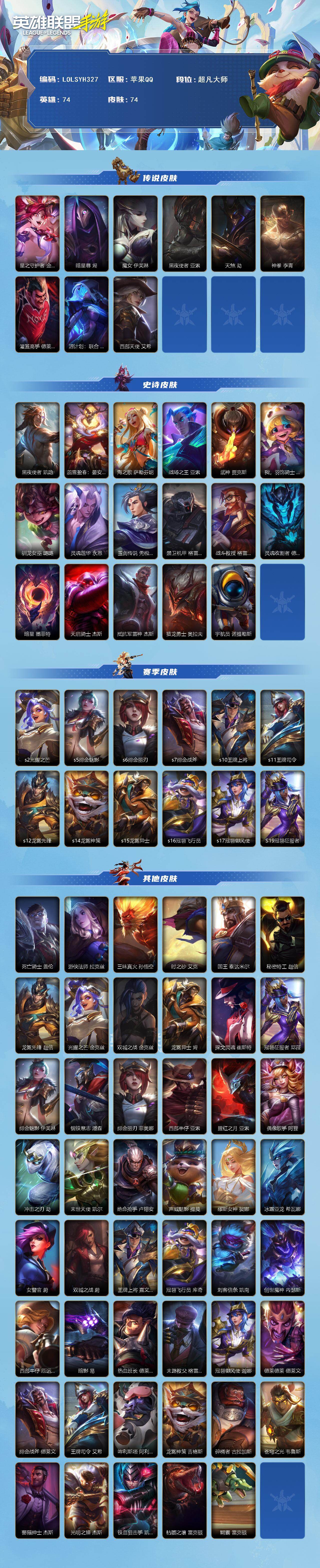 商品描述:【LOLSYH327】74英雄/74皮肤/超凡大师/星之守护者 金克丝/暗星尊 烬/魔女 伊芙琳/黑夜使者 亚索/天煞 劫/神拳 李青/灌篮高手 德莱厄斯/源计划:联合 艾希/西部天使 艾希/黑夜使者 凯隐/蕊雪盈春:晏安 赫卡里姆/海之歌 萨勒芬妮/战场之王 亚索/武神 贾克斯/我,羽饰骑士 崔丝塔娜/驯龙女巫 璐璐/灵魂莲华 永恩/玉剑传说 无极 易/禁卫机甲 格雷福斯/战斗教授 格雷福斯/灵魂收割者 德莱文/暗星 墨菲特/天启骑士 杰斯/抵抗军雷神 杰斯/猎龙勇士 奥拉夫/宇航员 诺提勒斯/s2光耀之芒/s5绯金魅影/s6绯金丽刃/s7绯金战斧/s10王牌上将/s11王牌司令/s12龙